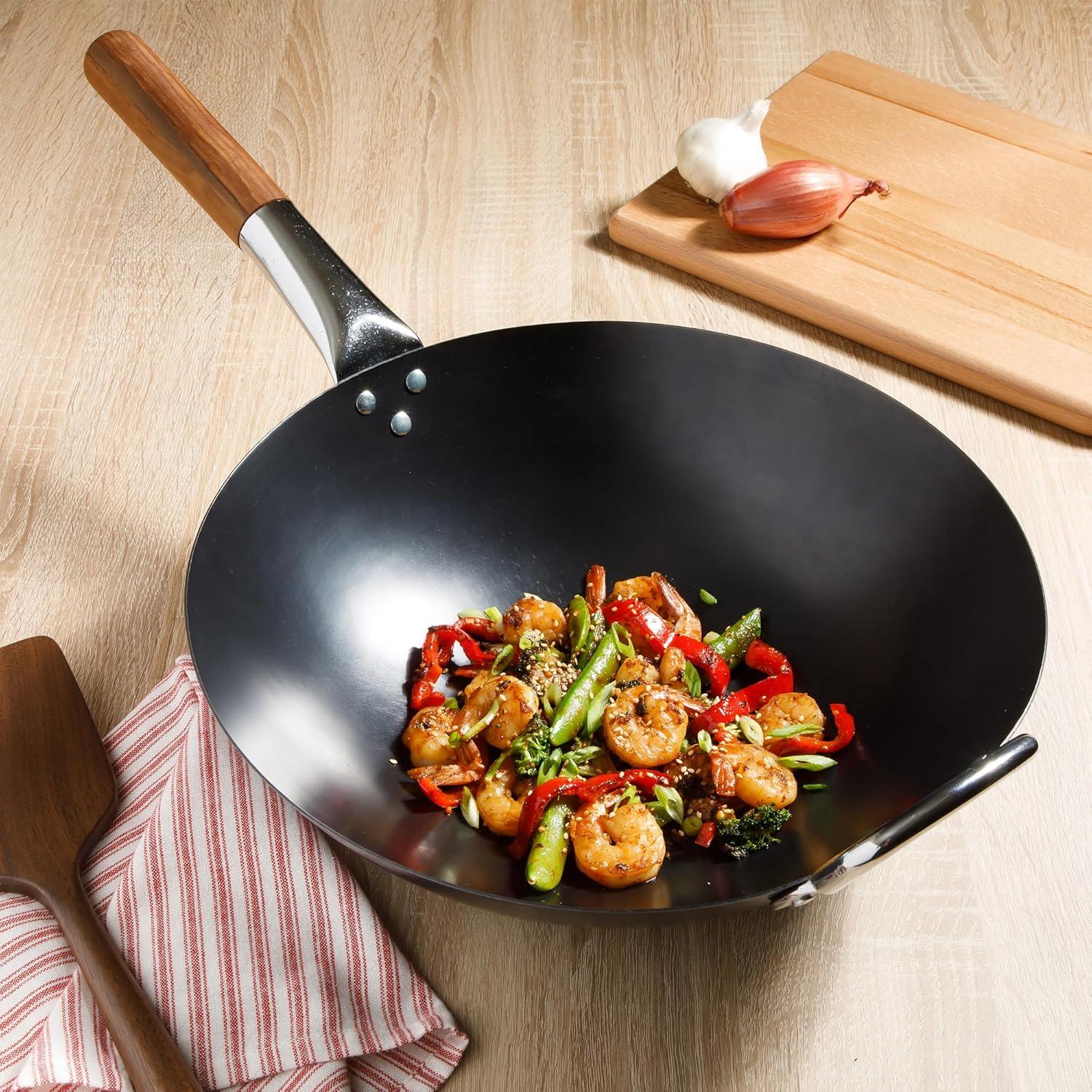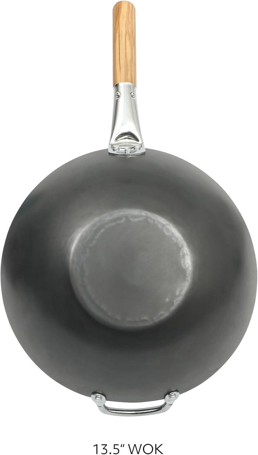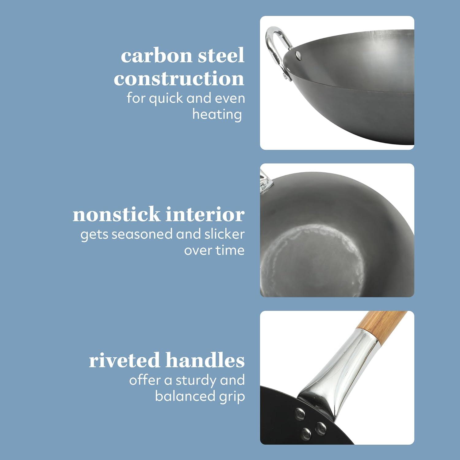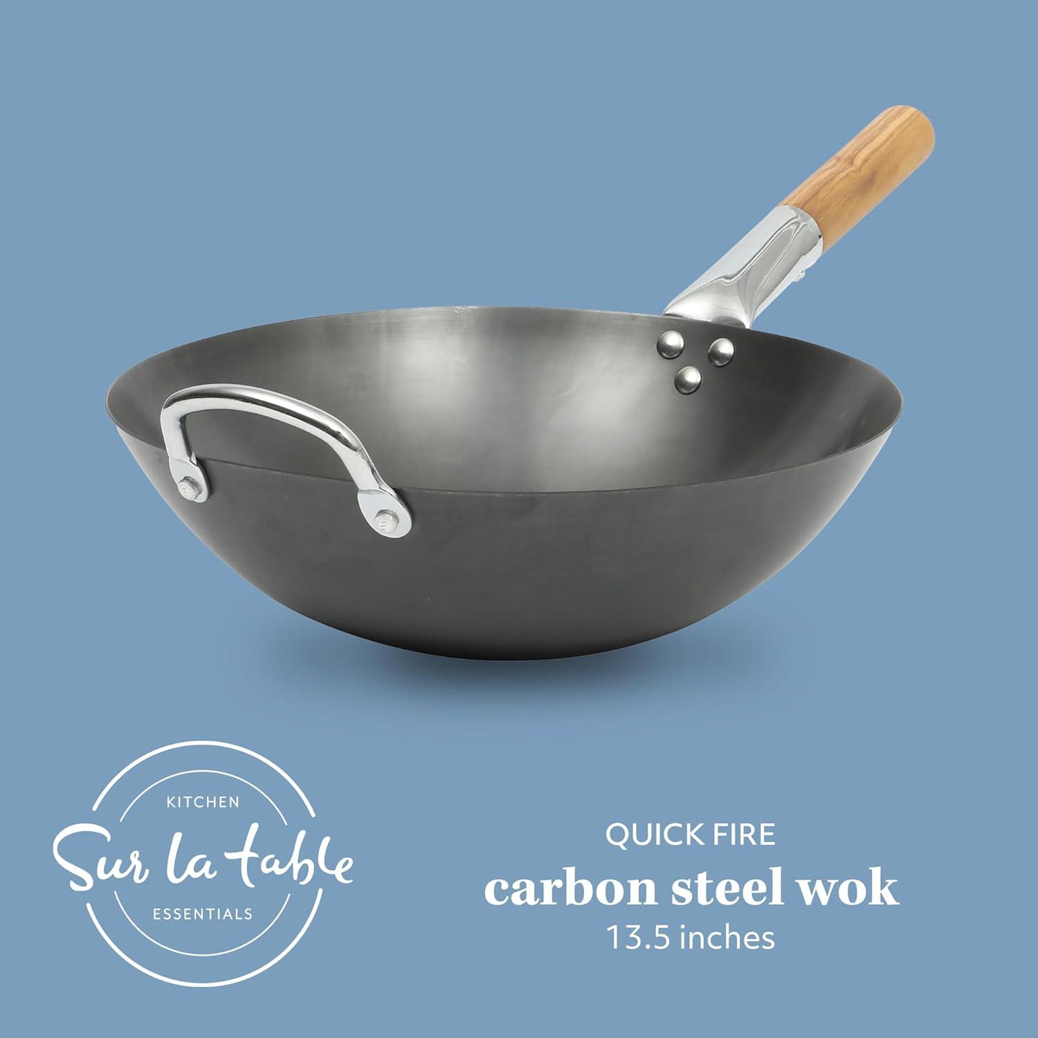 SUR LA TABLE Kitchen Essentials Quick Fire 13.5″ Carbon Steel Flat Bottom Wok – Durable Nonstick Stir Fry Pan