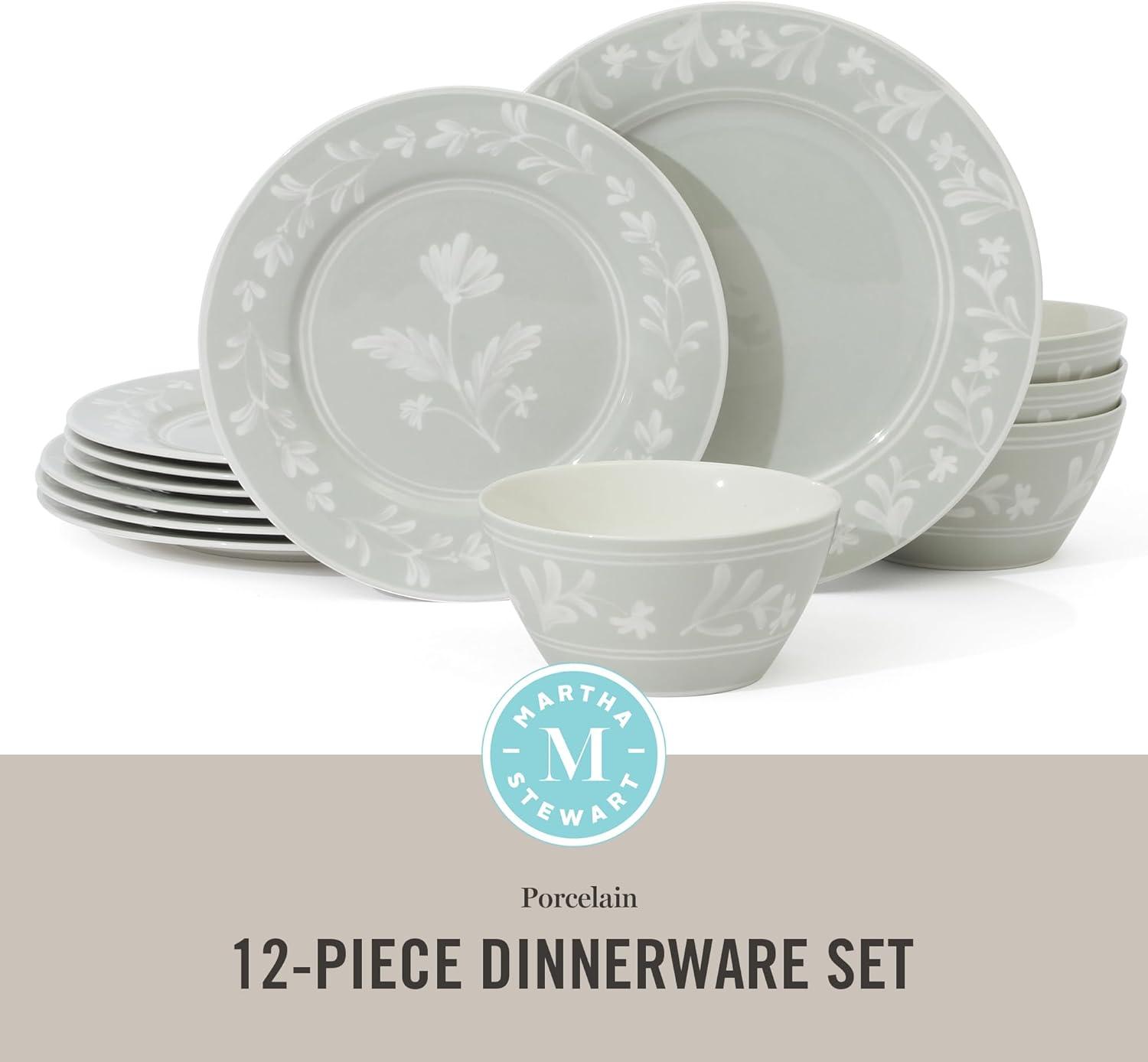 Martha Stewart Peony 12 Piece Porcelain Floral Chip and Scratch Resistant Dinnerware Set(Sage Green)