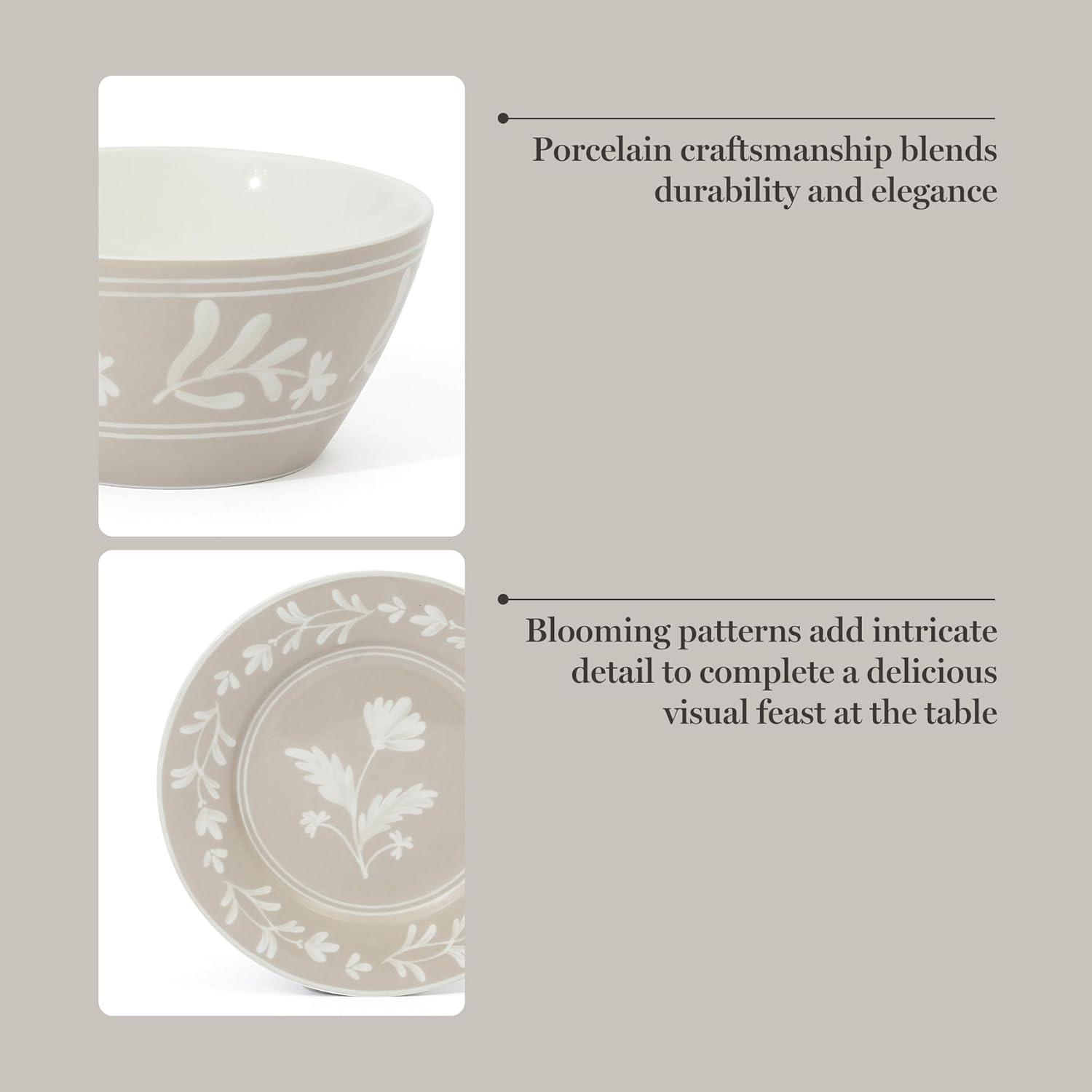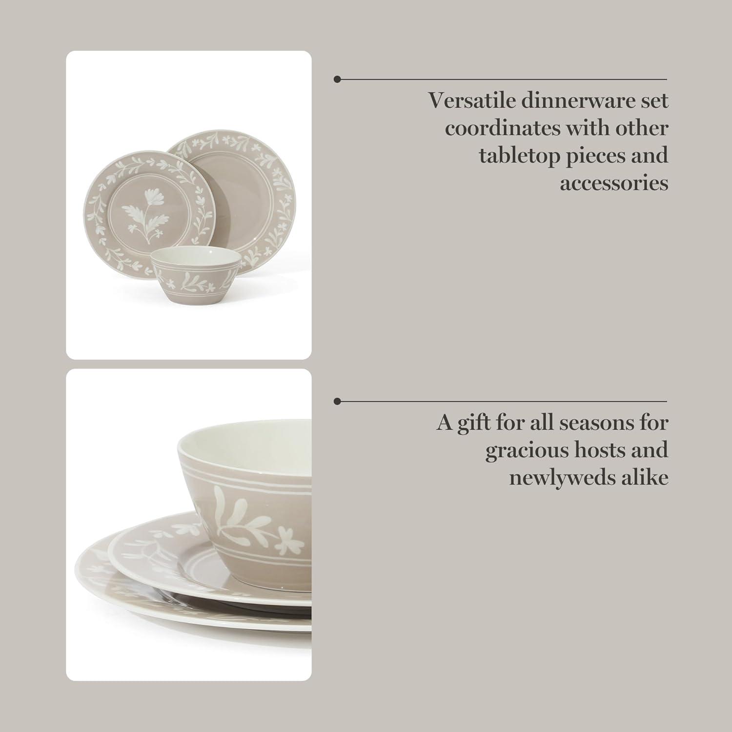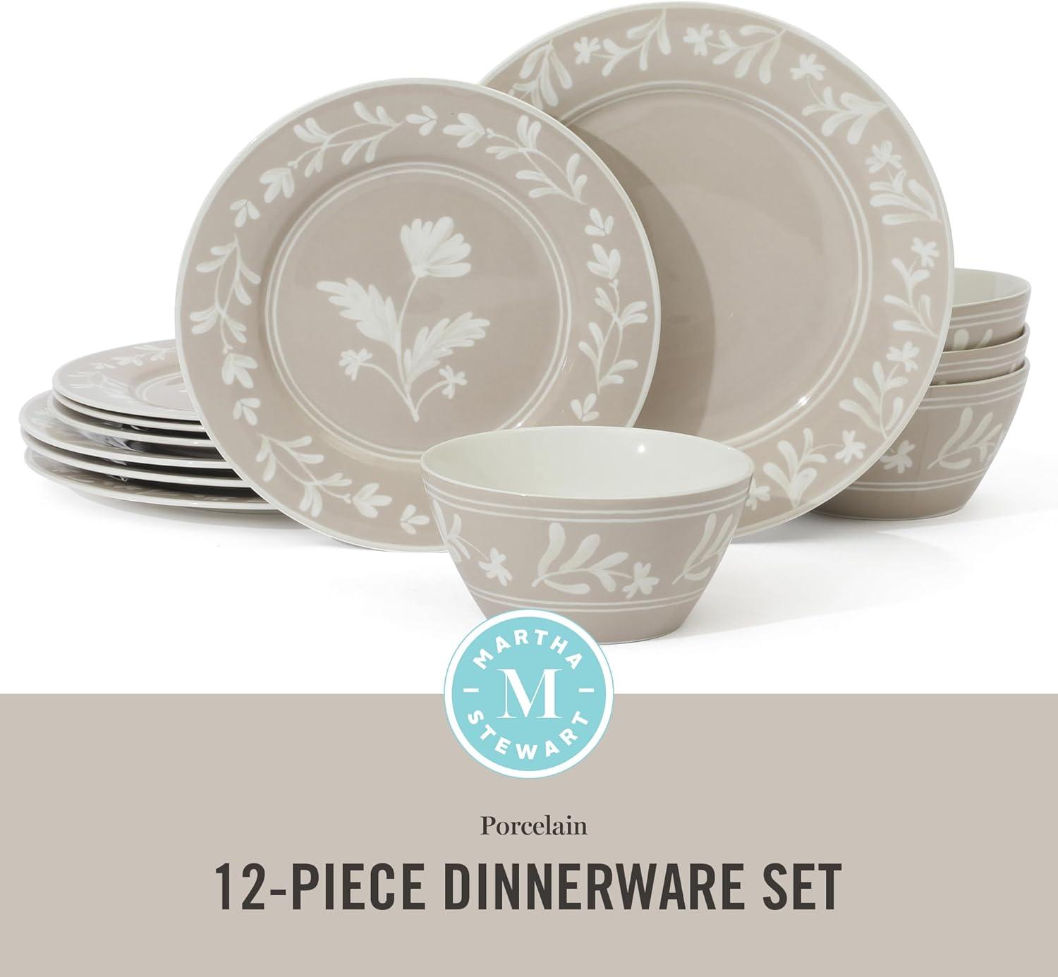 Martha Stewart Peony 12 Piece Porcelain Floral Chip and Scratch Resistant Dinnerware Set(Taupe)