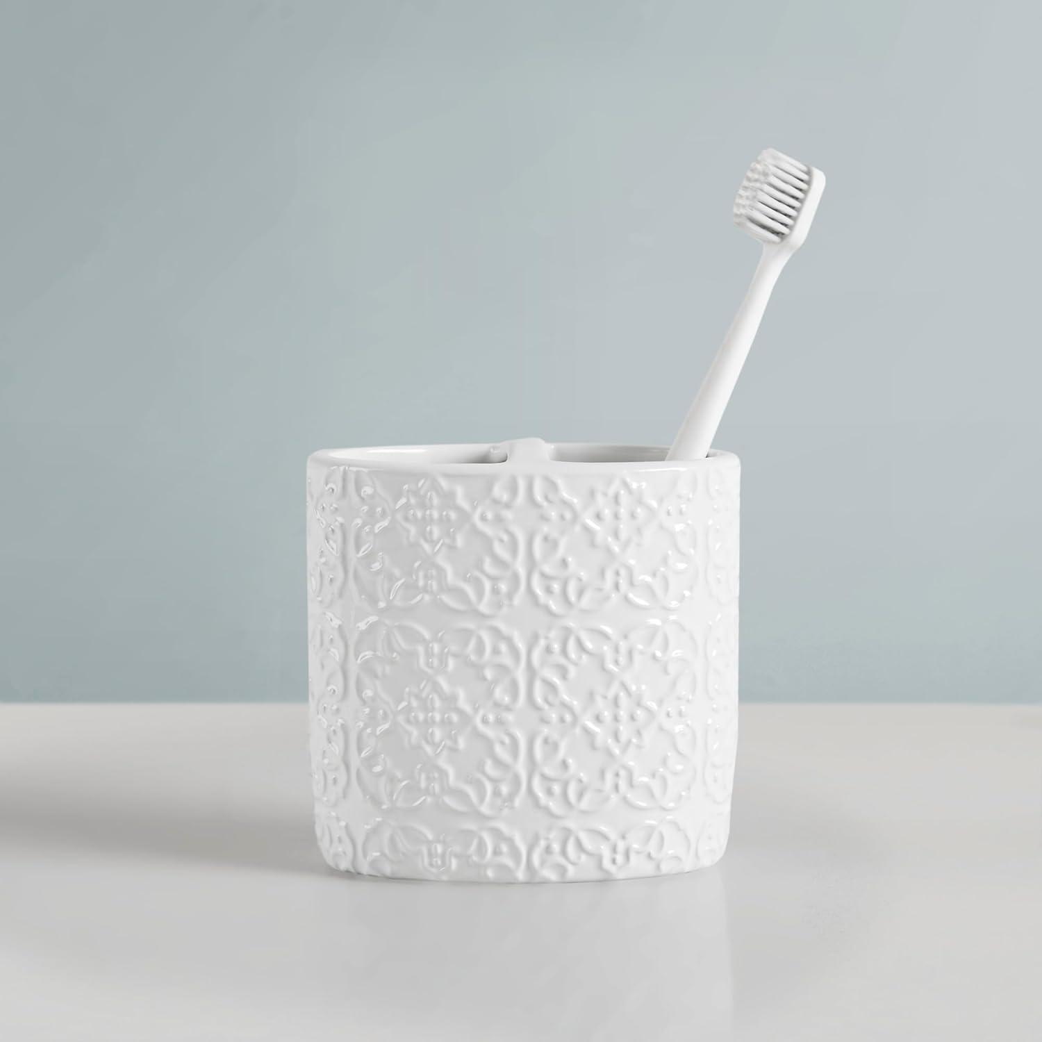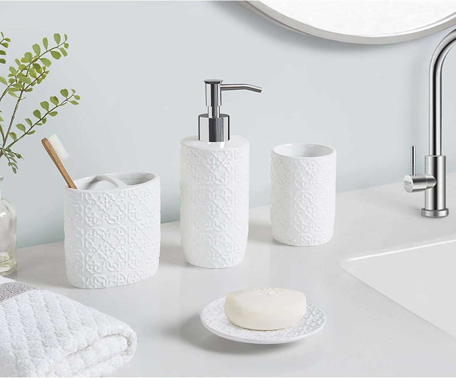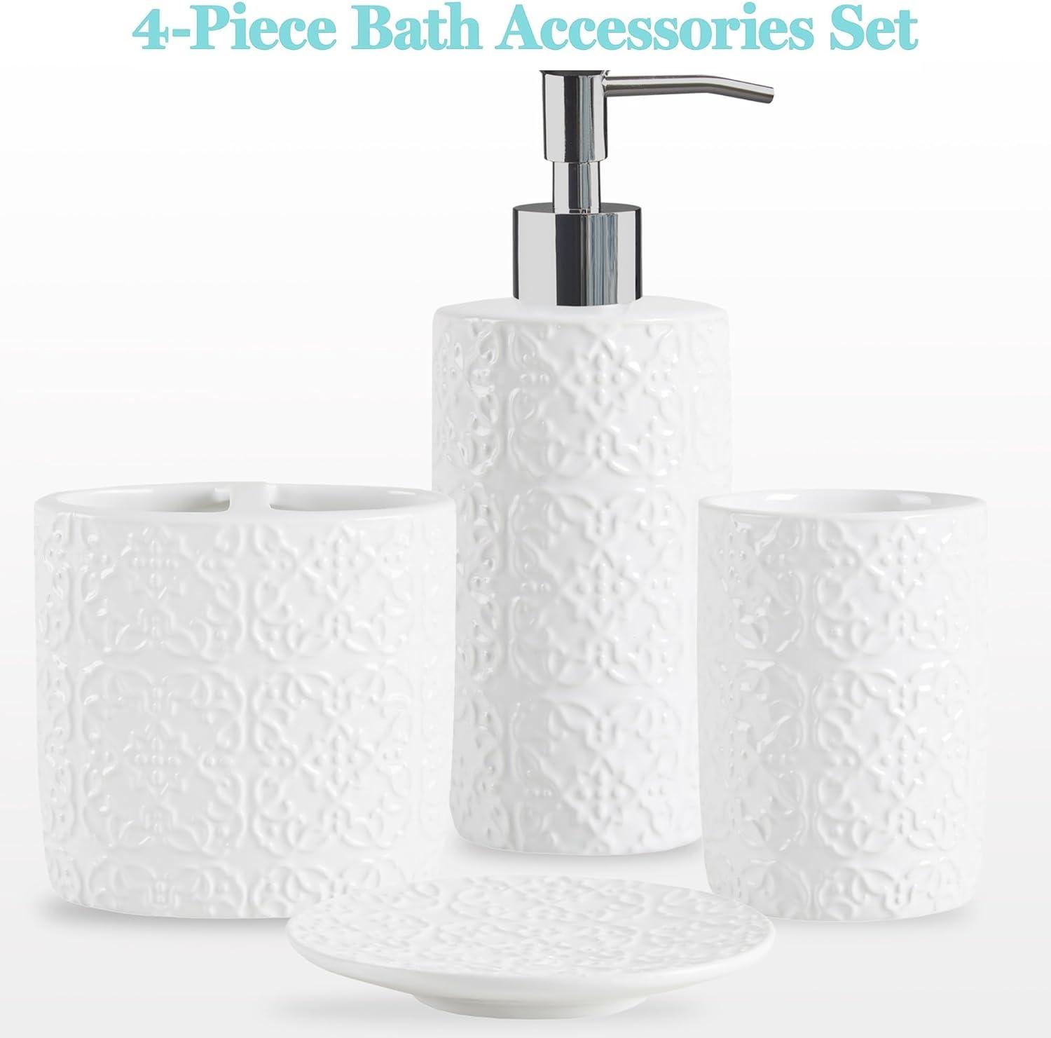 Martha Stewart Ceramic Bathroom Accessories Set, Vanity Decor Storage Organizer, Embossed Damask Medallion, Lotion/Soap Dispenser, Toothbrush Holder, Tumbler, Trinket Dish, Assorted Sizes White(White)