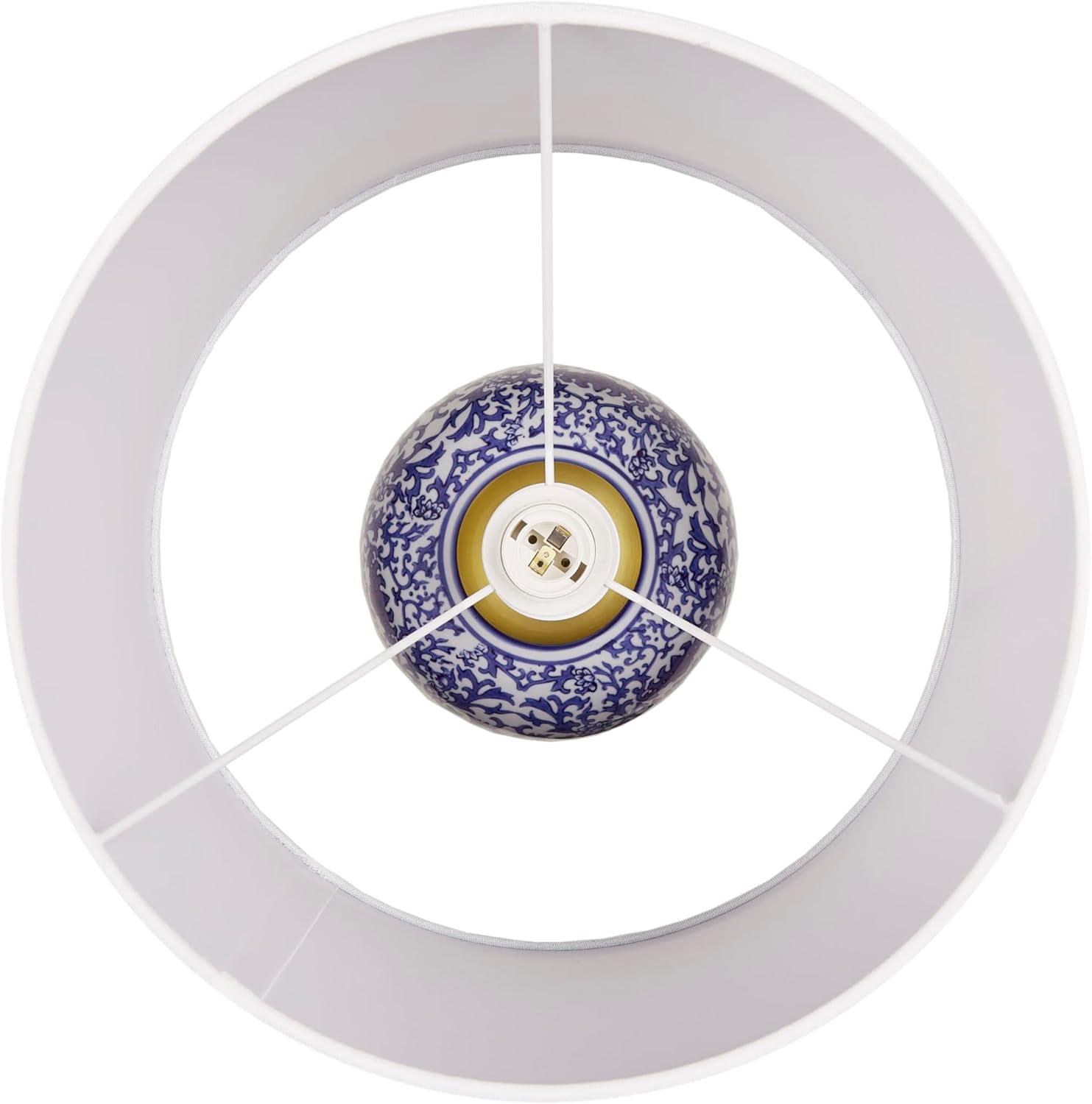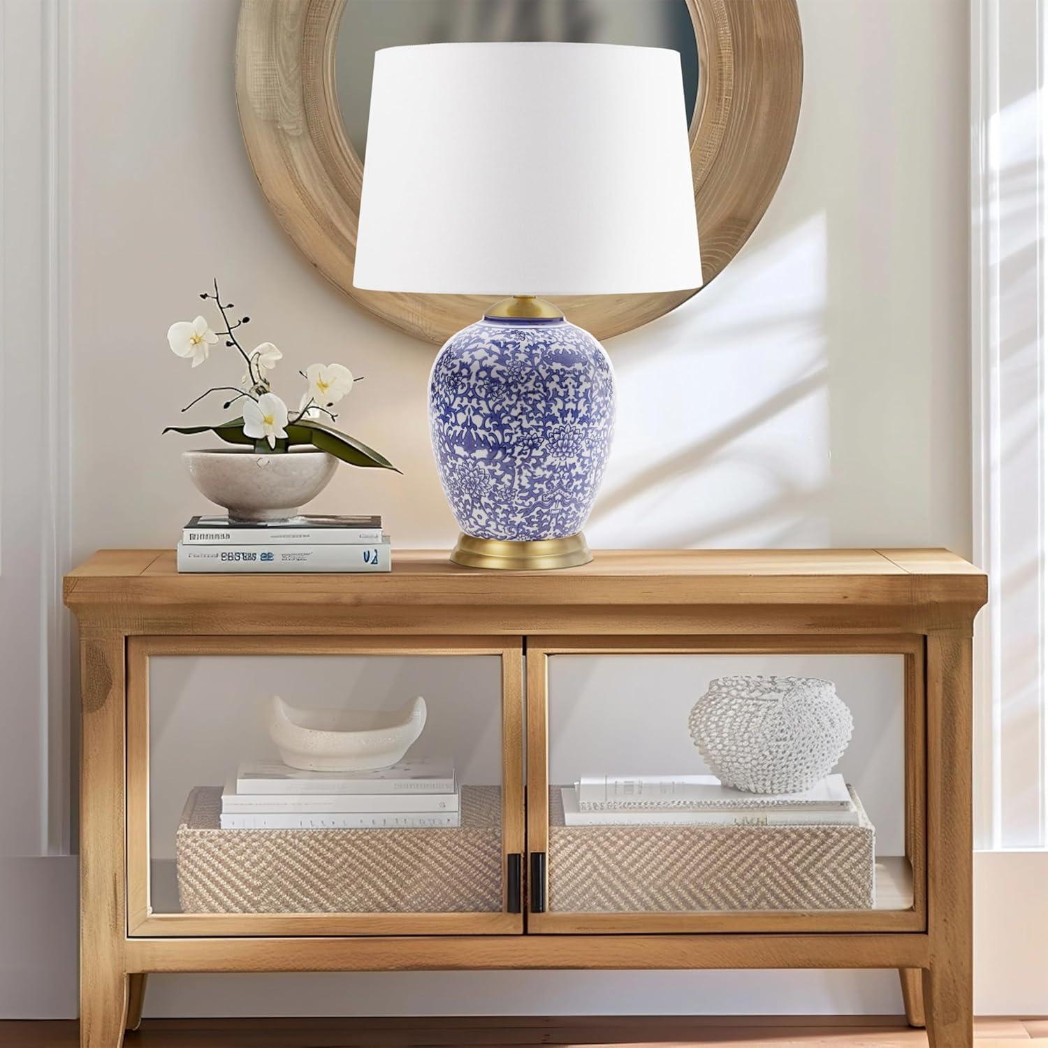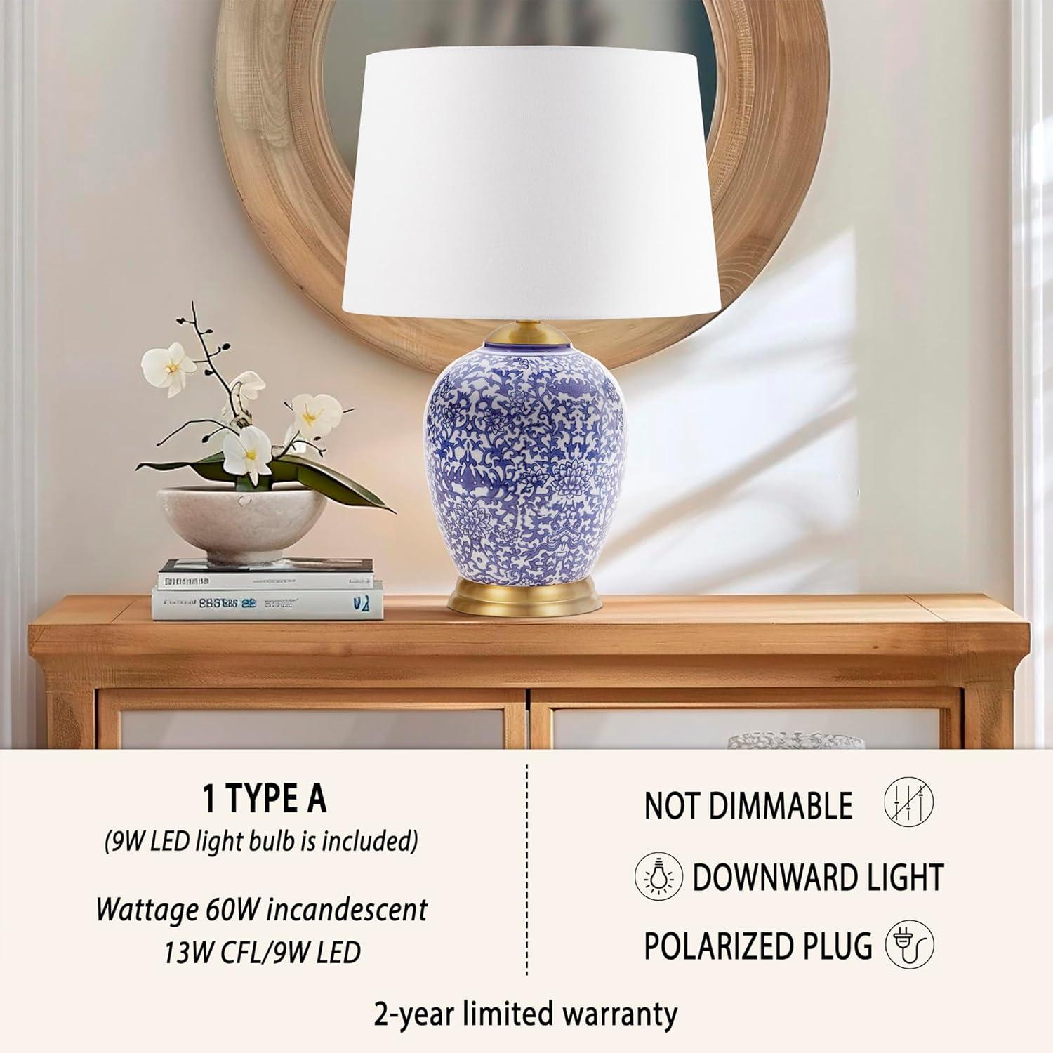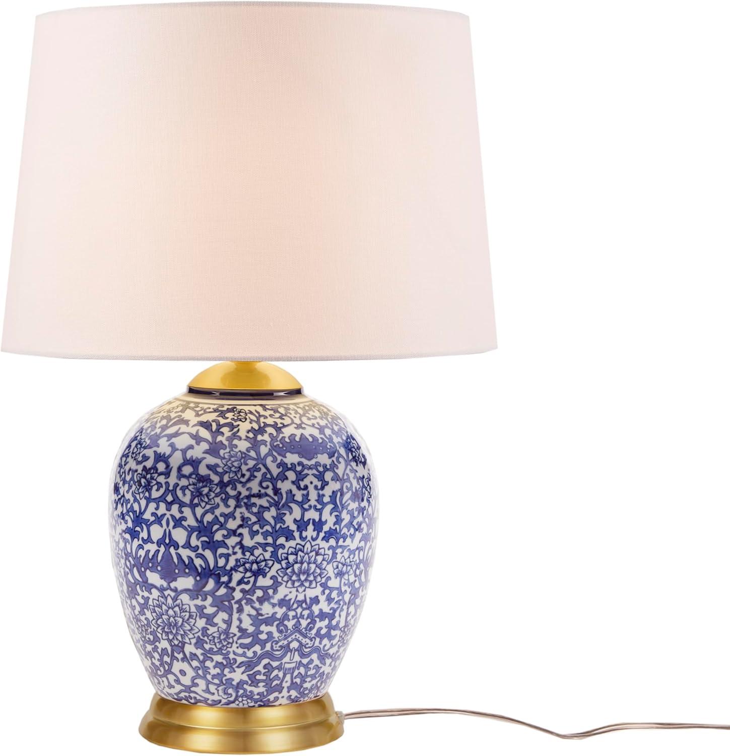Introducing the Mystique Table Lamp from the Martha Stewart Lily Pond Collection, drawing inspiration from traditional ginger jars. Its ceramic body features an exclusive blue chinoiserie pattern with a white tapered drum-shaped shade. Adorned with opulent gold accents on the lamp base and neck, it includes an on/off switch and a 60″ clear cord. Equipped with a 9W LED bulb, it ensures radiant illumination. Please note, this lamp is not dimmable and requires spot cleaning to preserve its pristine beauty. Illuminate your surroundings with this exquisite fusion of artistry and functionality.