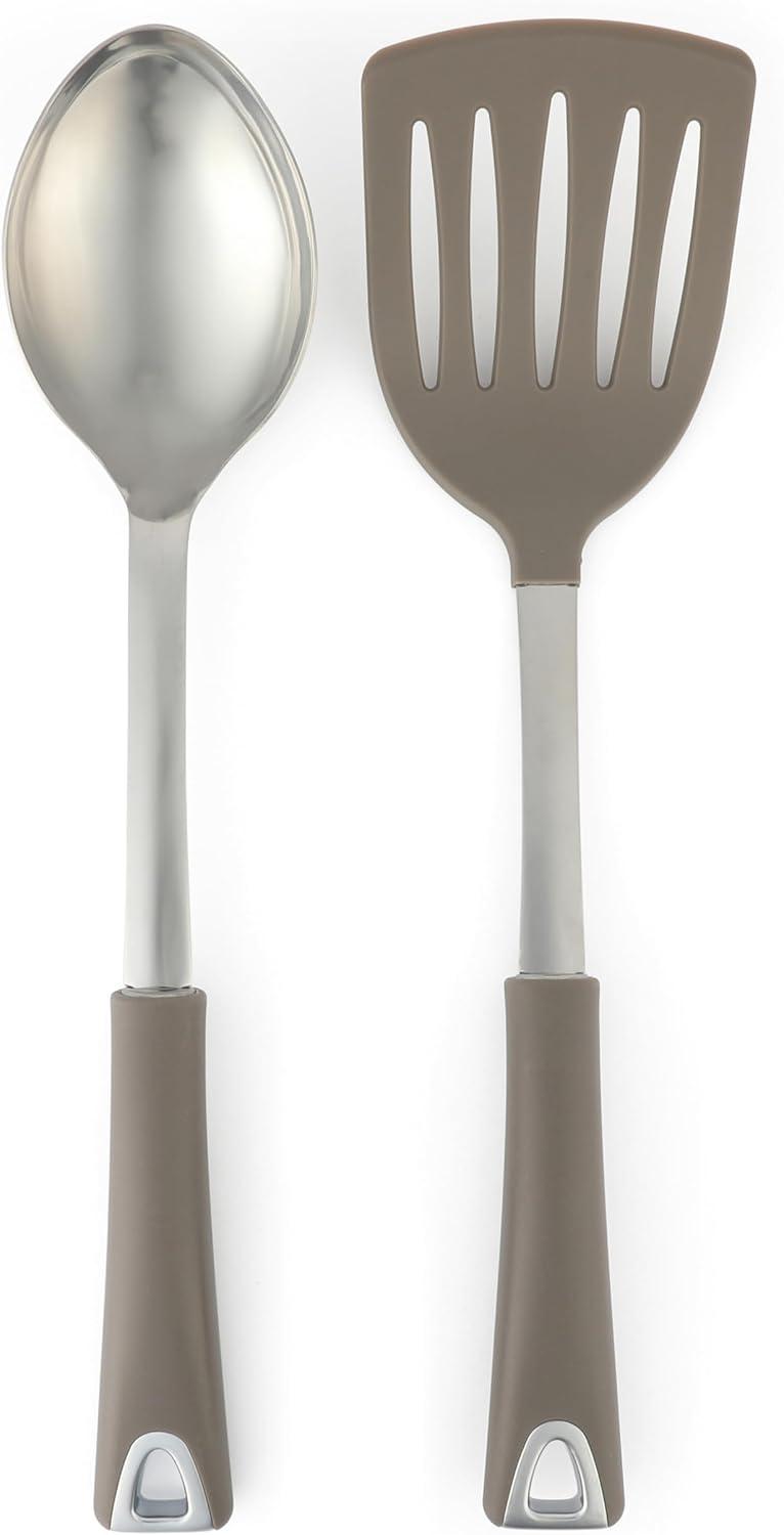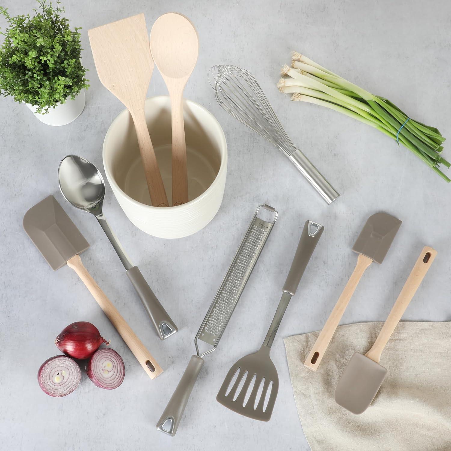 An organized kitchen is an inviting space to start making special meals bound to be the talk of the table. The 10-piece Prep and Serve Tool Set with Ceramic Holder from Martha Stewart is a complete set of cooking utensils for stirring, scooping, and serving food every day, Tools with wood, nylon and silicone heads are suitable to use on nonstick cookware without scratching or scraping the delicate interior coating of your go-to frypans and Dutch ovens. Each cooking tool is designed for a specific function to perform any task – whether for whisking, grating cheese or flipping pancakes and serving portions of stews. Sturdy handles offer an ergonomic grip for mixing and serving with confidence. Store and display all the tools in the elegant ceramic crock for easy access and clutter-free storage. Hand wash only.