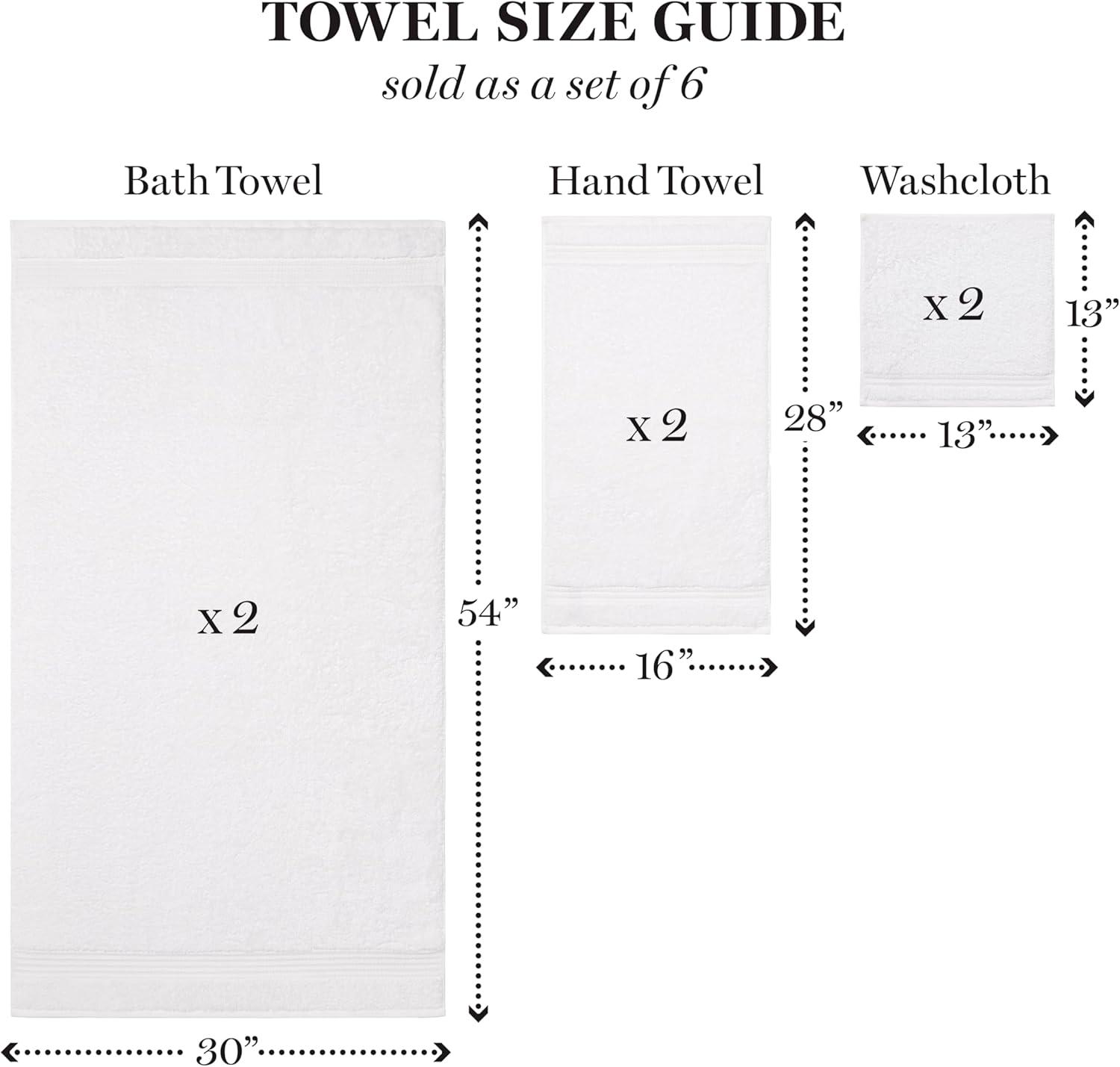 2 Bath Towels: 30in x 54in 2 Hand Towels: 16in x 26in 2 Washcloths: 13in x 13in These towels are packaged as a bundle with a ribbon and information card. Best bath towels for a retreat in reach as they are larger than average and cozy as ever. These sets are great for updating a guest bathroom or family bathroom towel set. Ideal housewarming gift or college student essential.