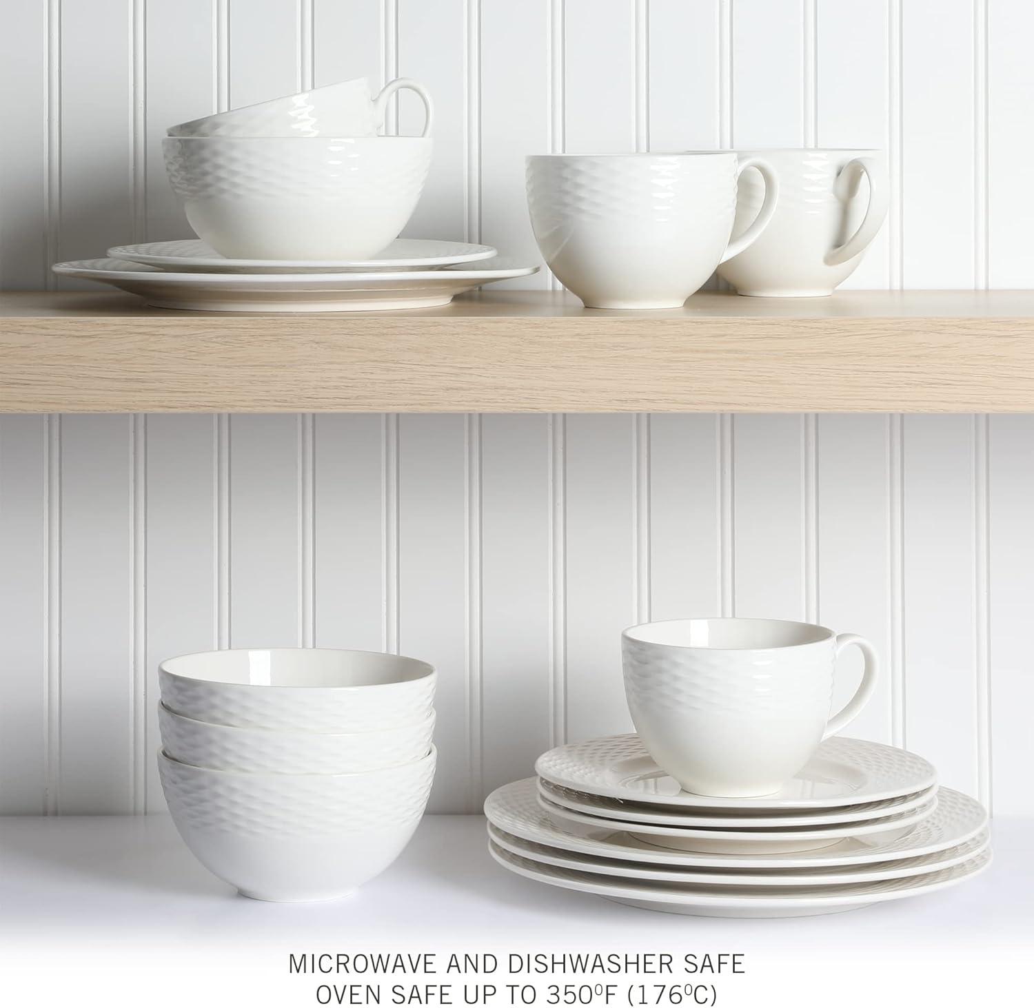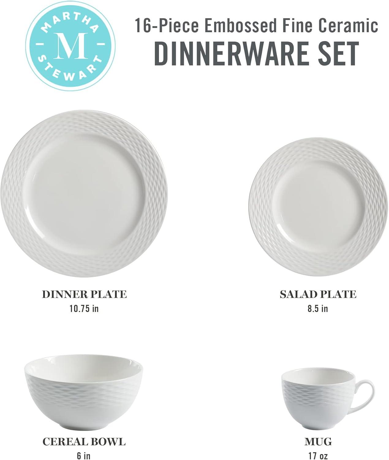 Martha Stewart 16 Piece Basket Weave New Bone China Embossed Porcelain Chip and Scratch Resistant Dinnerware Set(White)