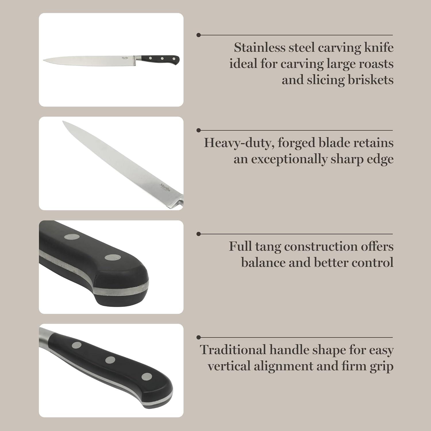 Following the lead of Martha's best-selling Lockton cookware collection, this 16-piece Stainless Steel Cutlery Set with Acacia Wood Block continues to carry the collection's signature gold accent through each knife's stainless steel butt and rivet. The Lockton Knife Set features heavy-duty and full-tang knives, forged from high-carbon stainless steel, designed to resist rust and retain exceptional sharpness. Each ergonomic handle is secured by stainless steel rivets for a strong and secure grip. The knives fit nicely in the smooth-grained acacia wood block to offer a beautiful yet compact way to store and display the knifes on your kitchen countertop. Hand wash only. Use a soft, damp cloth to clean the knife block. Embrace thoughtfully designed home essentials from America’s most trusted lifestyle expert, Martha Stewart. Step into her exquisite and iconic world filled with a curation of high-quality products to prep, cook, bake, serve, and enjoy. All crafted to elevate everyday homemaking and seasonal entertaining, these kitchen and tabletop pieces blend style and performance, inspiring avid hosts and home cooks to set stylish tables, serve up delicious meals, and create spectacular memories.
