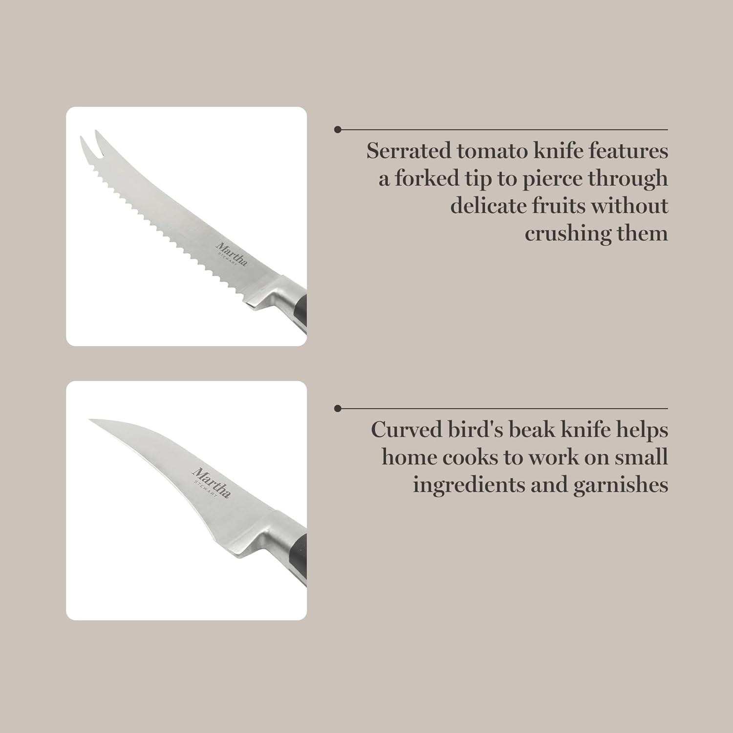 Martha Stewart 16 Piece Lockton High Carbon Stainless Steel Cutlery Kitchen Knife Block Set W/ABS Tripe Riveted Forged Handle Acacia Wood Block – Linen White W/Gold(Stainless Steel / Black Tomato & Bird’s Beak)