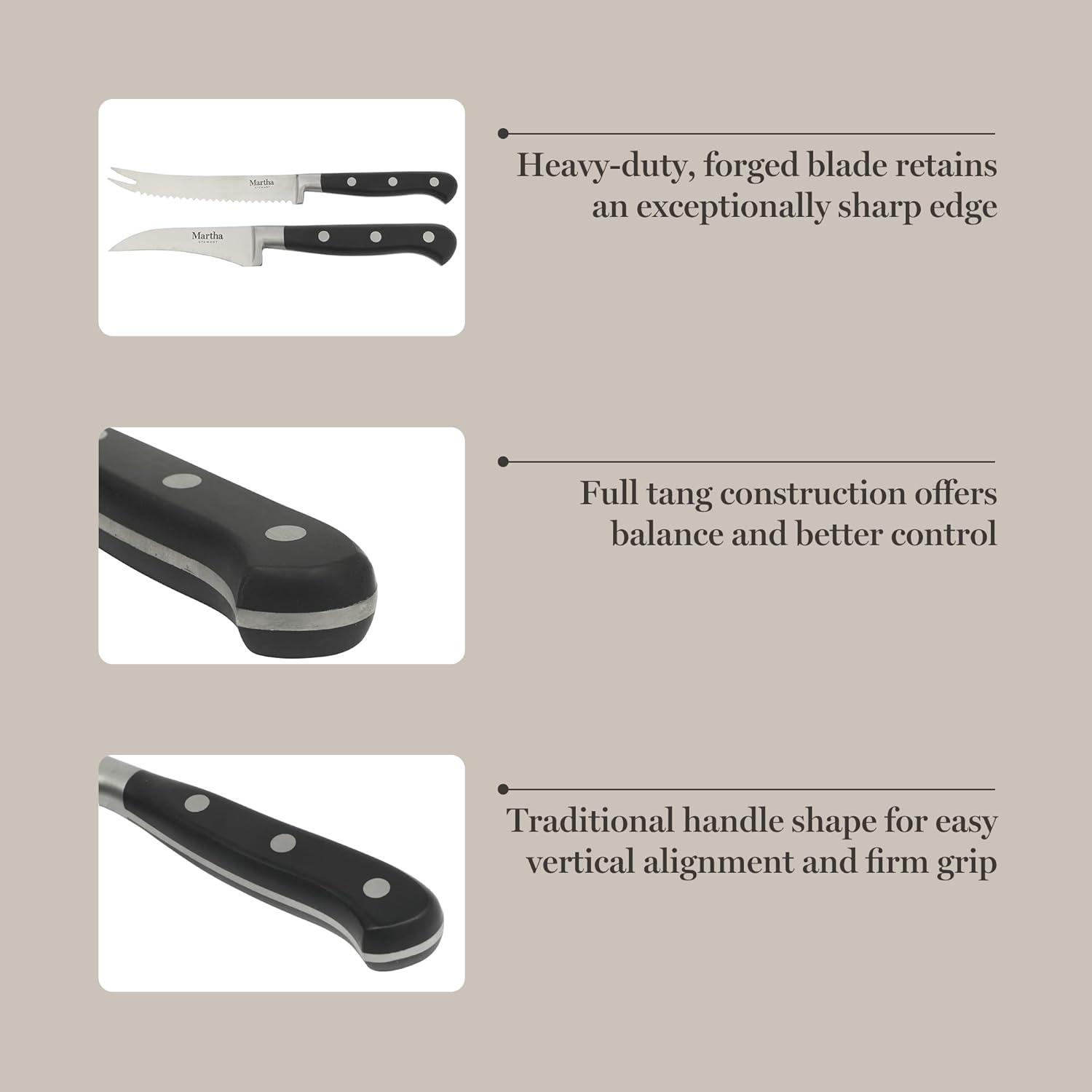 Following the lead of Martha's best-selling Lockton cookware collection, this 16-piece Stainless Steel Cutlery Set with Acacia Wood Block continues to carry the collection's signature gold accent through each knife's stainless steel butt and rivet. The Lockton Knife Set features heavy-duty and full-tang knives, forged from high-carbon stainless steel, designed to resist rust and retain exceptional sharpness. Each ergonomic handle is secured by stainless steel rivets for a strong and secure grip. The knives fit nicely in the smooth-grained acacia wood block to offer a beautiful yet compact way to store and display the knifes on your kitchen countertop. Hand wash only. Use a soft, damp cloth to clean the knife block. Embrace thoughtfully designed home essentials from America’s most trusted lifestyle expert, Martha Stewart. Step into her exquisite and iconic world filled with a curation of high-quality products to prep, cook, bake, serve, and enjoy. All crafted to elevate everyday homemaking and seasonal entertaining, these kitchen and tabletop pieces blend style and performance, inspiring avid hosts and home cooks to set stylish tables, serve up delicious meals, and create spectacular memories.