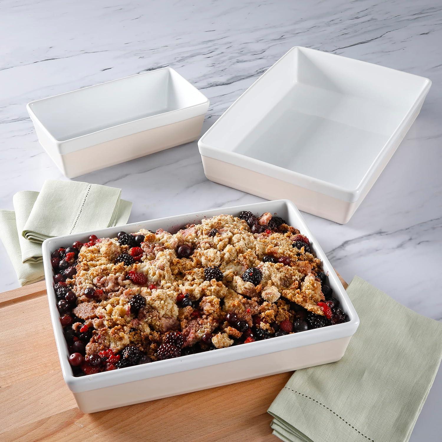 Versatile in the kitchen and beautiful on the table, the Martha Stewart 3-piece Stoneware Baker Set is a practical addition to any home baker's collection. Made from durable stoneware craftsmanship, each baking dish bakes and browns evenly to achieve golden-brown crusts and soft, flavorful crumbs. Available red, cobalt, yellow, dusty blue, grey, and pale pink, the two-toned exterior creates a stylish statement when serving from oven to table. Treat family and friends with seasonal fruit crumbles, gooey brownies, au gratin dishes, savory casseroles, and more from the easy-to-clean, glazed interior. It also allows smooth food release to easily slice through, serve, and scrape the last few bites of any dish. This set makes a charming gift for new bakers or newlyweds to share your passion for baking, family recipes, and well wishes. When not in use, stack all three pieces to save space in your cabinet for clutter-free storage.