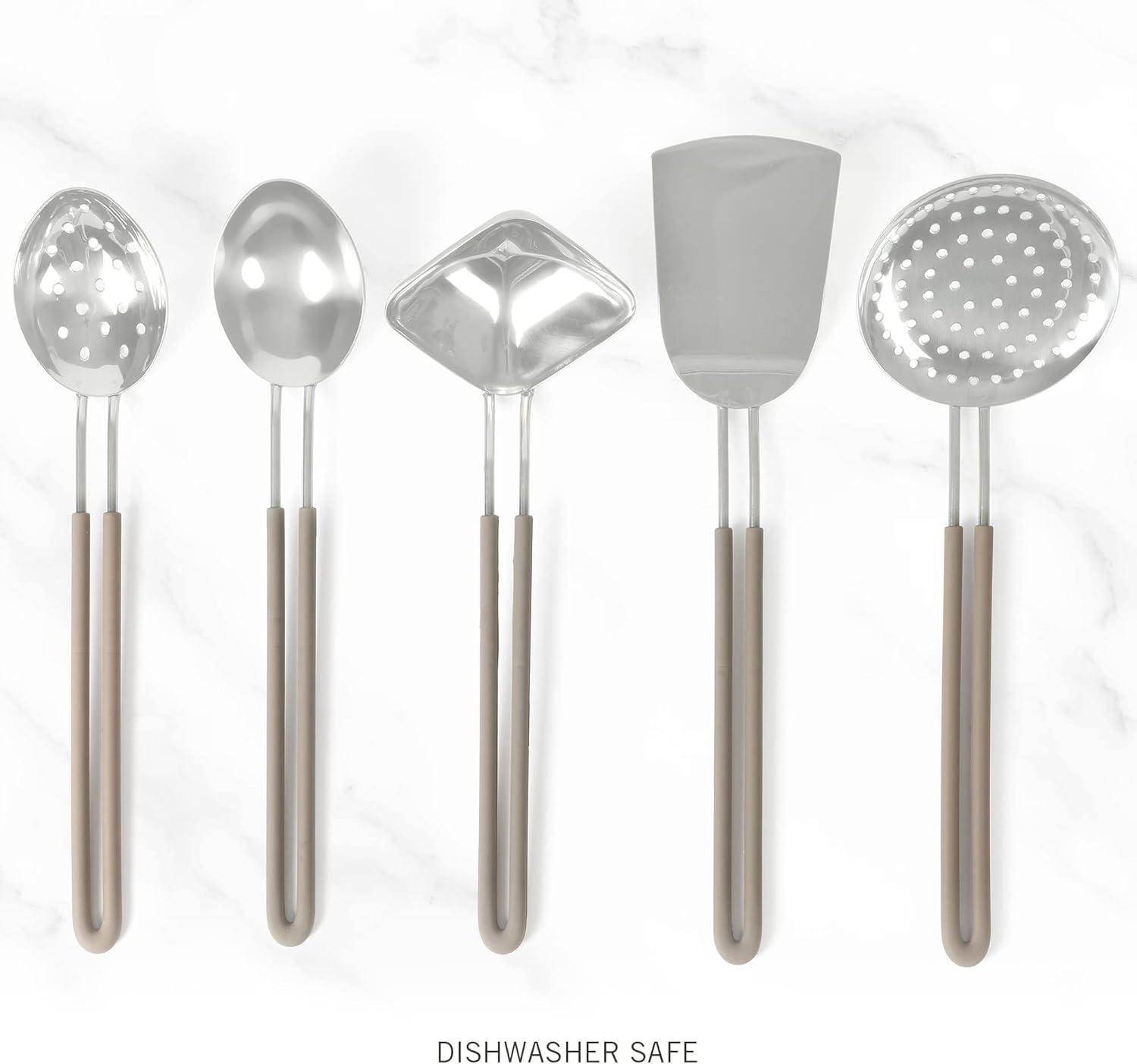 Without all the bells and whistles, simple and practical kitchen tools focus on one thing: function. The Martha Stewart Sprucedale 5-piece Stainless Steel Kitchen Tool Set features clean lines and practical shapes to offer style and utility. Crafted from high-quality stainless steel for long-lasting strength and impeccable luster, these utensils are ideal for everyday cooking and serving. Loop handles with heat-resistant silicone wrap provide a comfortable grip and hang for easy storage. Each stainless steel tool is designed for a specific function to perform any cooking task, whether for skimming, mixing, flipping, stirring, or serving.