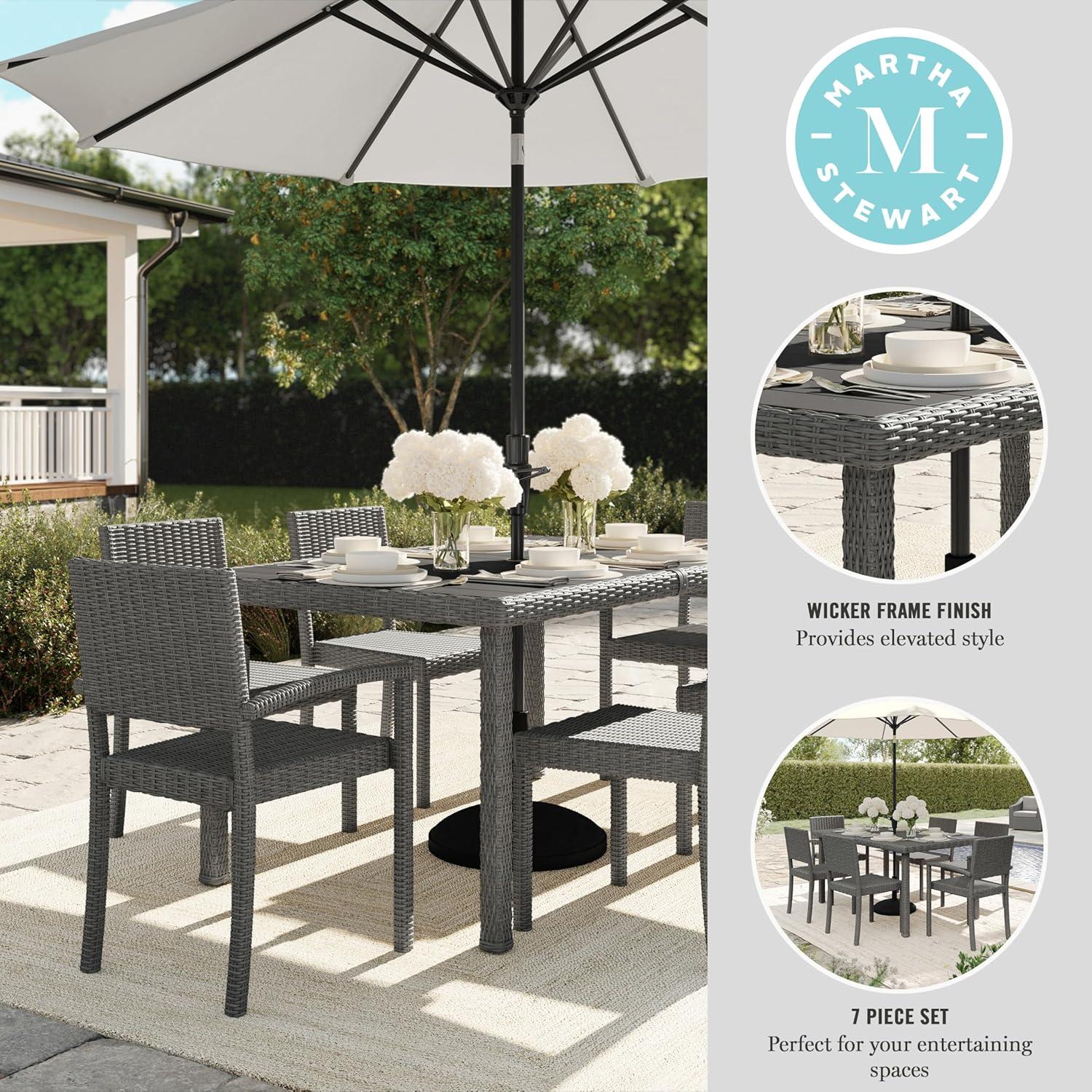 Martha Stewart Bedford 7-Piece Indoor-Outdoor Dining Set with 6 Stackable Chairs and 62″ Patio Table with Faux Wood Top and Rattan Wicker Finish in Brown(Grey)