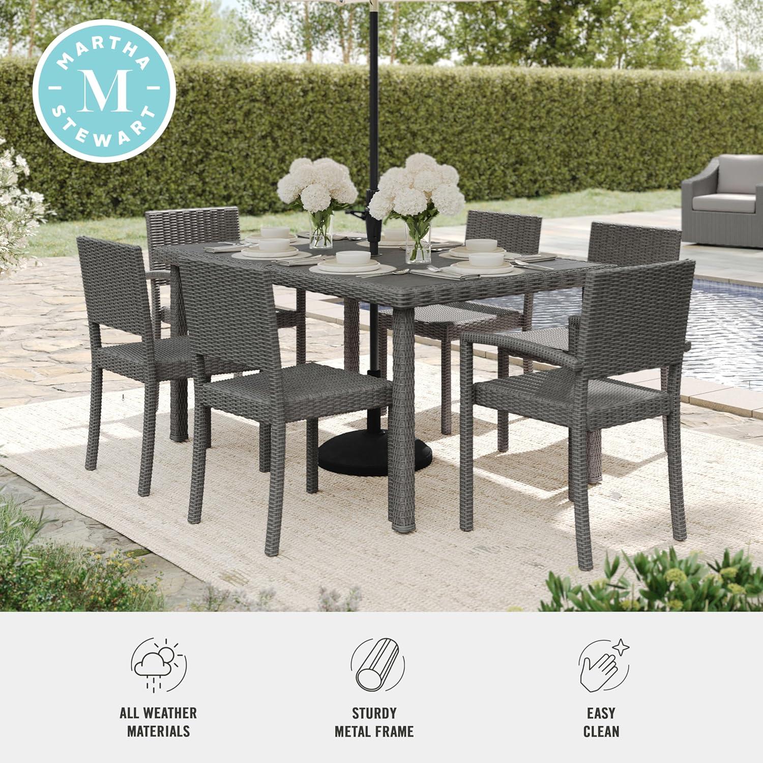Refresh your patio space with the chic style and cozy comfort of this Martha Stewart Bedford Patio Dining Set. Sturdily built, this set with two patio armchairs, four side chairs, and a 62 patio table is ideal for reading al fresco, enjoying cocktails with friends, or simply relaxing. With a recommended stack quantity up to eight chairs high, you can effortlessly store multiple chairs when not using. The table boasts a faux wood top with an umbrella hole (umbrella not included) and adjustable floor glides for a level surface while you make the most of sunny days or starlit evenings. Part of our Bedford collection, this set pairs wonderfully with the coordinating pieces allowing you to craft a custom collection that fits your entertaining needs. For your convenience, your chairs arrive with no assembly required and table setup is simple with tools included and step-by-step instructions, while upkeep is quick and easy.