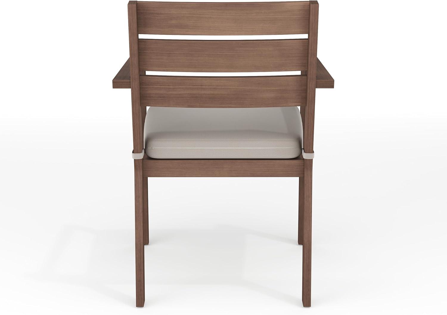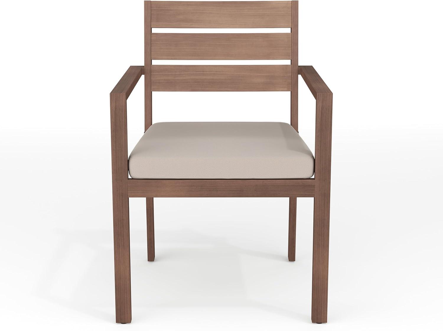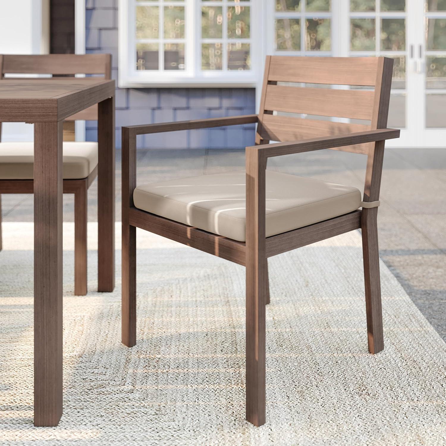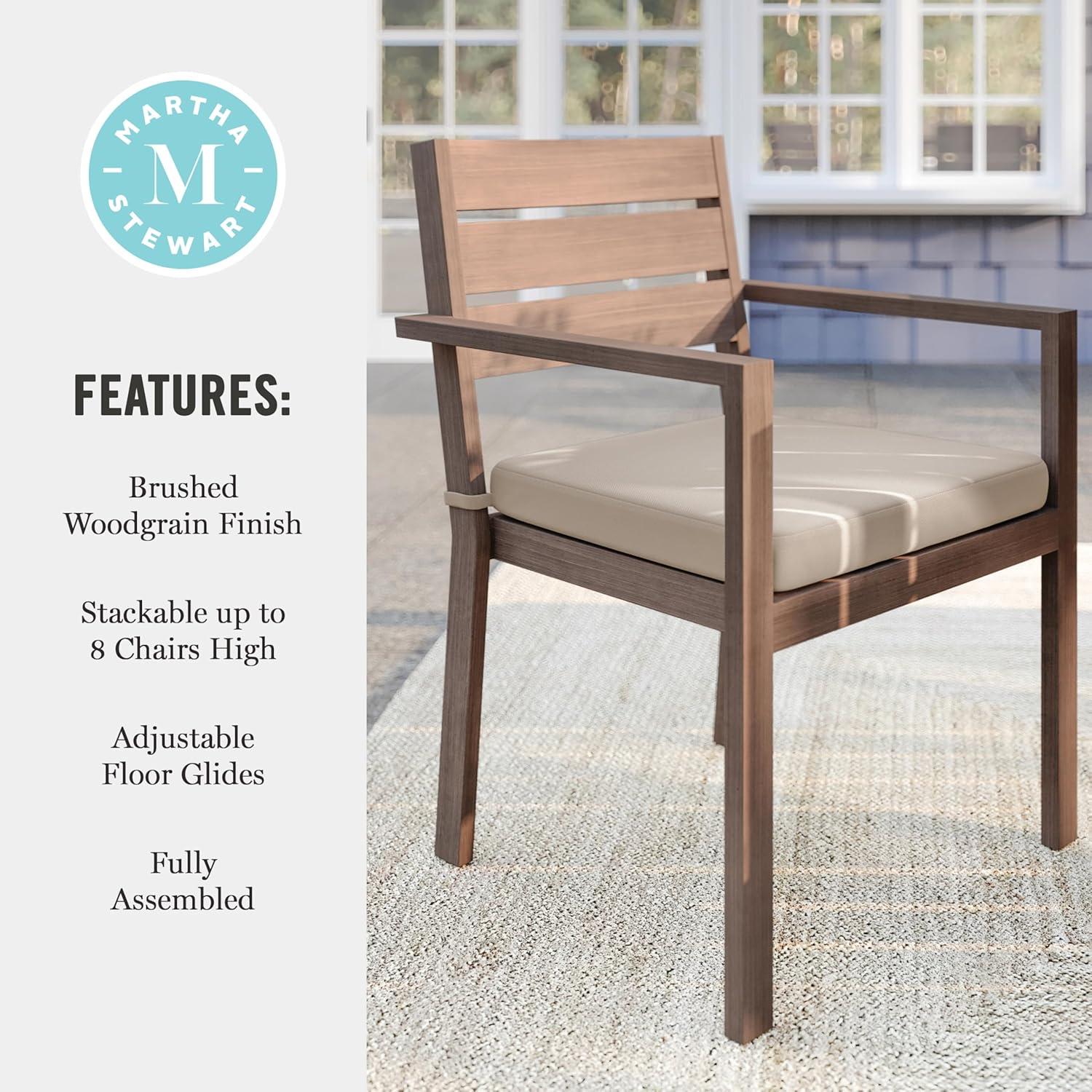 Elevate your indoor-outdoor sanctuary with the set of two Martha Stewart Bedford Patio Dining Armchairs. Masterfully crafted with a durable, rustproof aluminum frame in a beautiful hand-brushed woodgrain finish, these pieces lend elegance to any occasion. All-weather materials and a recommended stack quantity up to eight chairs high deliver peace of mind and welcome convenience by making it easy to store multiple chairs and save space when not in use. The addition of 2.5 thick seat cushions grant gracefully comfortable seating to pair with your morning coffee or a favorite novel. Part of our Bedford collection, these armchairs pair wonderfully with the coordinating armless chairs, accent chairs, barstools, and dining tables, perfect for crafting a custom collection that fits your entertaining needs. Arriving conveniently ready for use and requiring only minimal maintenance, these dining chairs are a must have for everyday use as well as special occasions.