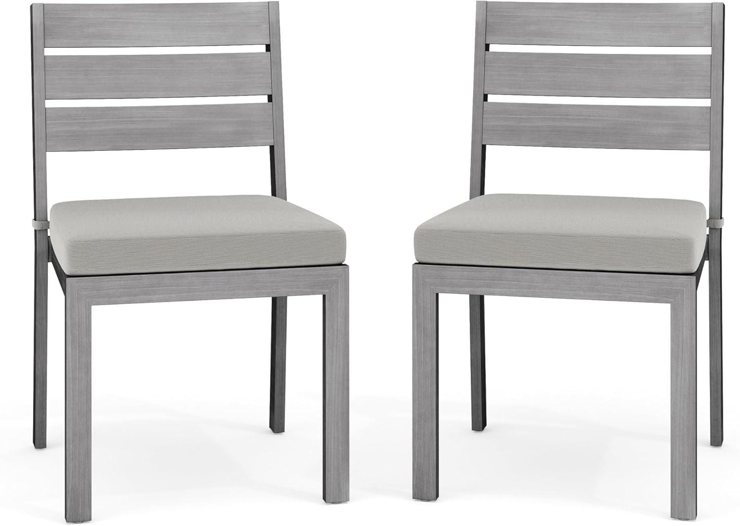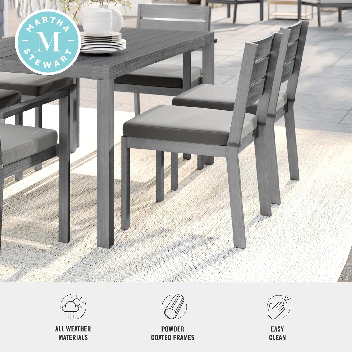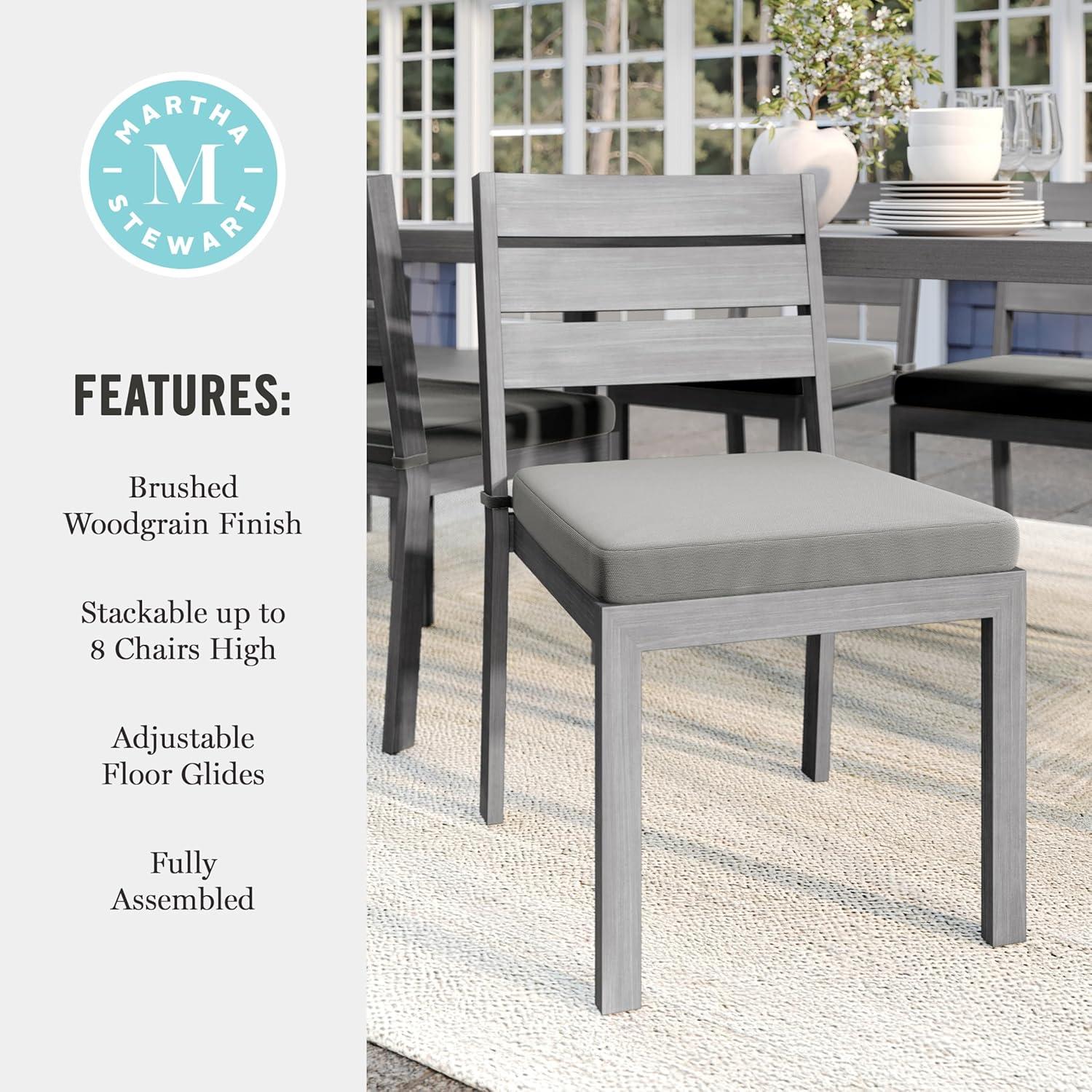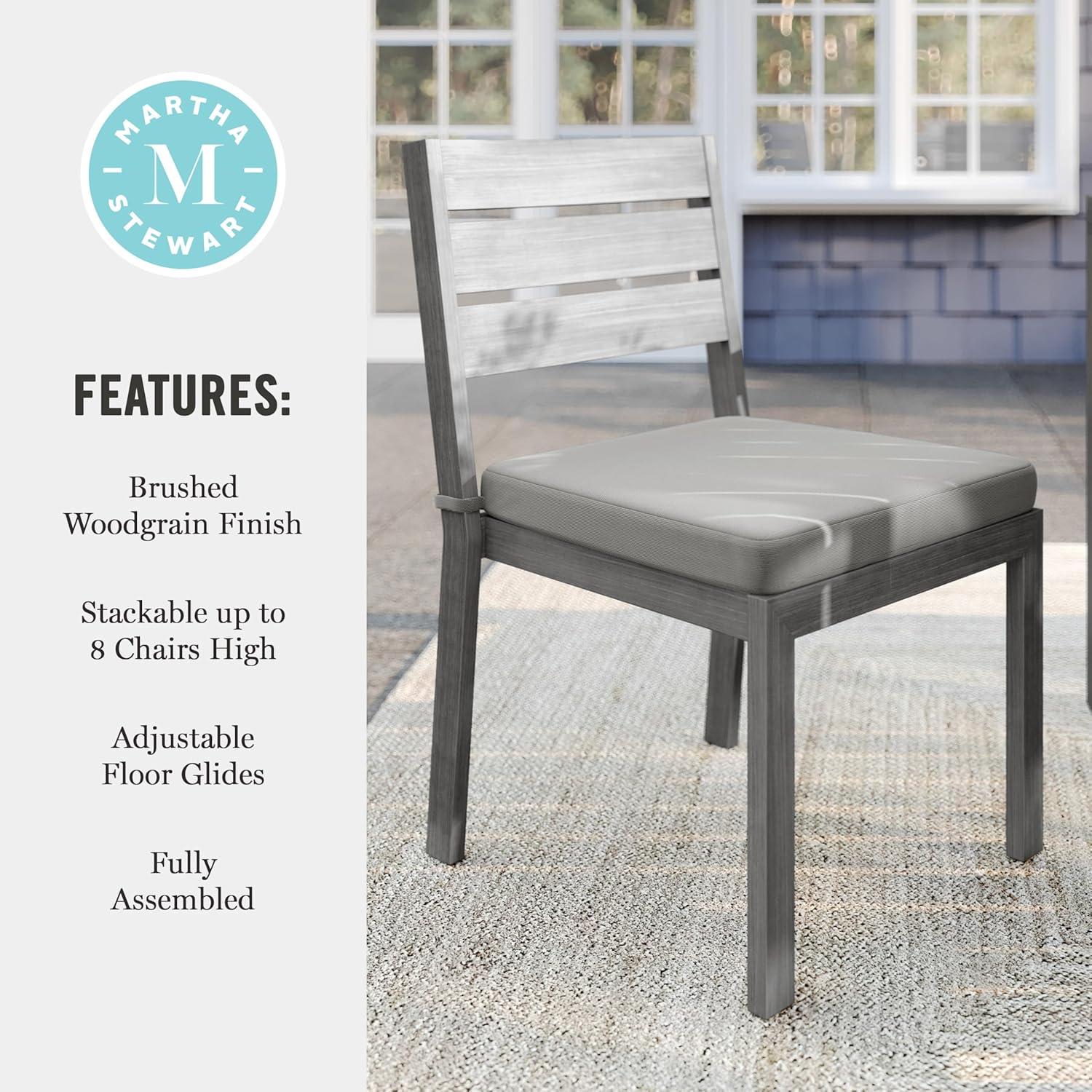Martha Stewart Bedford Indoor-Outdoor Stackable Aluminum Patio Chairs with Brushed Woodgrain Finish in Gray and Gray All-Weather Cushions, Set of 2(Grey)