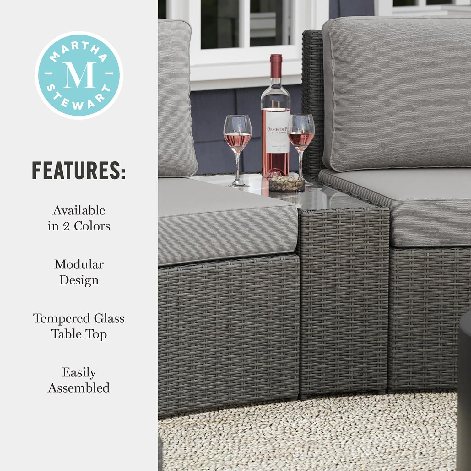 Refresh your patio space with the chic style of this Martha Stewart Bedford Patio Tapered Side Table. Sturdily built, this versatile patio table is the ideal companion for reading al fresco, enjoying cocktails with friends, or simply relaxing. This wicker table boasts a tapered design and an inset tempered glass top to showcase picturesque charm while you make the most of sunny days or starlit evenings. Part of our Bedford collection, this table pairs wonderfully with the coordinating pieces allowing you to craft a custom collection that fits your indoor-outdoor needs. Setup is simple with tools included and step-by-step instructions while upkeep is just as easy.