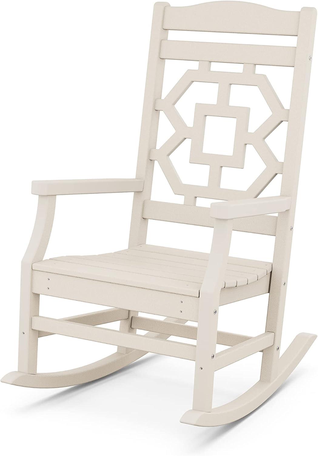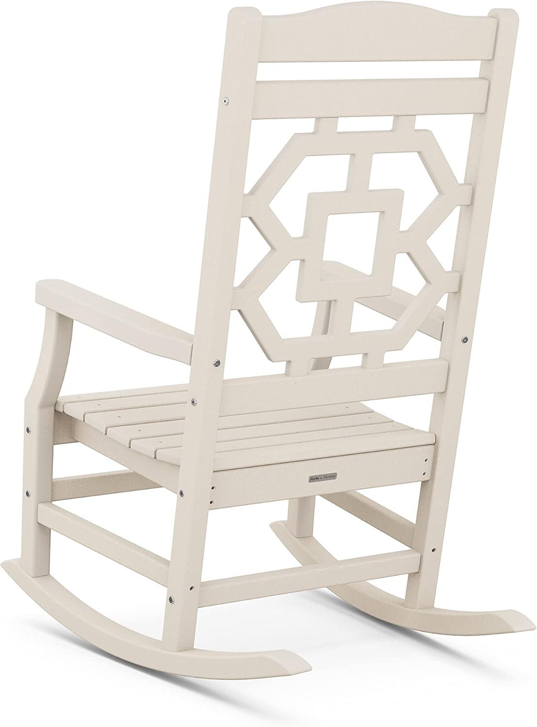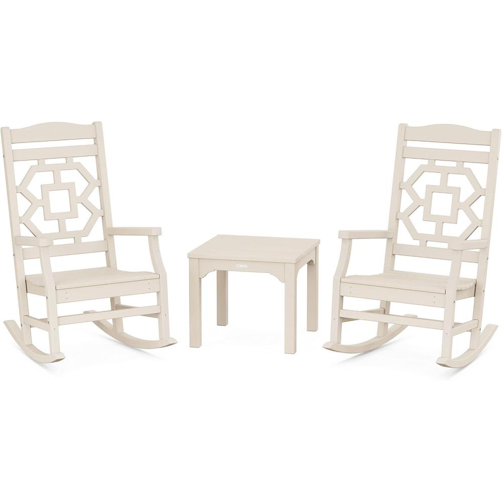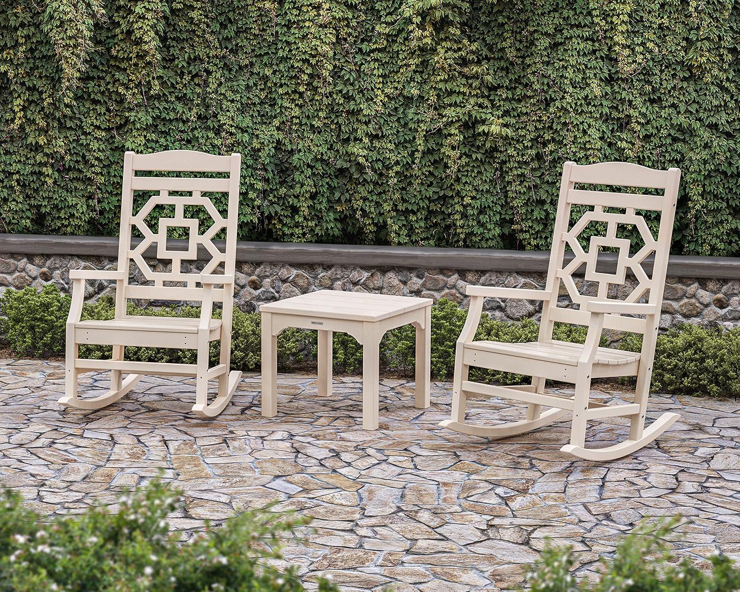 Comfortable, livable luxury that's made for gathering. The Martha Stewart by POLYWOOD Chinoiserie 3-Piece Rocking Chair Set creates a welcoming patio or porch with classic styling, slow motion, and embracing silhouettes. Traditional design is evoked in the graceful lines and intricate latticework, delicate details that are balanced by the rockers' sturdy frames and all-weather durability. A coordinating end table serves as the ultimate finishing touch.