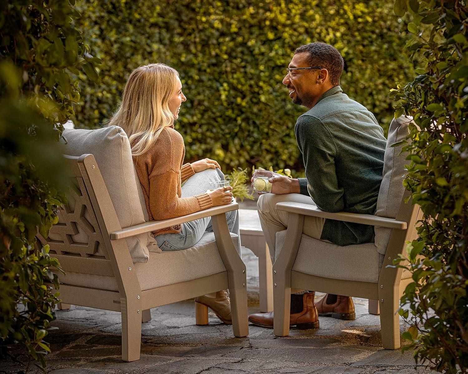 Comfortable, livable luxury that's made for gathering. The Martha Stewart by POLYWOOD Chinoiserie 4-Piece Deep Seating Set with Loveseat creates a warm, welcoming outdoor space with classic styling, inviting cushions, and embracing silhouettes. Traditional design is evoked in the graceful lines and intricate latticework, delicate details that are balanced by the seating's sturdy frames and all-weather durability. A coordinating coffee table serves to bring this look together.