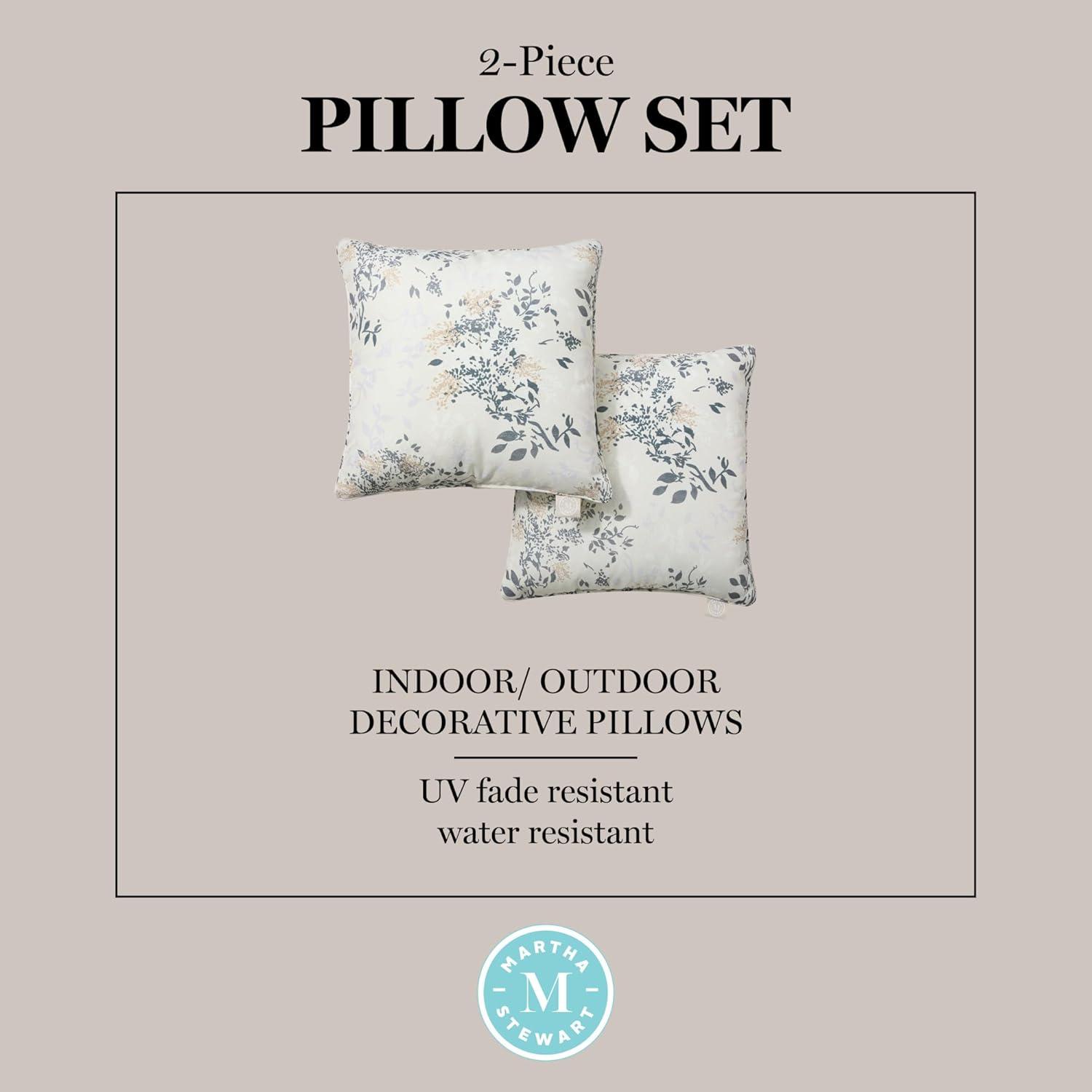 Bring comfort to your outdoor living spaces with the Martha Stewart Charming Foliage indoor/outdoor decorative pillow 2-pack set. Printed with a charming floral design, these pillows will add comfort and style to your outdoor décor. Use these decorative throw pillows indoors or outdoors, as they’re made with UV-fade and water-resistant materials and are soft for everyday use. This indoor/outdoor decorative pillow set includes two filled throw pillows made of 100% Polyester, making them easy to clean. Simply spot clean or handwash as needed for continued use in your home. Standard 100 by OEKO-TEX Certified.