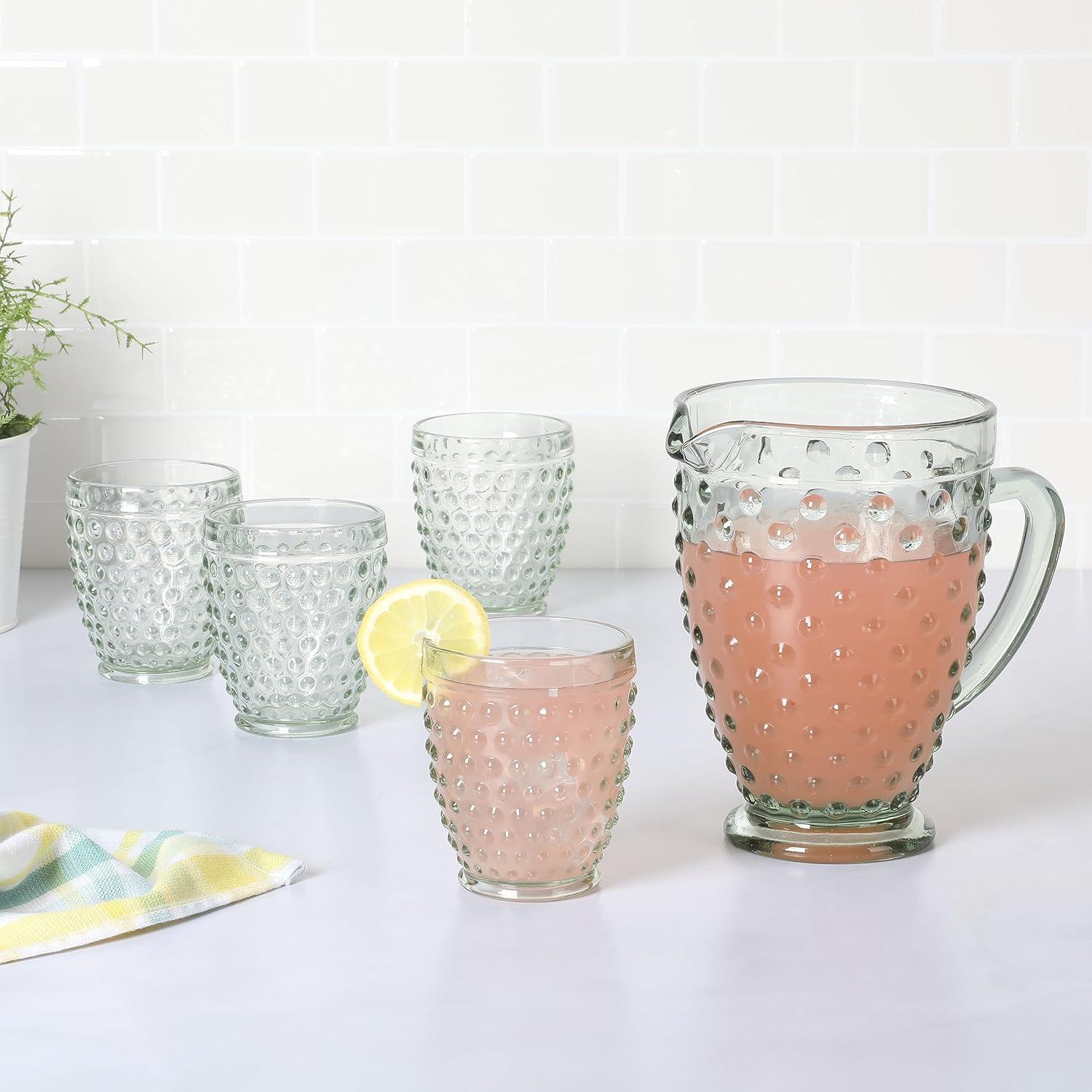 Enjoy flavored iced teas, cocktails, and more in the Martha Stewart Chauncey Hobnail Tumbler Set. Made from handmade glass, it features a generous 14.3oz capacity for less frequent refills and more interesting conversations. The raised hobnail details are vintage-inspired, making it a beautiful addition to any table setting. Dishwasher safe, top rack only. Do not microwave.