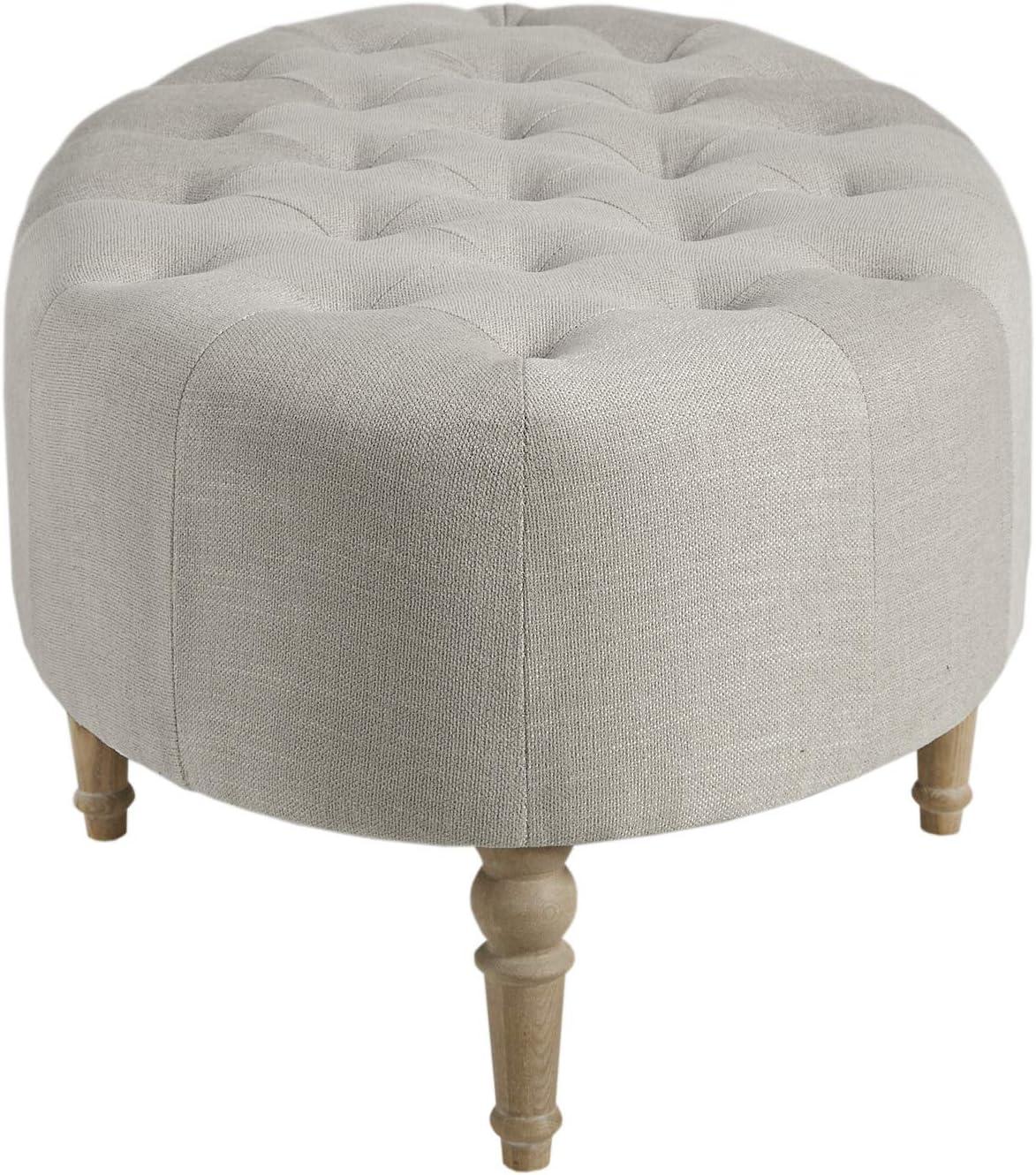 Created exclusively for the Martha Stewart Bedford furniture collection that embodies country farmhouse living, complete your living space with the Clara Accent Ottoman. This oval ottoman is upholstered in a linen-hued fabric and features a button-tufted top that adds an elegant accent to the design. The solid wood legs screw in and showcase a reclaimed natural wood finish to complement the upholstery, creating a farmhouse-inspired look. At her country farmhouse, Martha enjoys bringing the outdoors in. This functional and practical lifestyle is evidenced in her thoughtfully appointed decor which embraces a neutral color palette that acts as a perfect backdrop to four seasons of color. Leg assembly required.