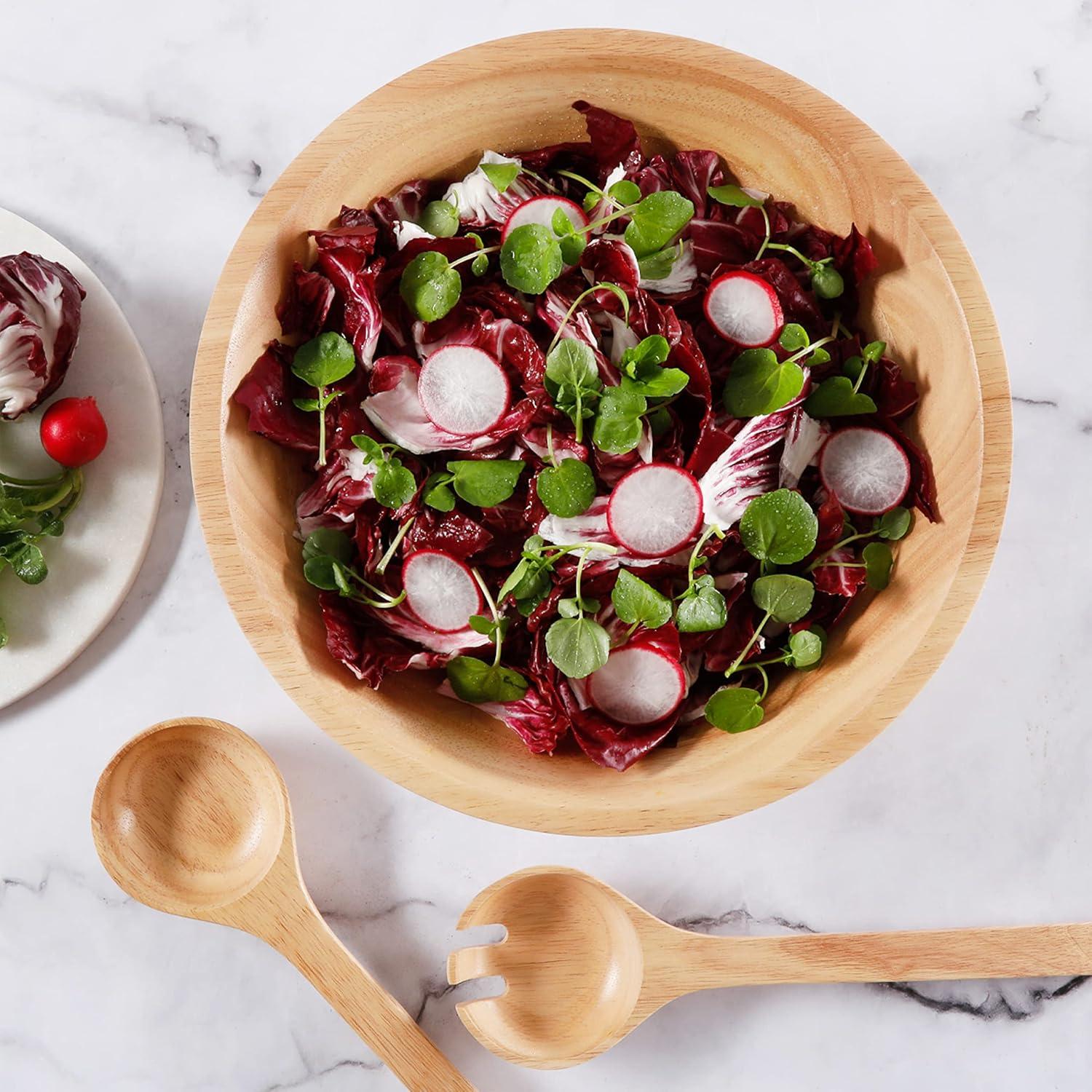Toss a healthy vegetable mix in this beauitful salad set from Martha Stewart. The Coban 3-piece Salad Bowl Set is a warm and stylish way to toss and eat your greens. Crafted from durable rubber wood, this generous-sized bowl features layered variations from the wood's natural grain and smooth finish. Serve any kind of salad or wedges, or use it as a beautiful centerpiece to display fruits. With this rustic salad set, salads will always be an easy (and healthy!) option to add to any meal.