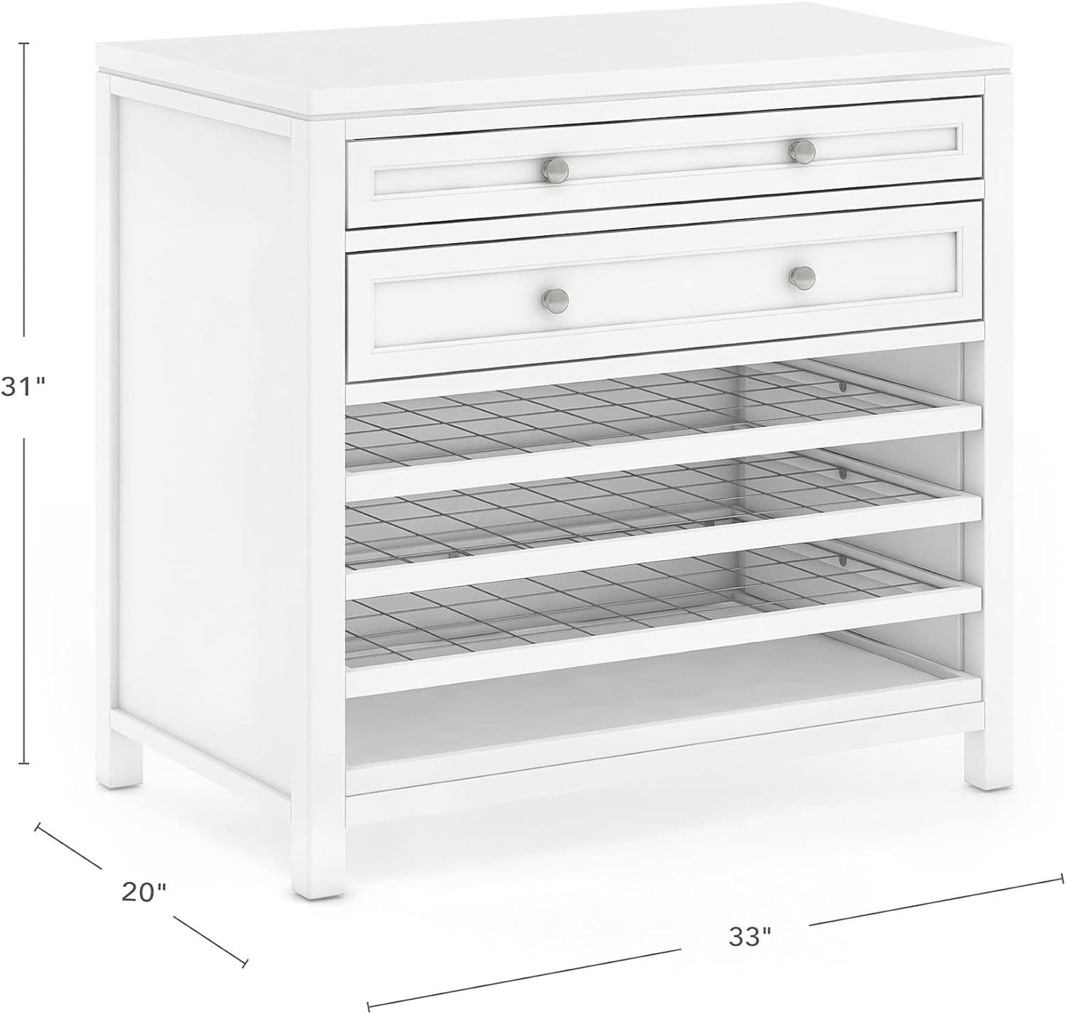 Comprised of unique storage solutions, functional work spaces and special places to curate and display children's art, the Martha Stewart Crafting Kids' Collection by Guidecraft inspires a child's artistic expression. Innovative designs along with quality pieces, together establish a comprehensive, child-centered space to create using a variety of media. Constructed from a durable combination of easy-to-clean solid pine and engineered wood, the Kids' Art Storage with Drying Racks – White provides an all-in-one storage space for works-in-progress and additional art supplies. Three removable racks and a removable drip pan make cleanup a breeze. Top drawer features multiple convenient dividers to limit clutter and provide additional organization in designated art spaces while a spacious second drawer leaves plenty of room for larger papers. Entire unit measures 33″L x 20″W x 31″H.