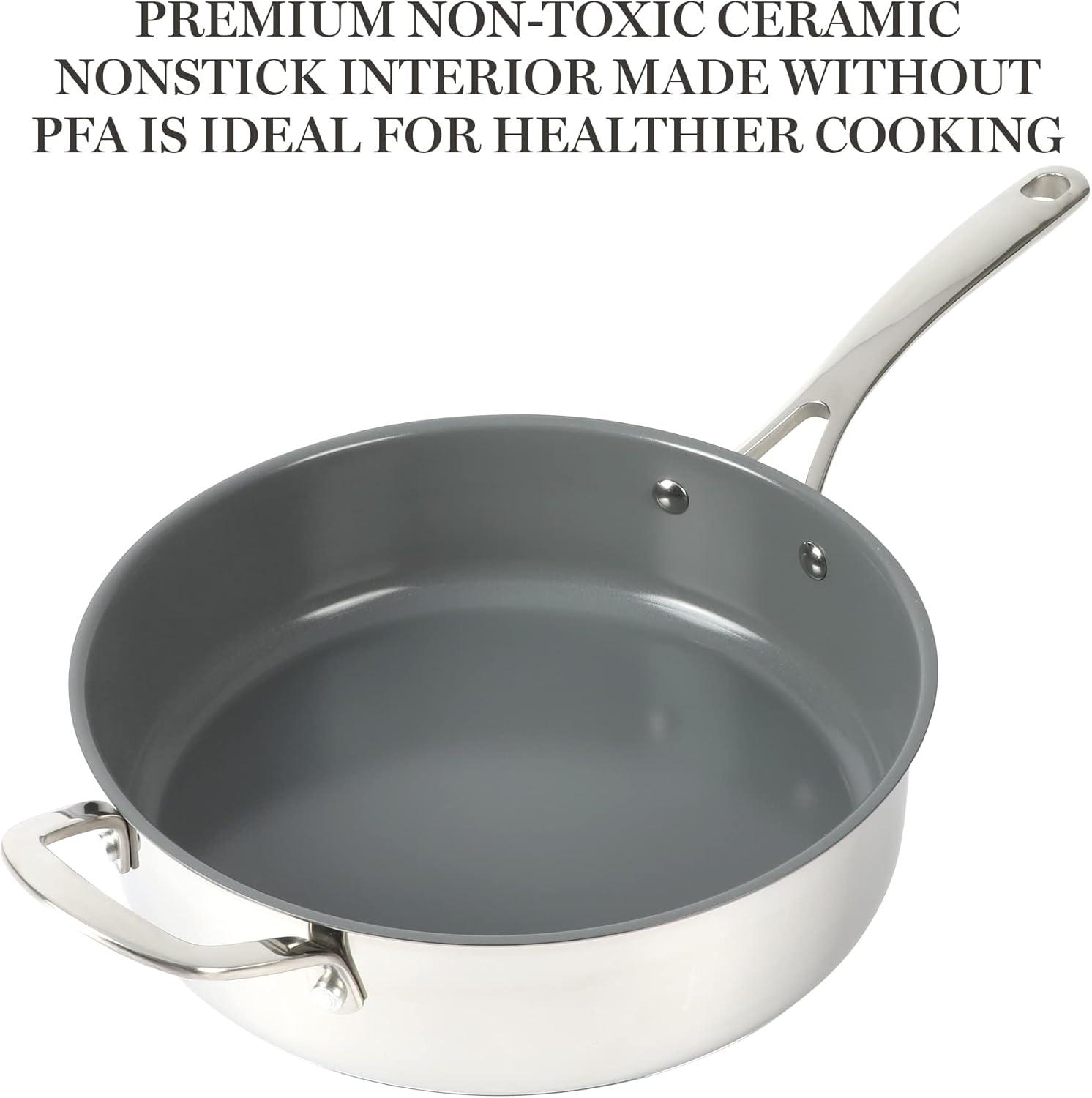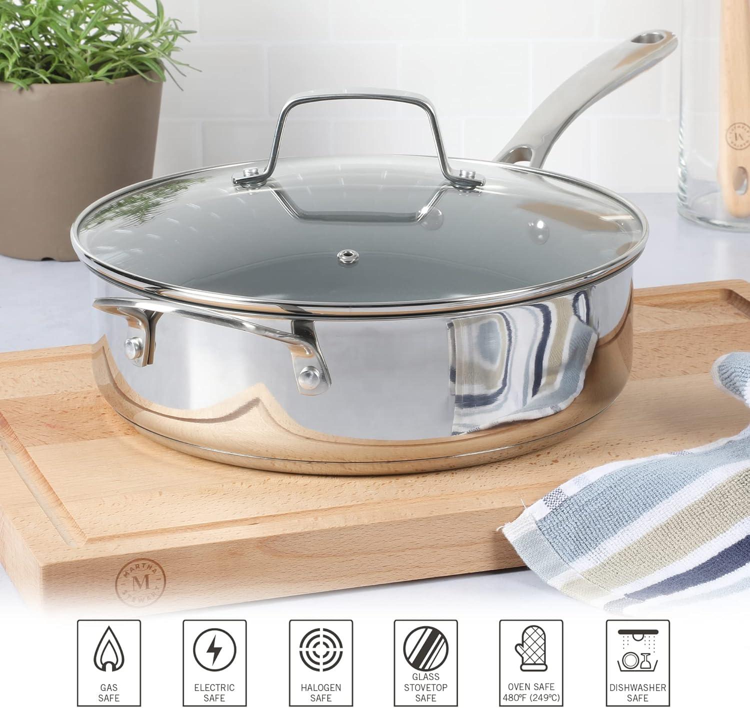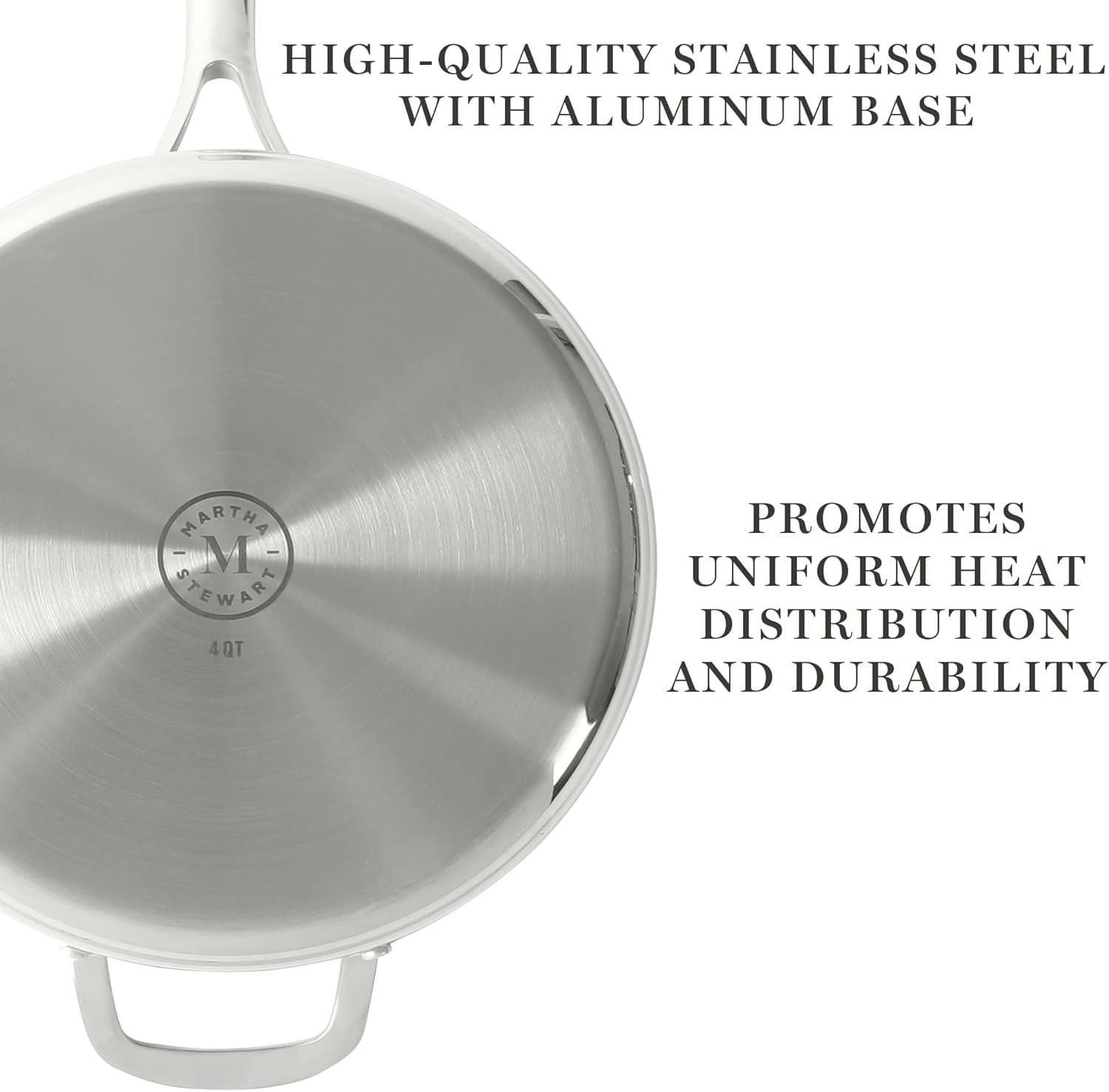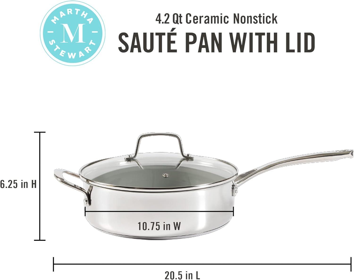 Martha Stewart Delaroux Stainless Steel 4-Quart PFAs Free Premium Ceramic Nonstick Saute Pan w/Tempered Glass Lid