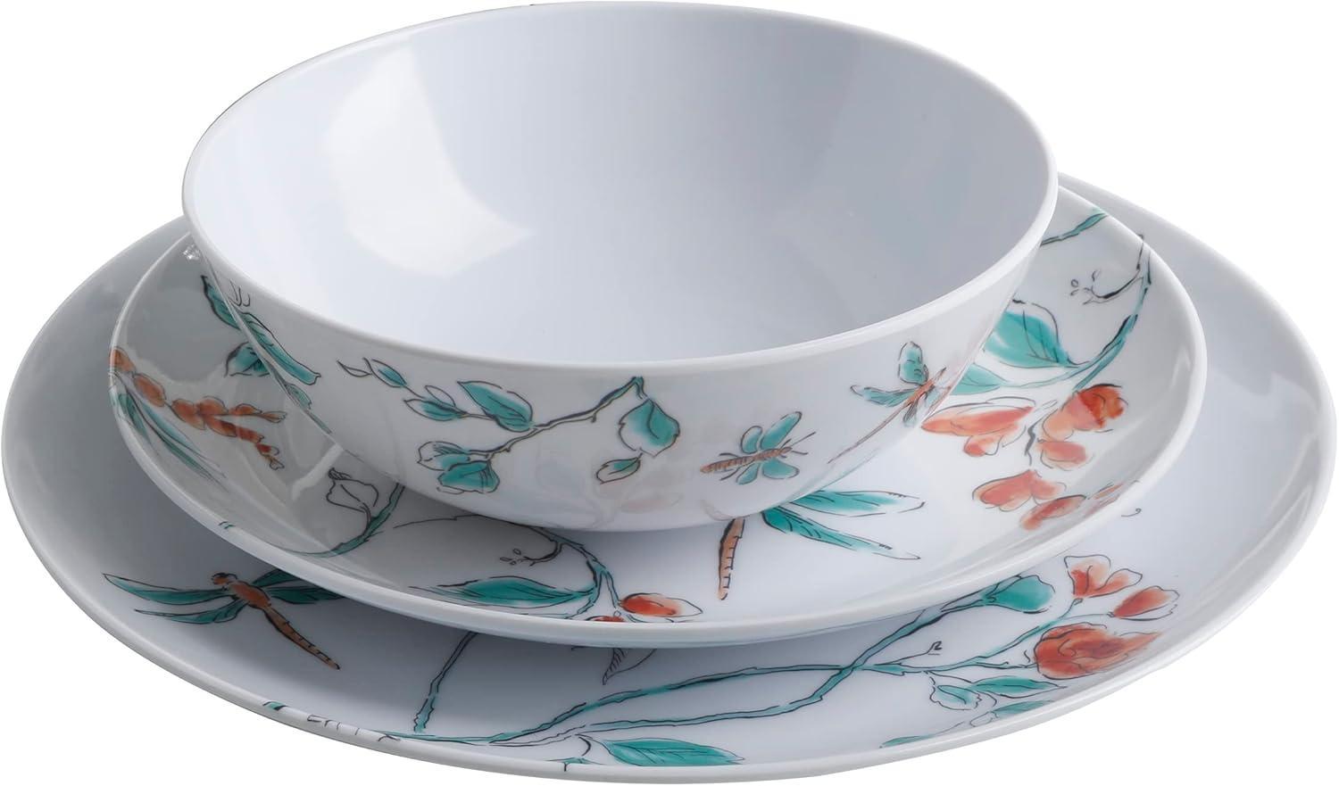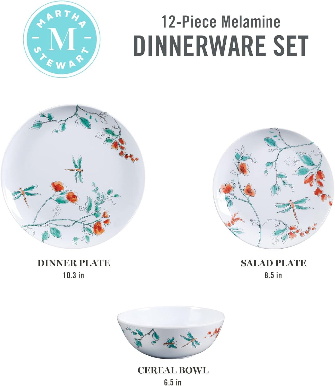 Martha Stewart Dragonfly 12 Piece Decorated Melamine Dinnerware Set – White(White)