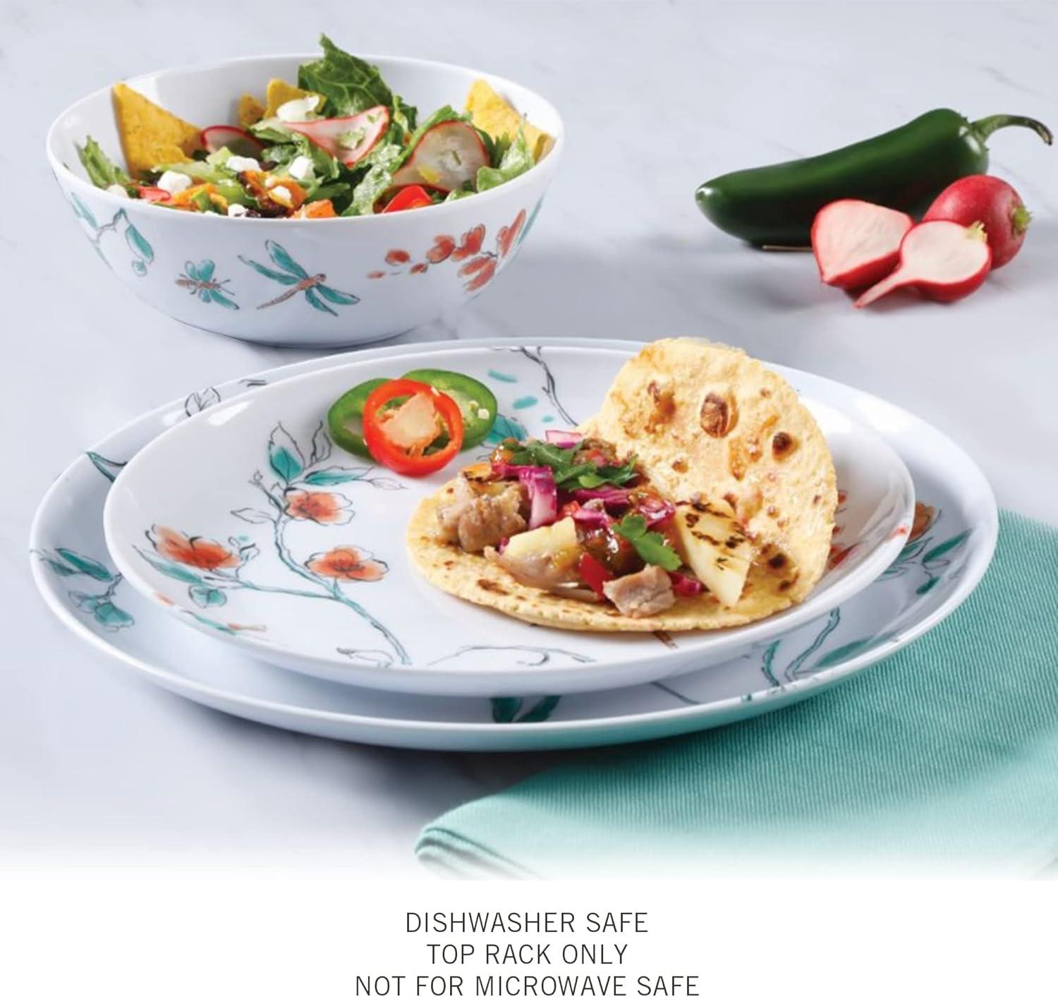 When the weather outside is perfect and fresh ingredients are just within your reach, a picnic is always a good idea. Bring lightweight but sturdy dining pieces with you, like the Dragonfly Melamine Dinnerware Set from Martha Stewart. Crafted from BPA-free melamine, these plates and bowls are easy to pack, use, and clean. Perfect for everyday at-home entertaining, each dinnerware features an imaginative charm to dress up any place setting. The watercolor floral designs bring home a little piece of nature to layer with other tabletop pieces in your collection. Share the gift of entertaining by sending this as a thoughtful wedding registry present or housewarming surprise to family and friends. Dishwasher safe, top rack only. Do not microwave.