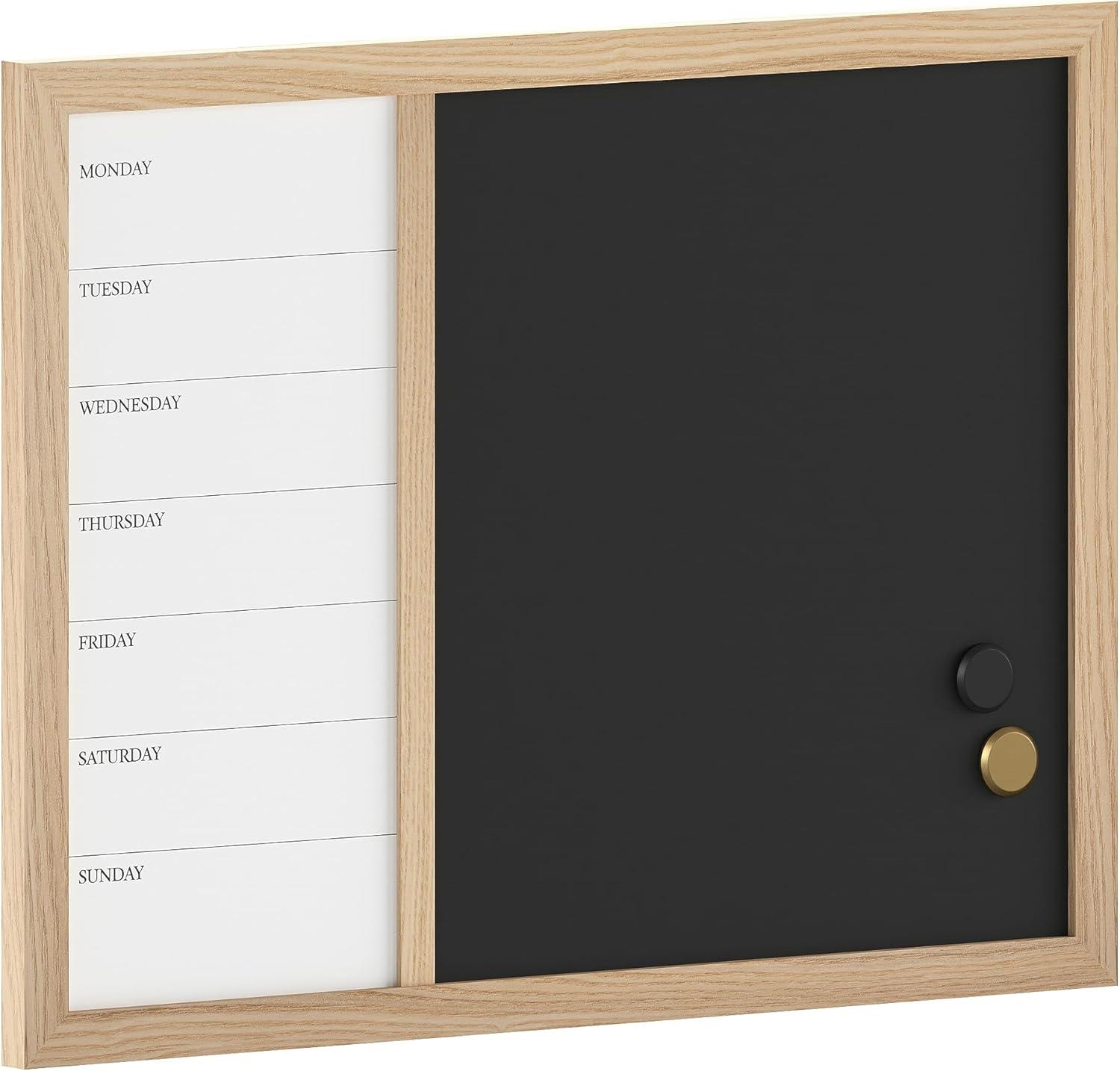 Martha Stewart Everette Magnetic Weekly Calendar Dry Erase Board and Chalk Board with Liquid Chalk Marker and Magnets, 24″x18″, Black Woodgrain Frame(Light Natural Woodgrain)