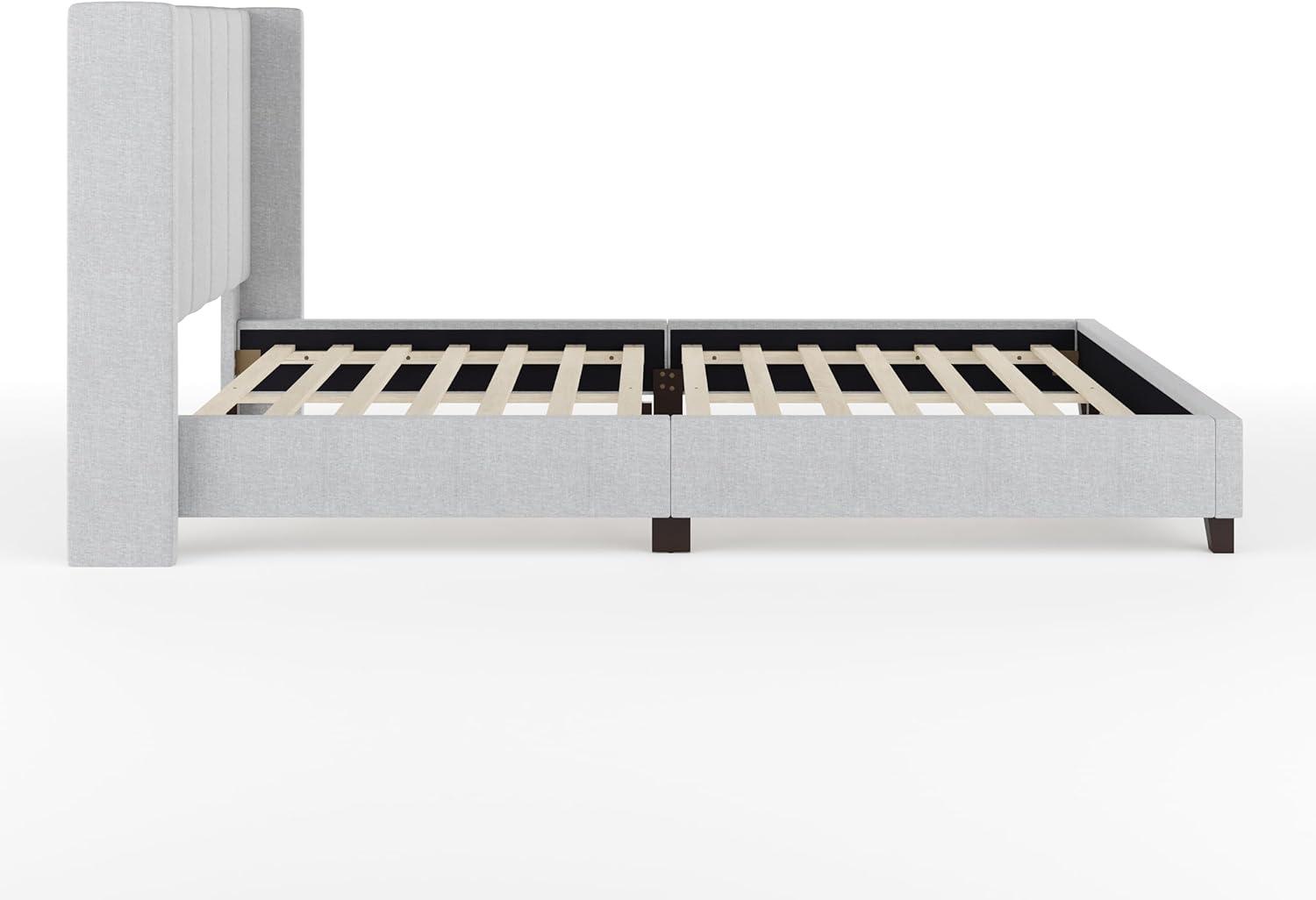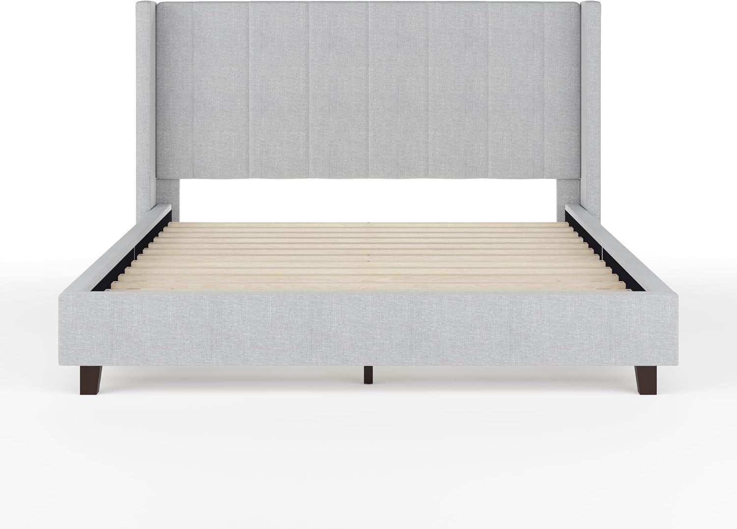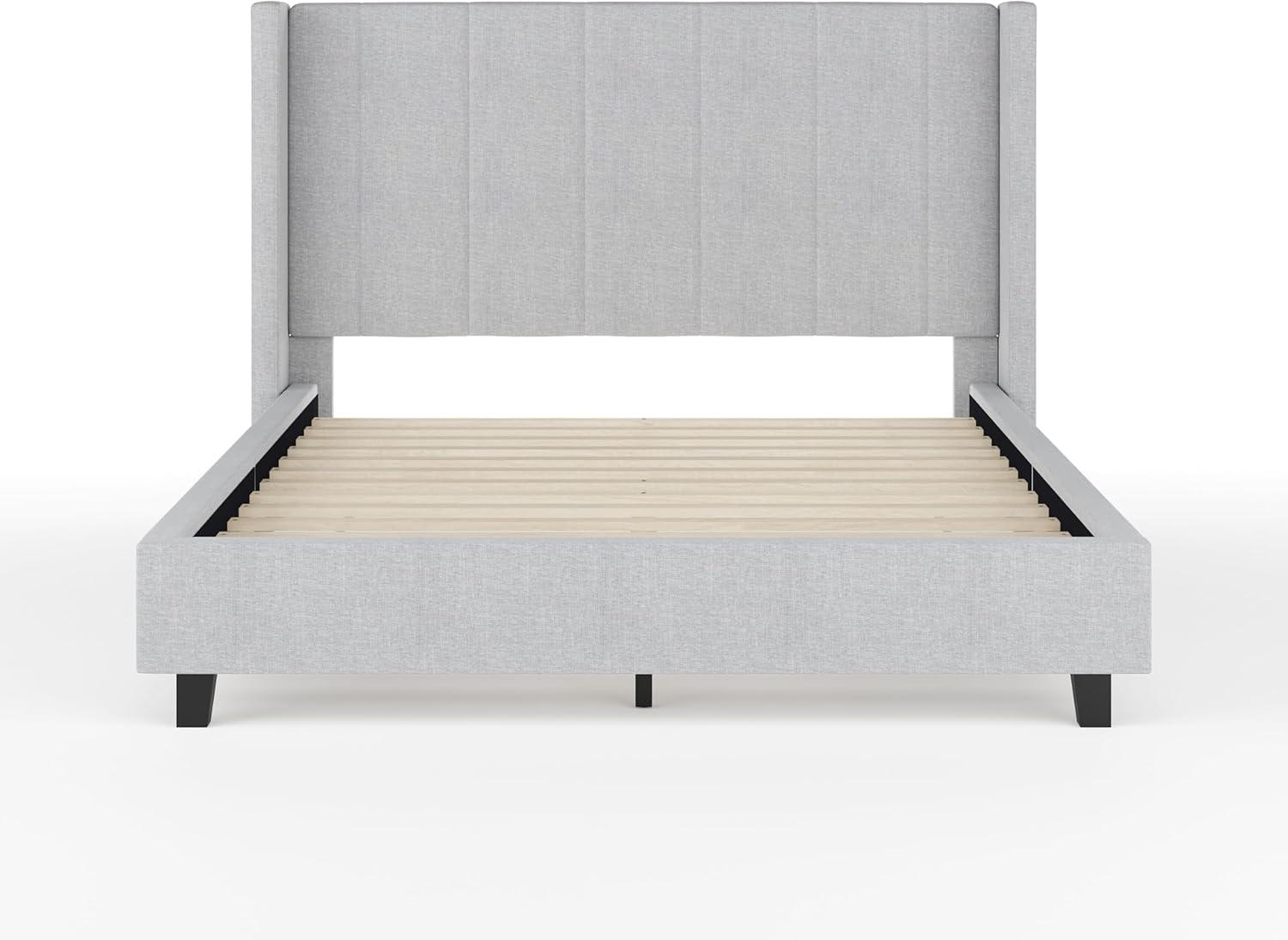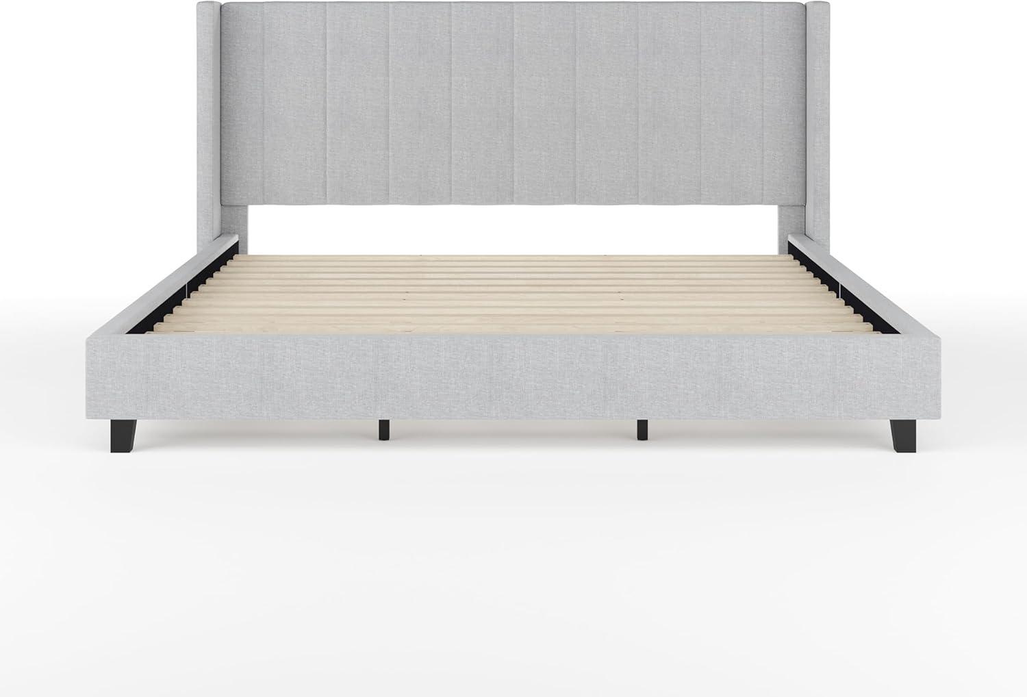 Martha Stewart Kay Low Profile Platform Bed with Wingback Headboard, Channel Stitched Faux Linen Upholstery, No Box Spring Needed, Full, Beige(Gray Fabric/Black Legs)