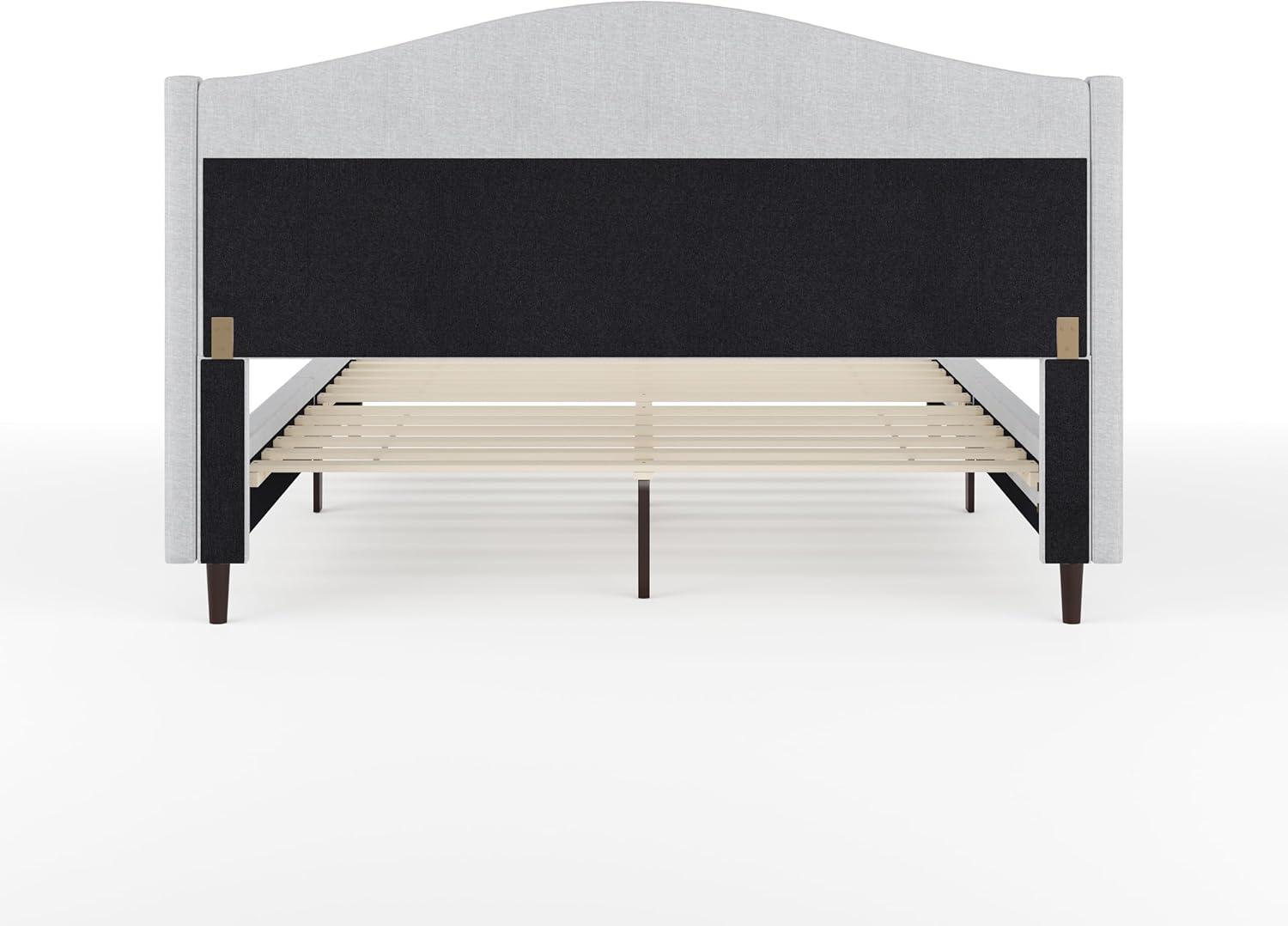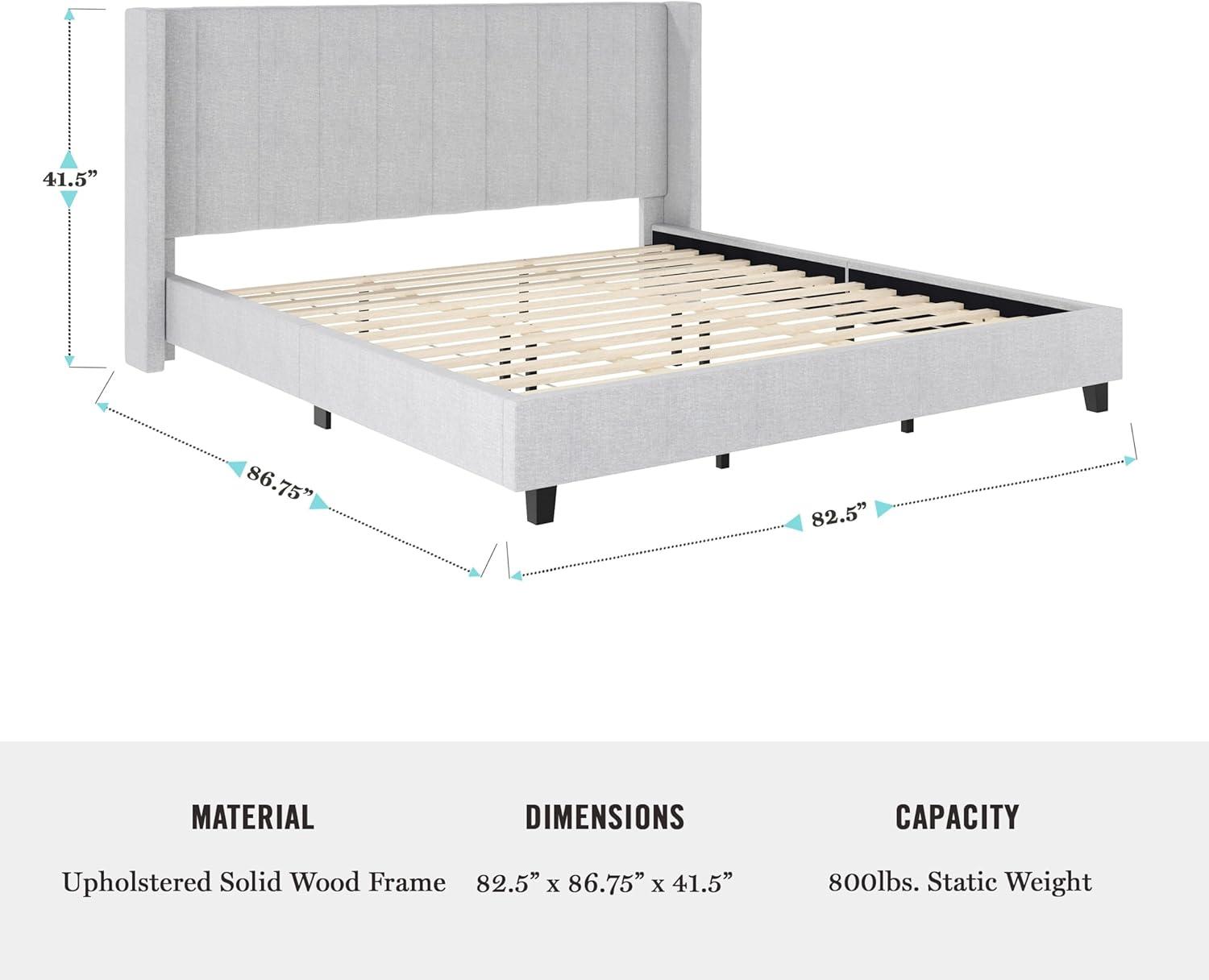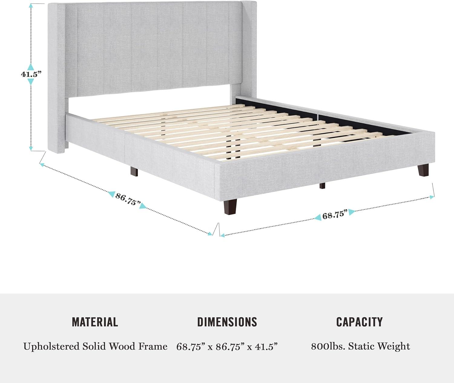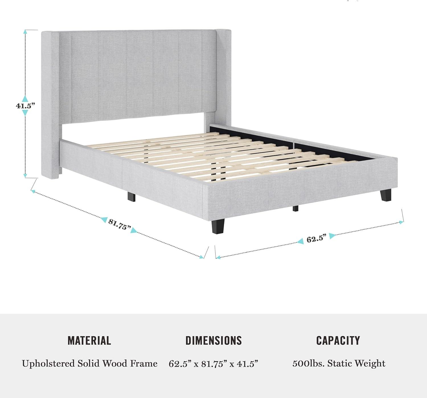 Martha Stewart Kay Low Profile Platform Bed with Wingback Headboard, Channel Stitched Faux Linen Upholstery, No Box Spring Needed, Full, Beige(Gray Fabric/Black Legs)