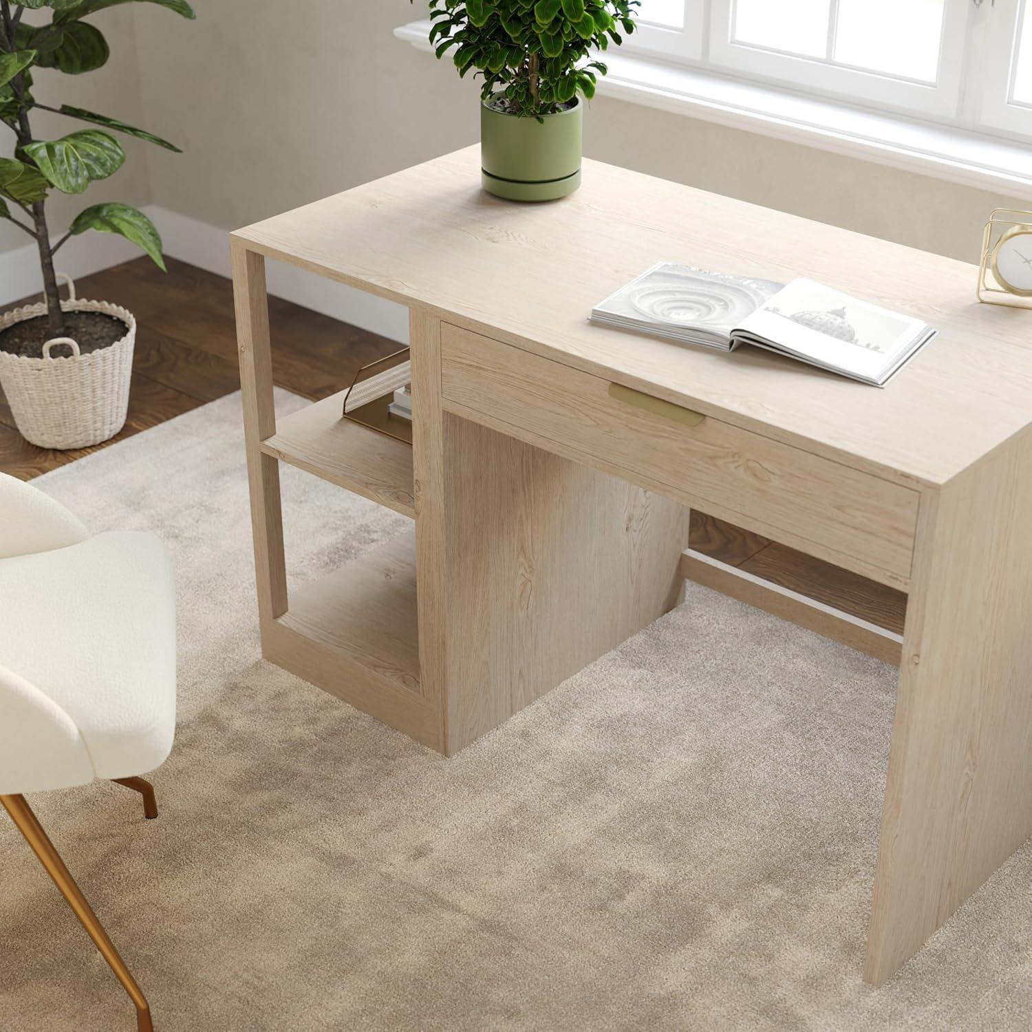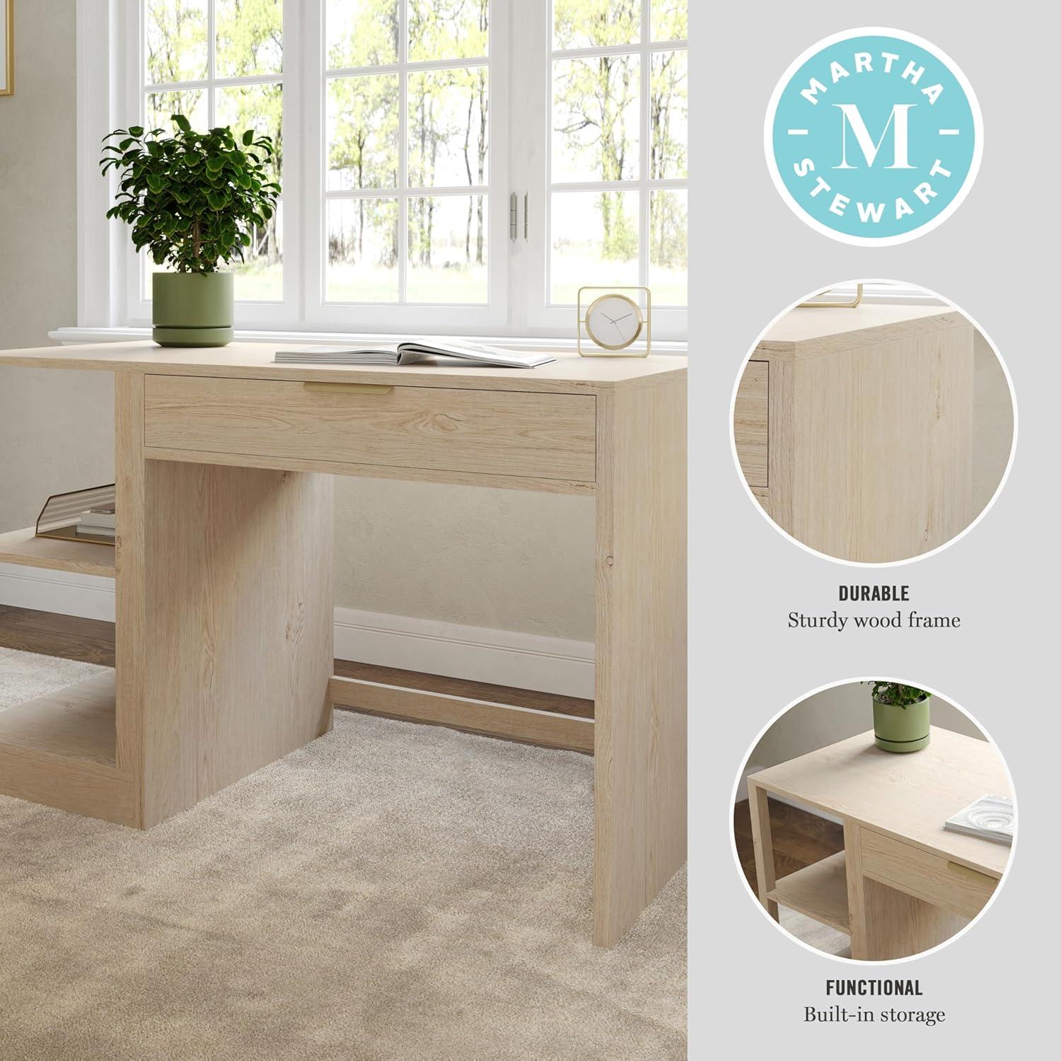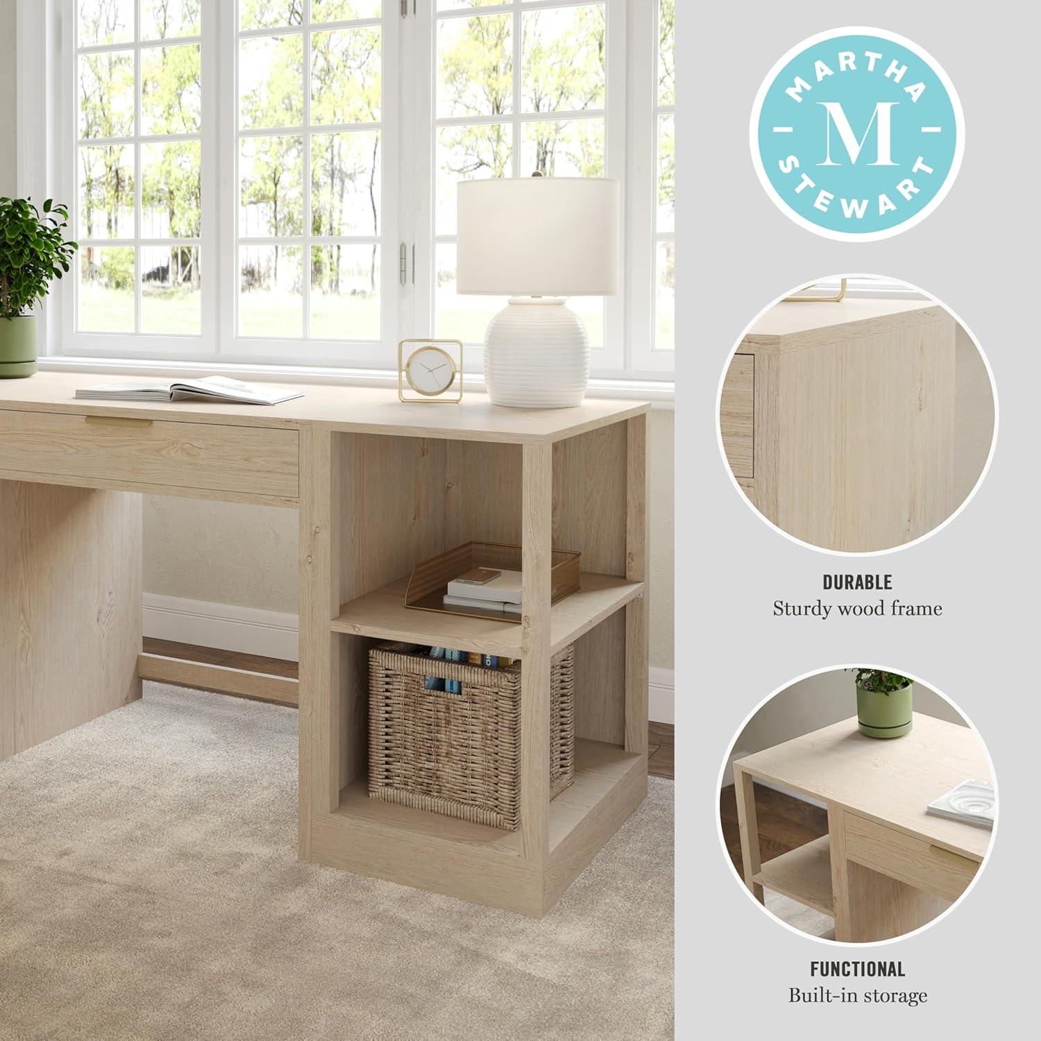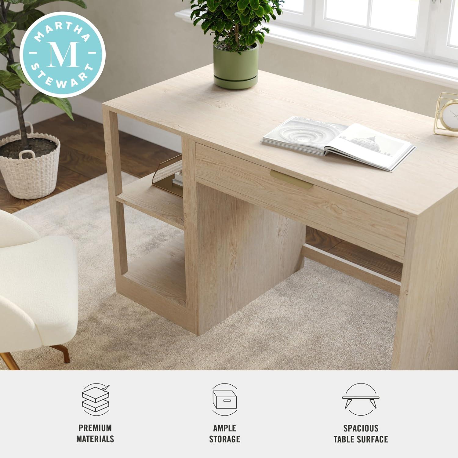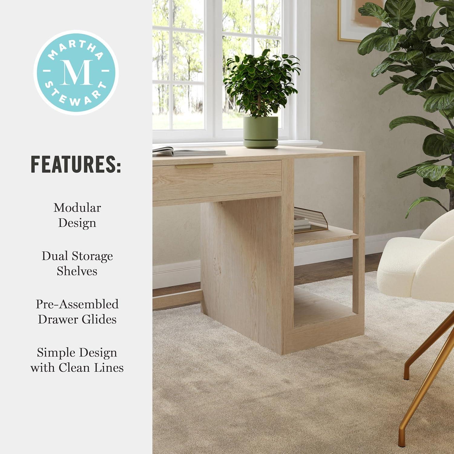 Elevate your home office with the functionality and sophistication of the Martha Stewart Kayden Home Office Desk and Dual Two-Tier Shelves. A simple yet stunning design, highlighted by clean lines and complementary hardware, enhances any creative headquarters with eye-catching charm. A center pull-out desk drawer along with two shelves, each with two tiers of open storage, provide ample space for supplies or dcor and allow you to effortlessly keep your work surface clean and organized. Part of our modular collection, this three-piece set can be used alone or further enhanced with an additional desk or file cabinet to craft a custom arrangement that fits any workspace's needs. Drawer glides are pre-assembled to save time during assembly, which is made easy with the included step-by-step instructions and cleanup is easily accomplished with a damp cloth.