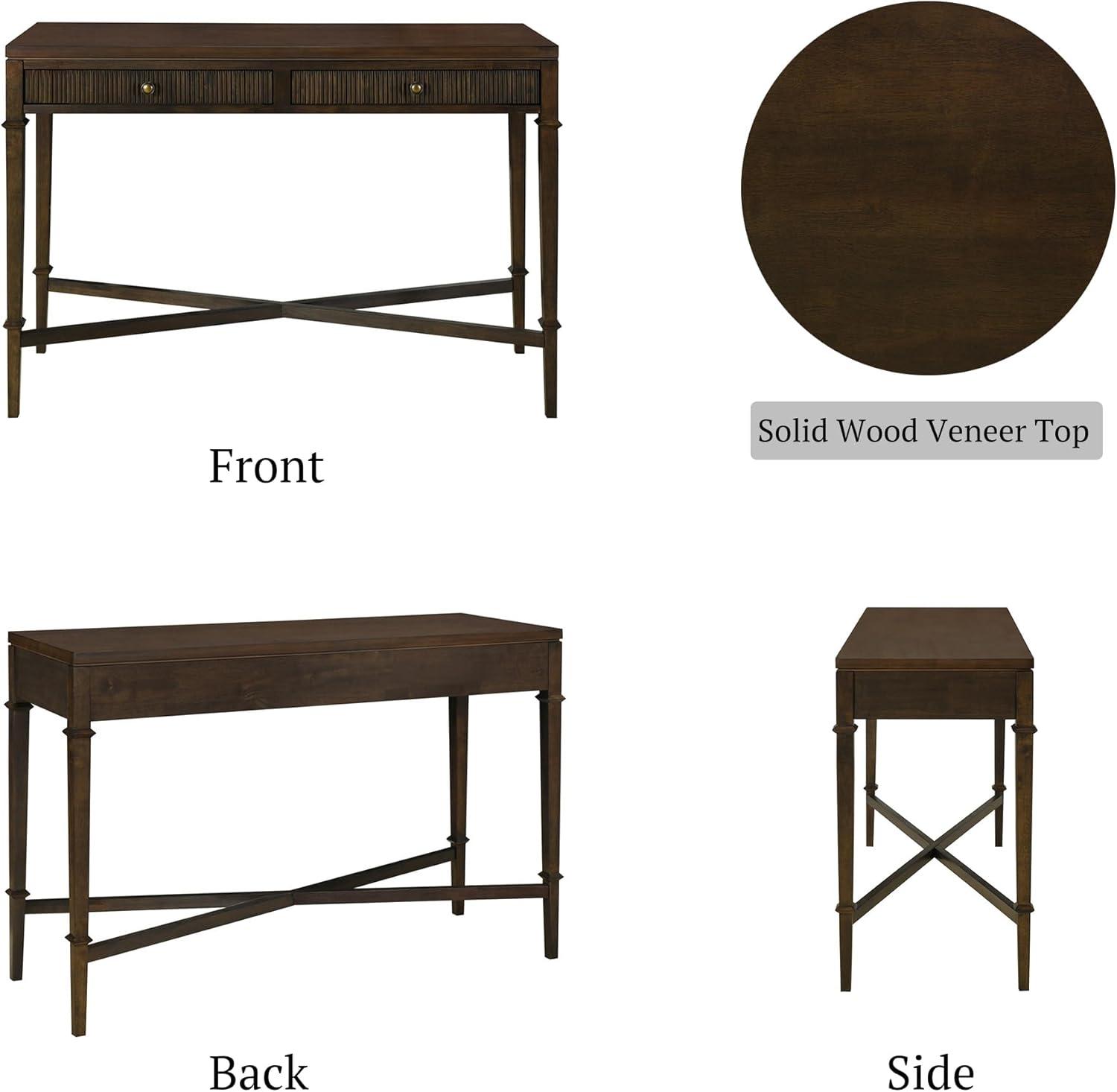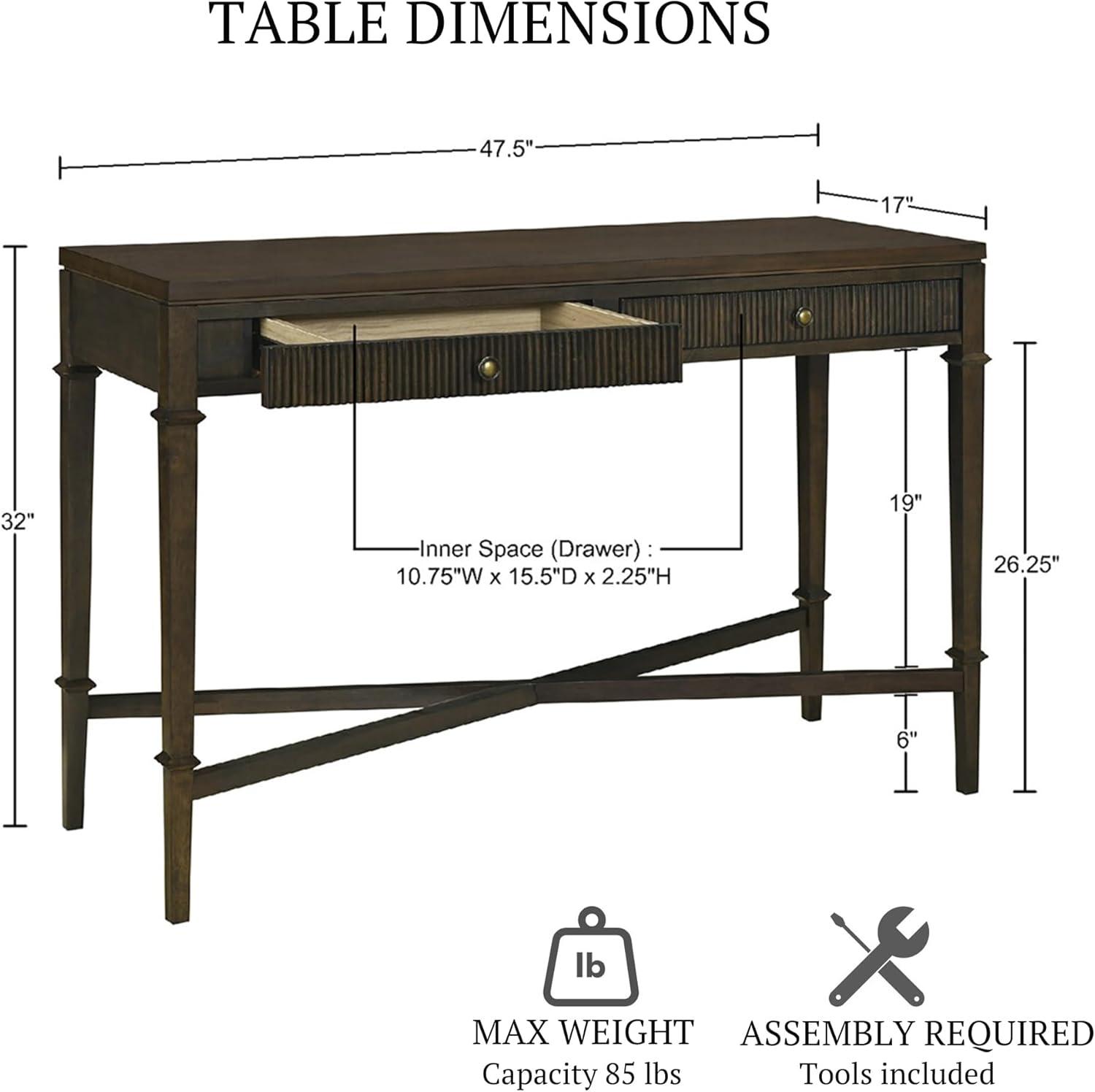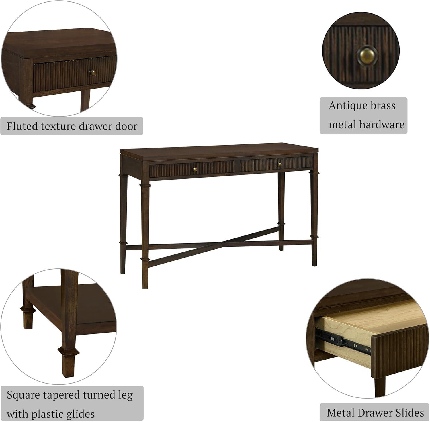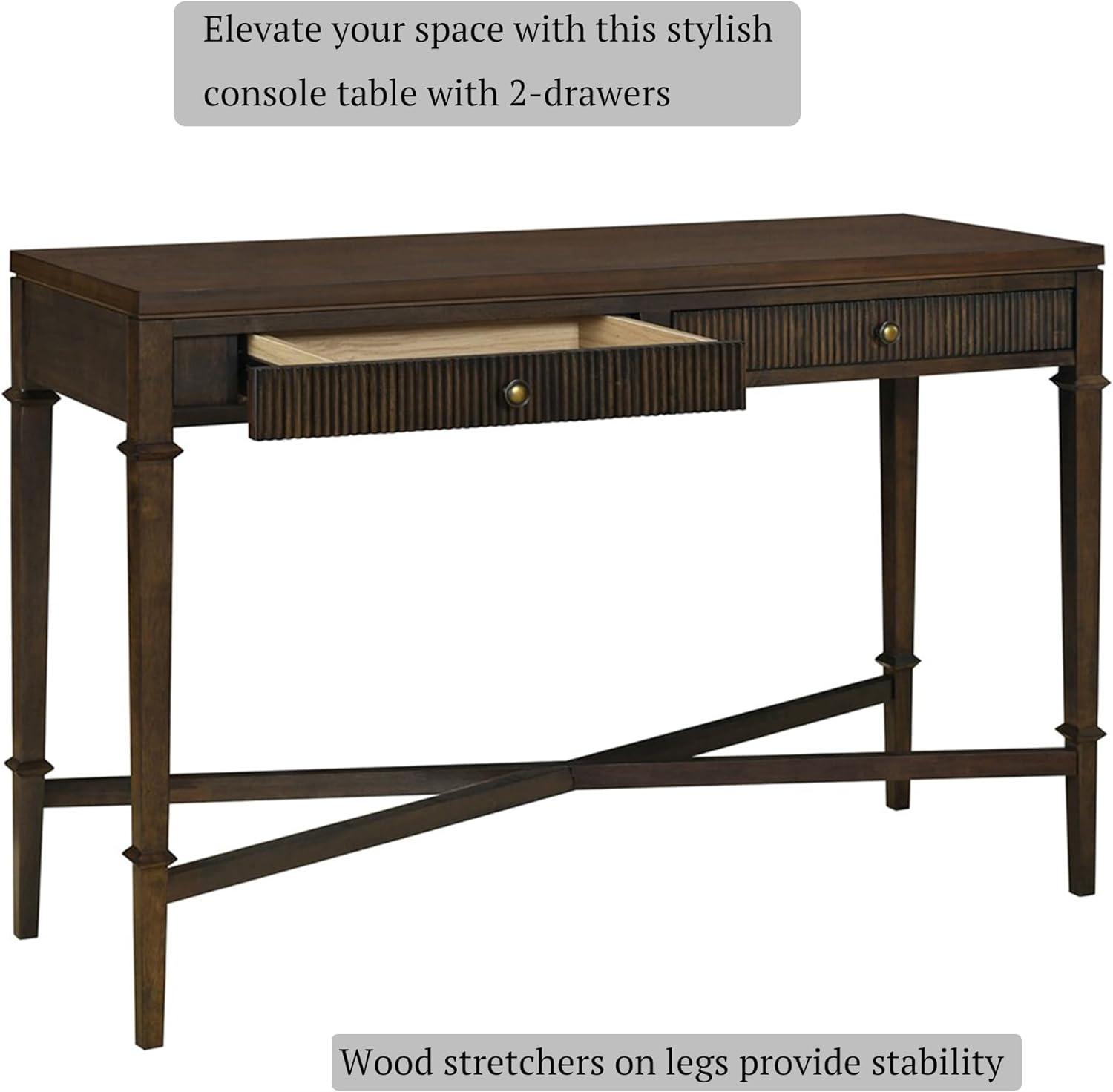 This modern coastal console table offers practical 2-drawer storage with sophisticated fluted faces for added texture. Accented by traditional antique brass metal hardware and tapered turned leg styling in a classic dark brown finish