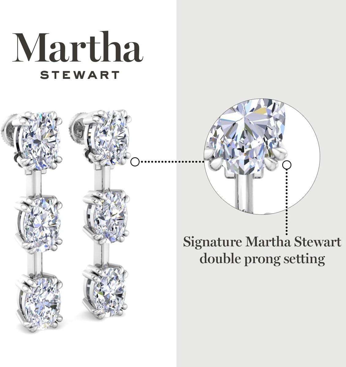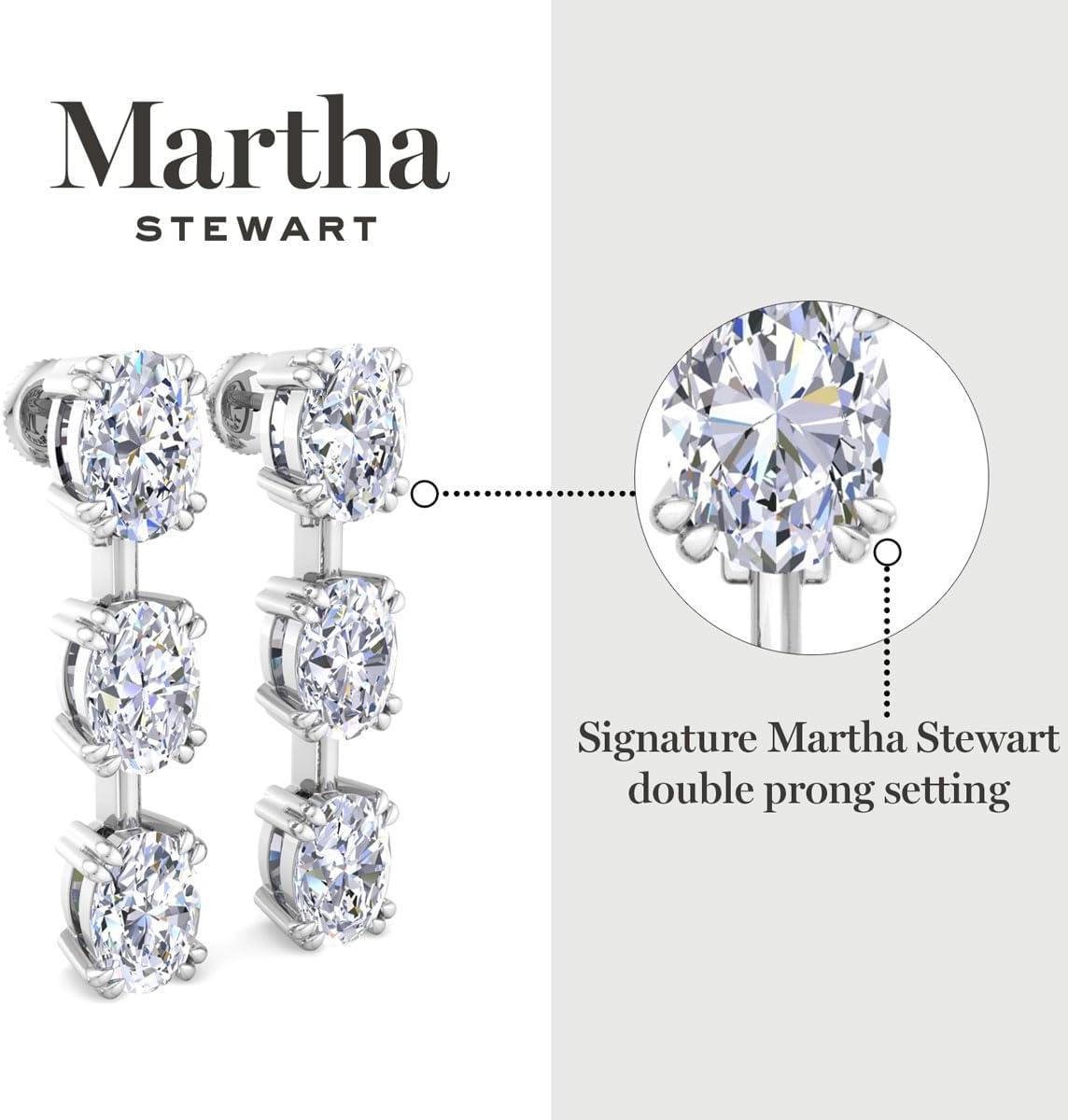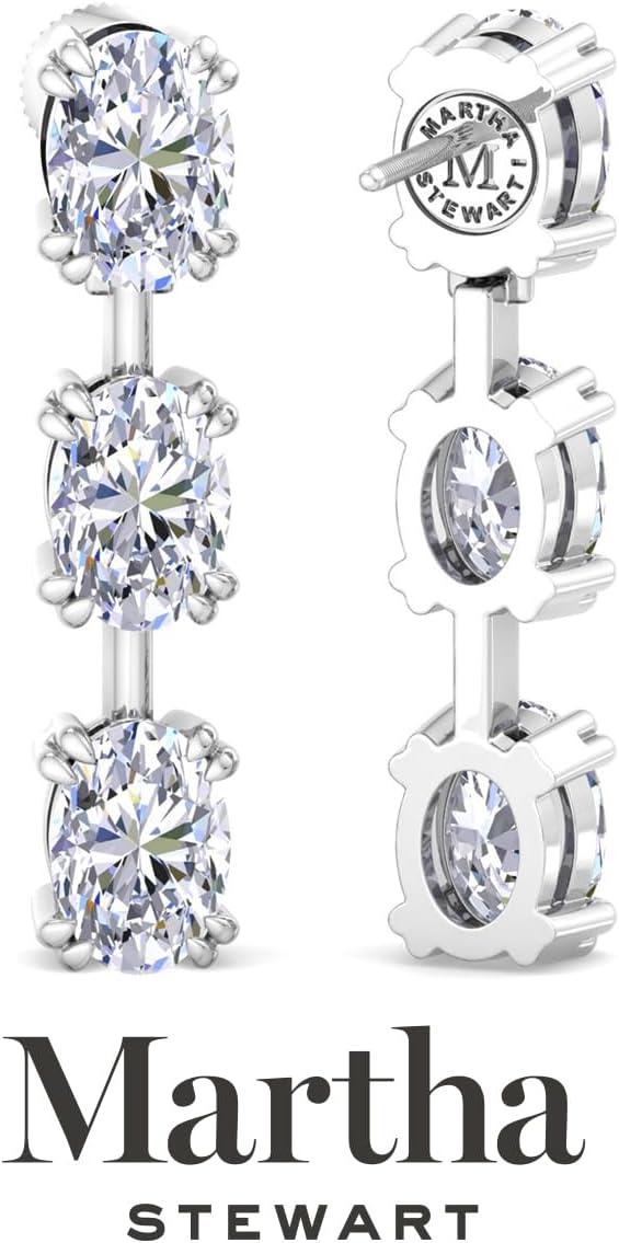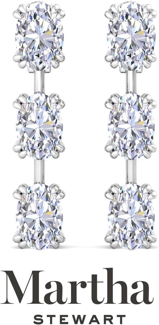 Showcasing class, style and timeless sophistication, the Martha Stewart fine jewelry collection is here to be celebrated. These Martha Stewart lab grown diamond earrings feature six oval shape lab grown diamonds in G-H color, VS clarity. Total carat weight is 3 or 5 carats. These earrings are available in 14 karat white and yellow gold and have post with friction backs. These earrings are set in the signature Martha Stewart double-prong setting and dangle down over 1 inch! Whether worn for a special event or to enhance everyday elegance, these earrings are sure to become cherished heirlooms. Martha Stewart’s attention to detail and dedication to quality shine through in every piece, making this collection a celebration of refined craftsmanship and timeless beauty.