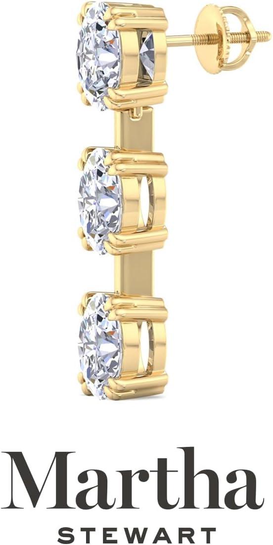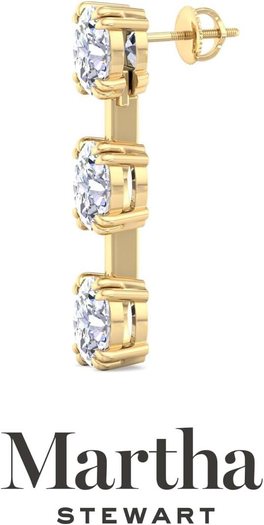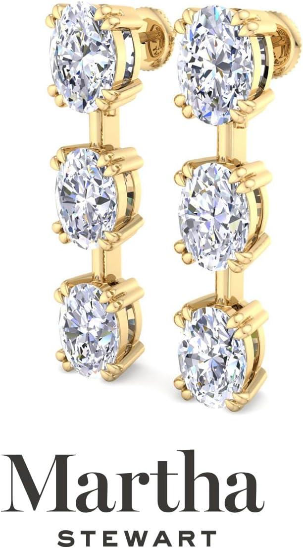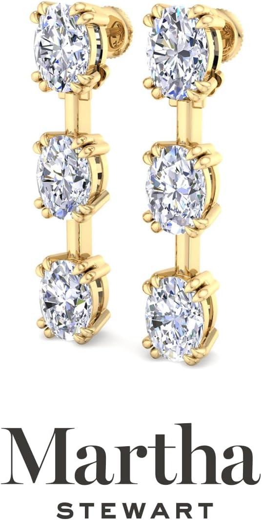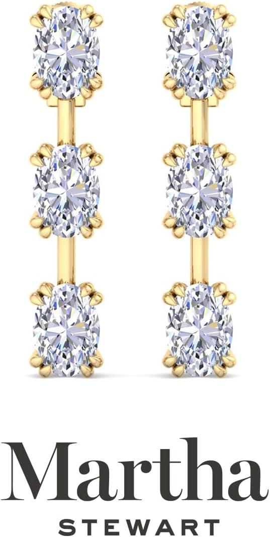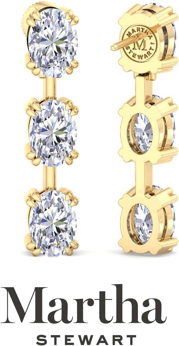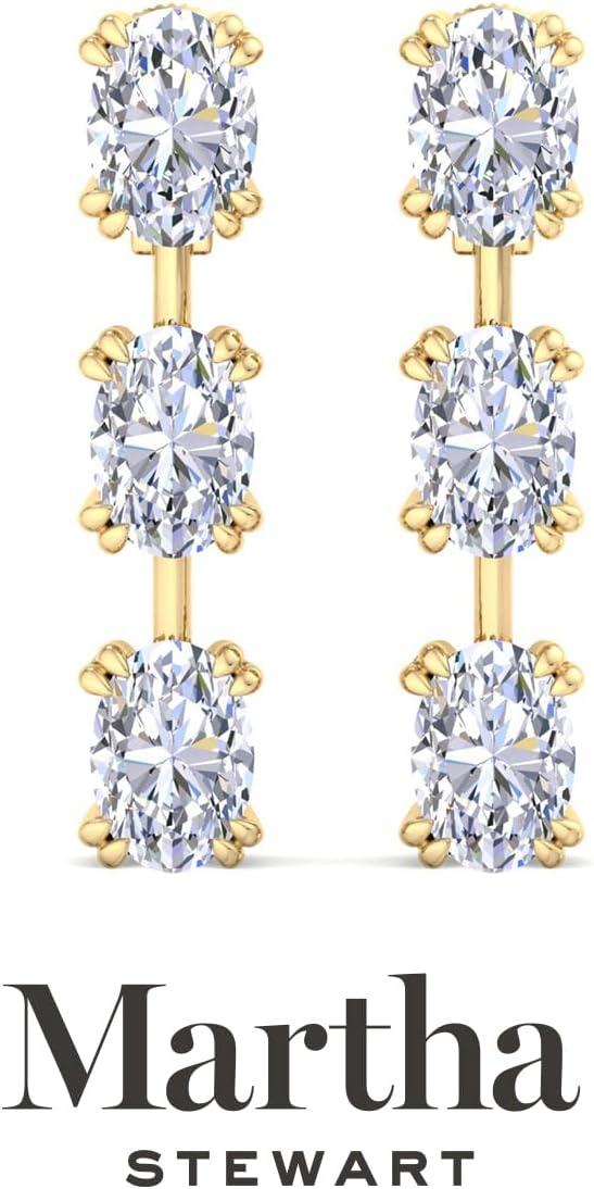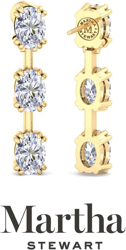 Showcasing class, style and timeless sophistication, the Martha Stewart fine jewelry collection is here to be celebrated. These Martha Stewart lab grown diamond earrings feature six oval shape lab grown diamonds in G-H color, VS clarity. Total carat weight is 3 or 5 carats. These earrings are available in 14 karat white and yellow gold and have post with friction backs. These earrings are set in the signature Martha Stewart double-prong setting and dangle down over 1 inch! Whether worn for a special event or to enhance everyday elegance, these earrings are sure to become cherished heirlooms. Martha Stewart’s attention to detail and dedication to quality shine through in every piece, making this collection a celebration of refined craftsmanship and timeless beauty.