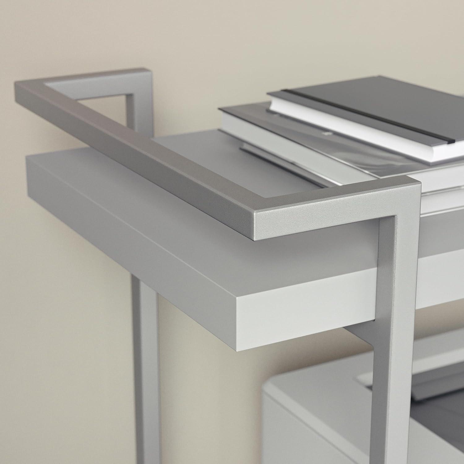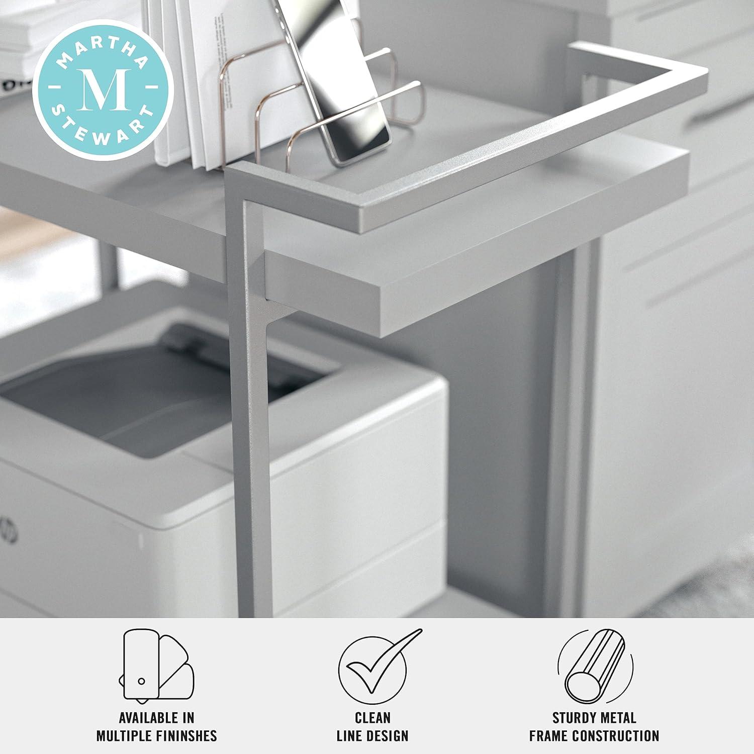 The Martha Stewart Liam 2 Tier Mobile Printer Cart allows you to effortlessly and conveniently transport your office accessories to wherever you're working and roll them out of the way when you need the space. Boasting two sturdy engineered wood shelves in a timeless gray finish and an offset steel frame in brushed nickel, this moveable storage solution lends modern sophistication to any home office area. Locking casters keep the cart in place and make for a smooth transfer when it's time to move your supplies. Assembly is quick and easy with the included tools and step-by-step instructions.