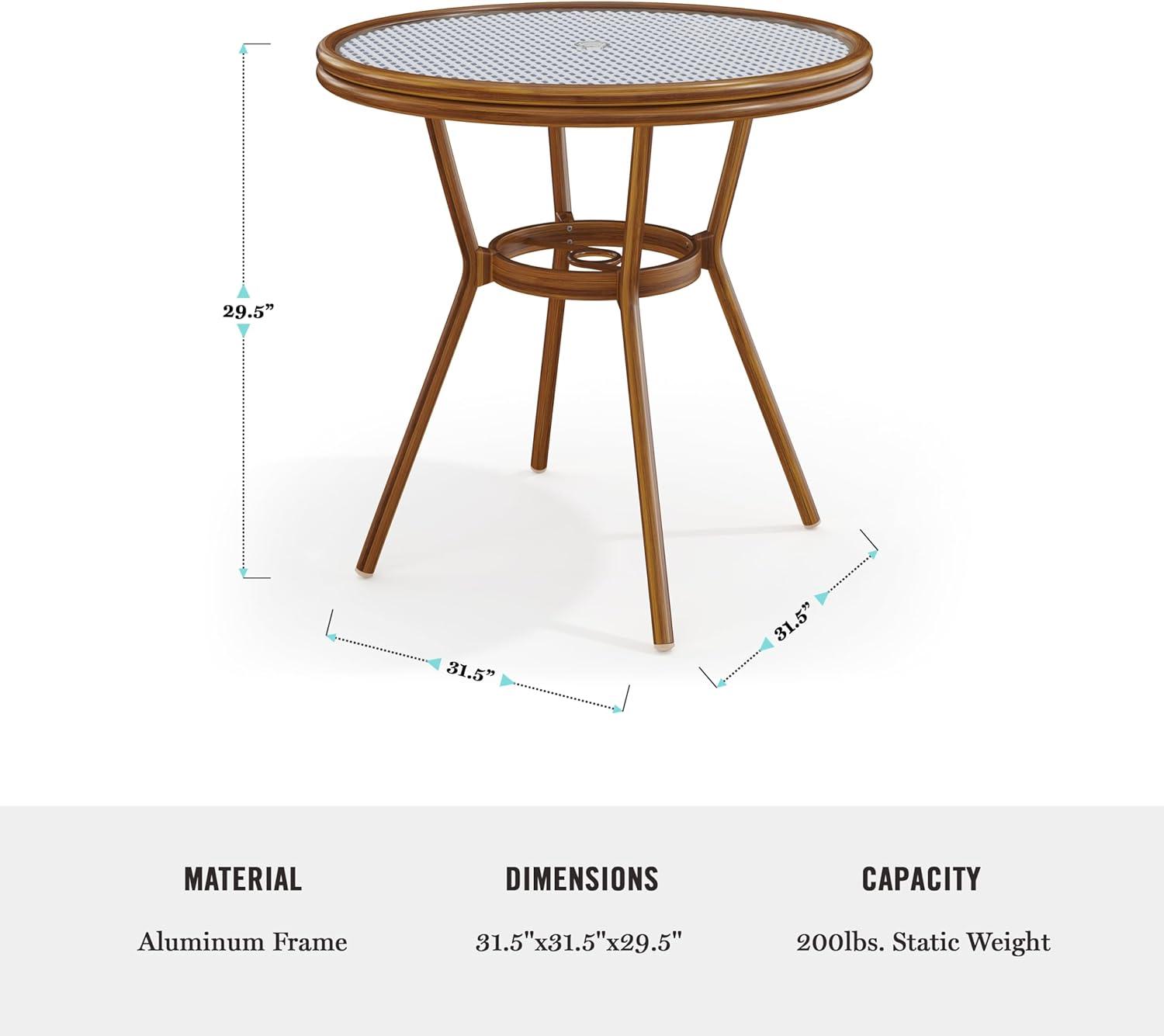 Martha Stewart Lily Pond 31” Round Indoor-Outdoor Bistro Dining Table with Aluminum Frame in Gray Woodgrain and Rattan Top in White/Gray with Tempered Glass Top(Navy & White/Natural Frame)