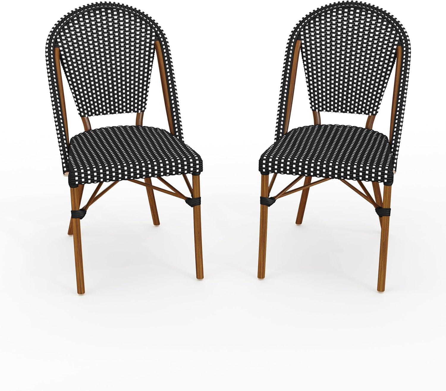 Martha Stewart Lily Pond Indoor-Outdoor Stackable Aluminum Bistro Chair with Gray Woodgrain Frame Finish and White/Gray Woven Rattan Backrest and Seat(Black & White/Natural Frame)