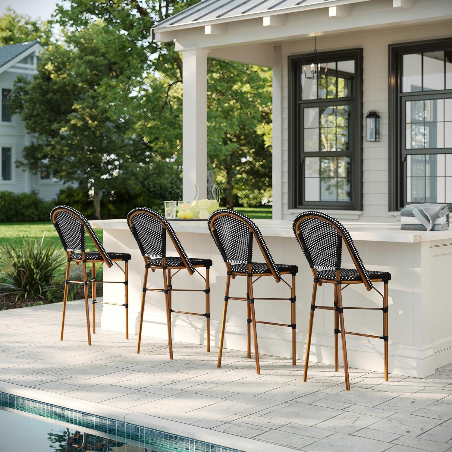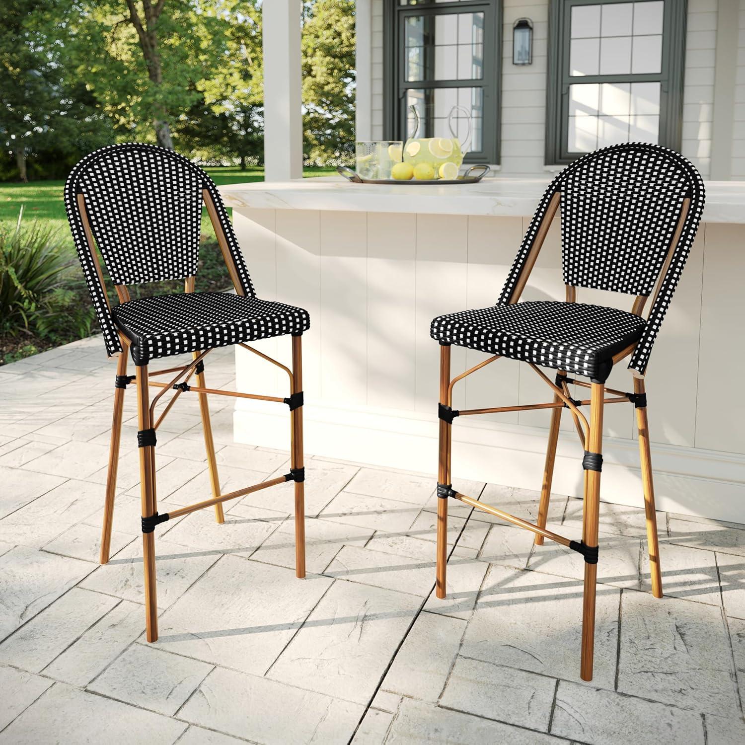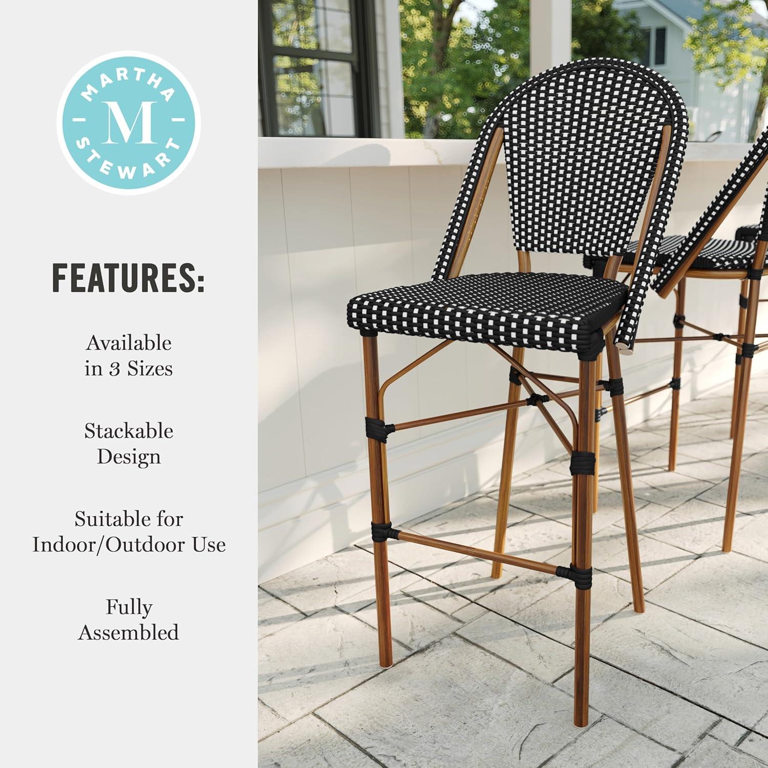 Martha Stewart Lily Pond Indoor-Outdoor Stackable Bar Stools with Gray Woodgrain Aluminum Frame Finish, White/Gray Woven Rattan Backrests and Seats, Set of 2(Black & White/Natural Frame)