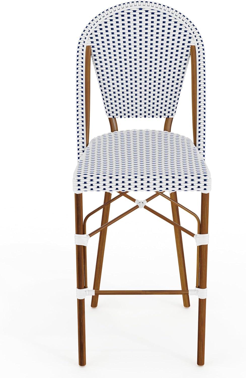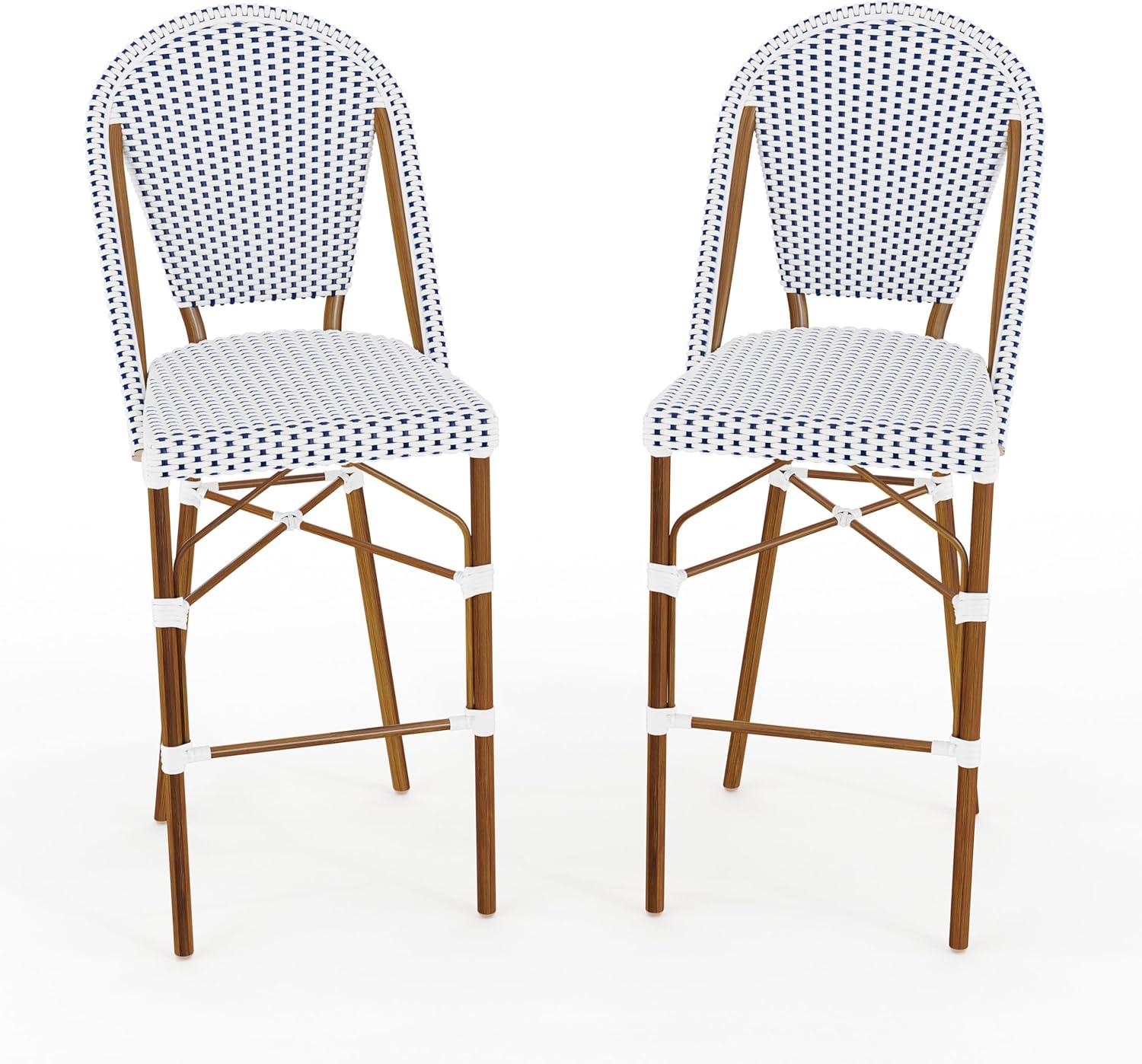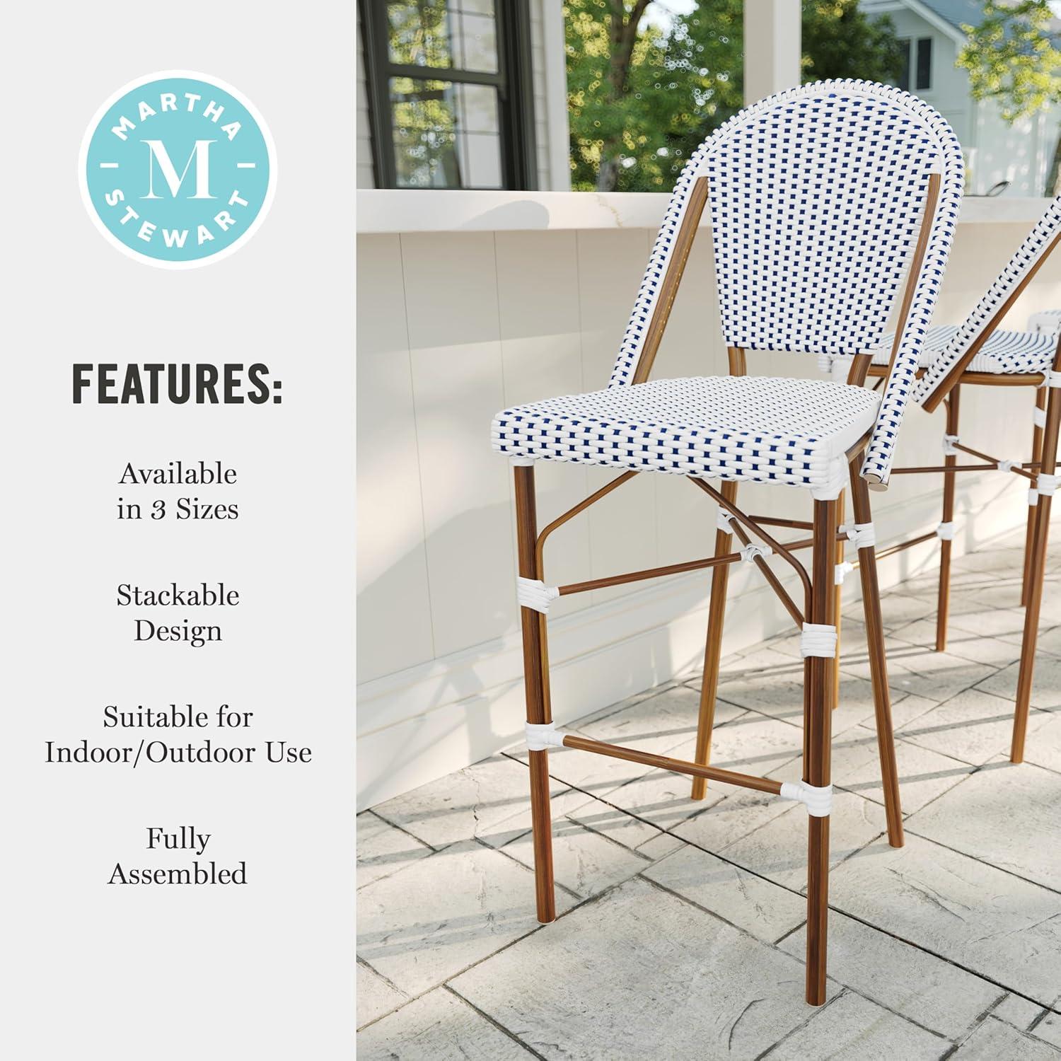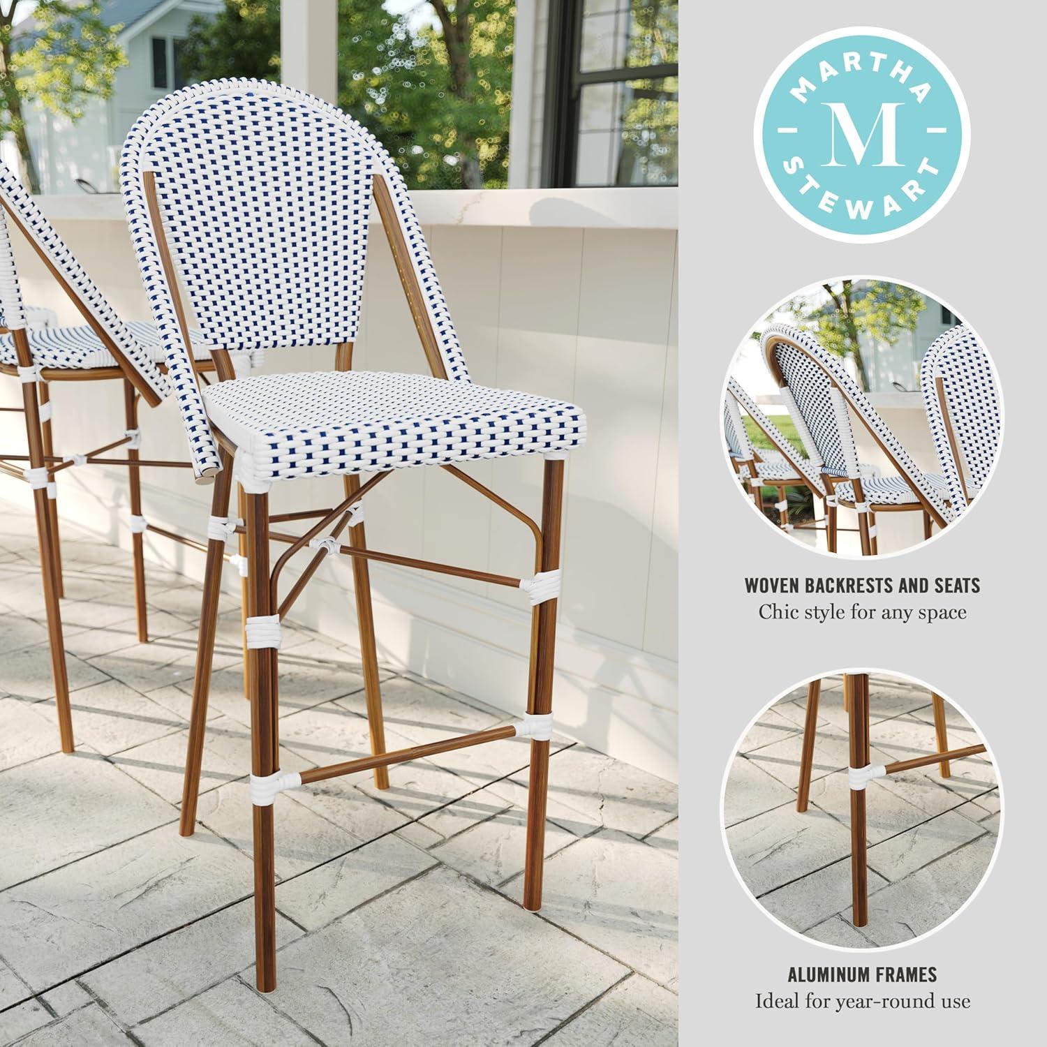 Martha Stewart Lily Pond Indoor-Outdoor Stackable Bar Stools with Gray Woodgrain Aluminum Frame Finish, White/Gray Woven Rattan Backrests and Seats, Set of 2(Navy & White/Natural Frame)