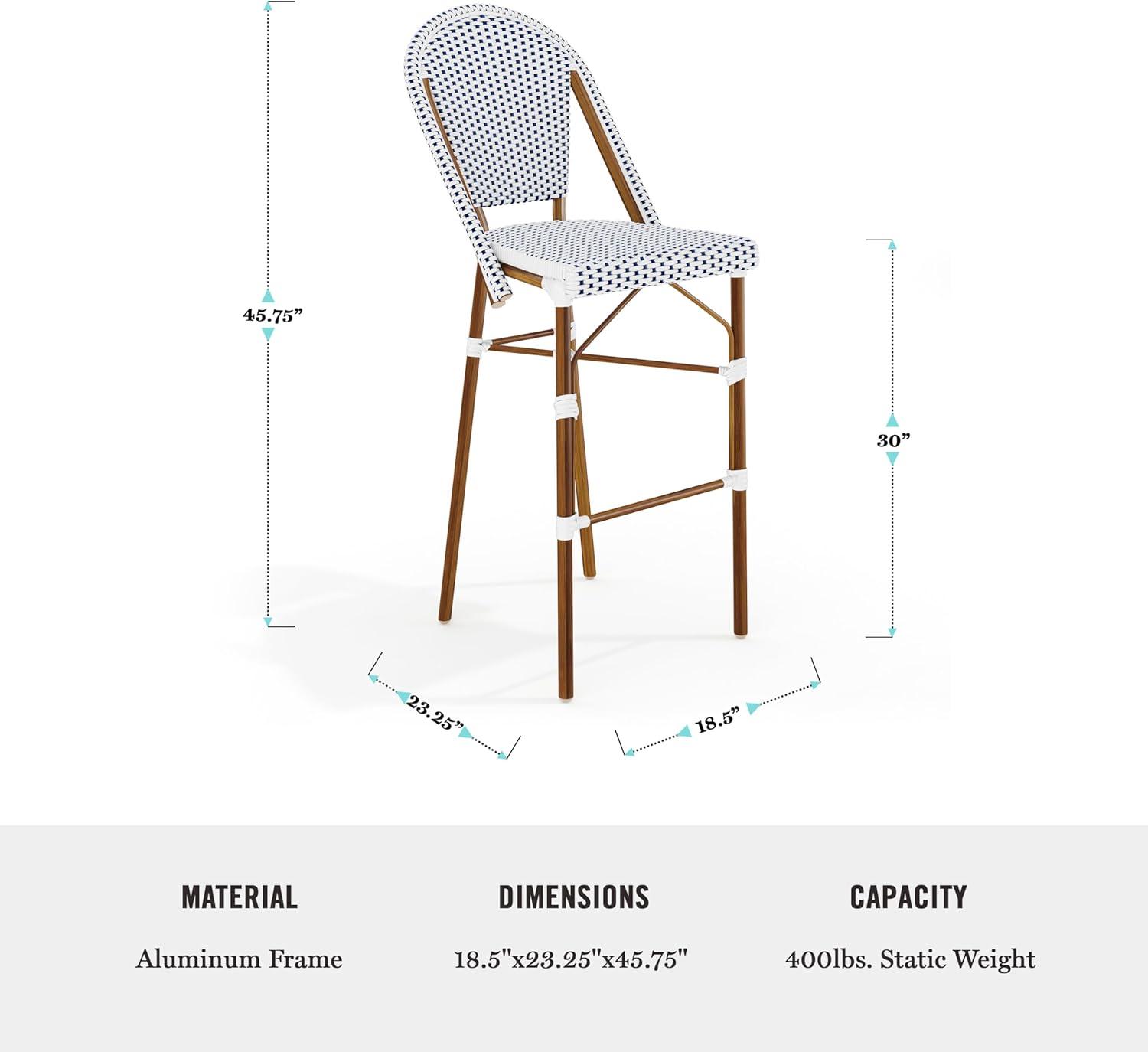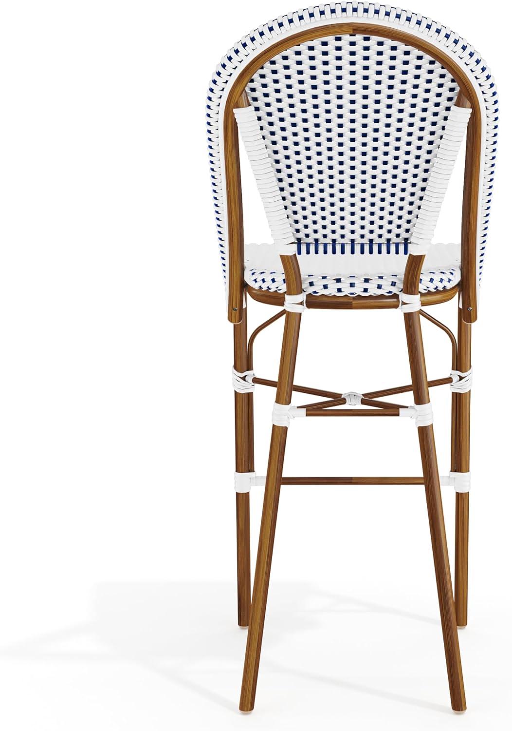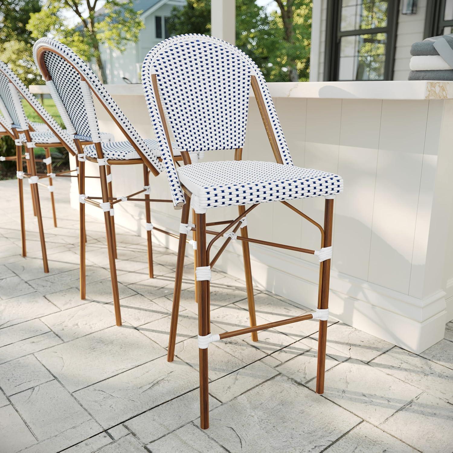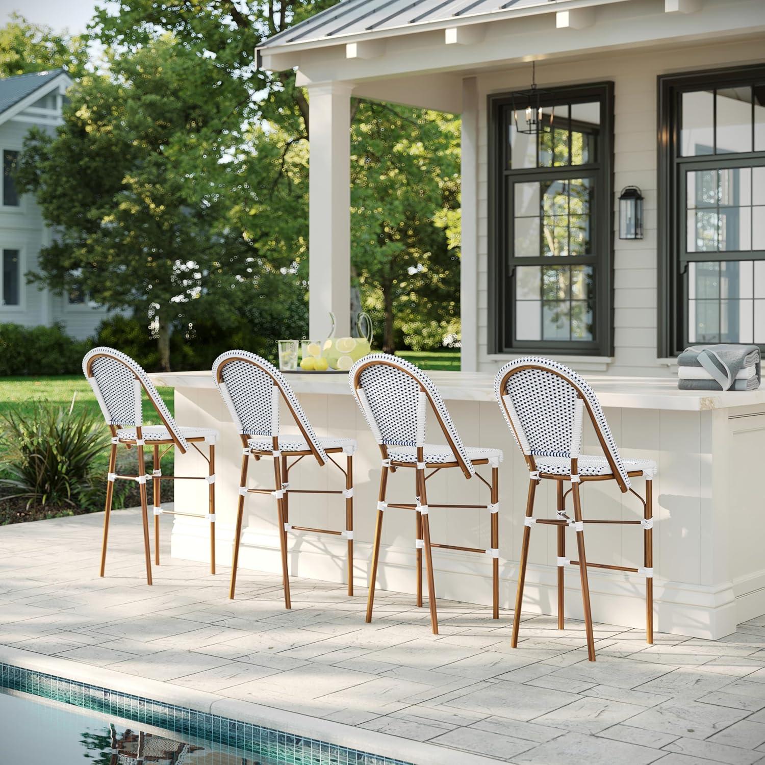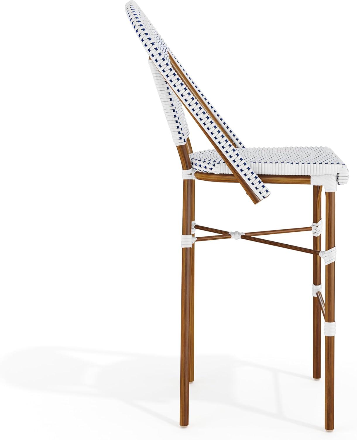 Martha Stewart Lily Pond Indoor-Outdoor Stackable Bar Stools with Gray Woodgrain Aluminum Frame Finish, White/Gray Woven Rattan Backrests and Seats, Set of 2(Navy & White/Natural Frame)