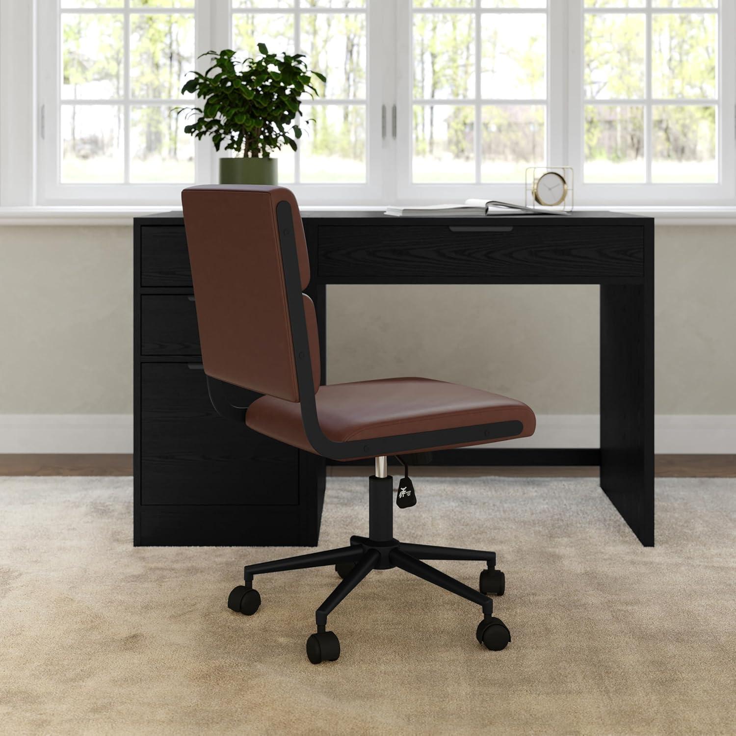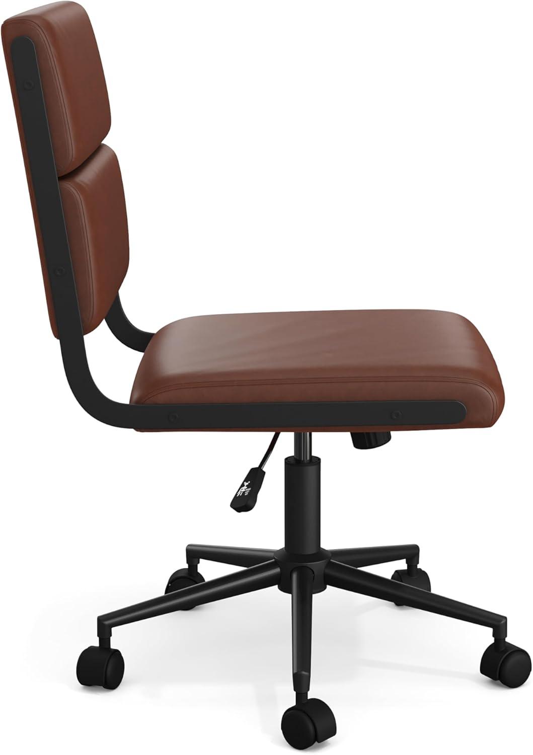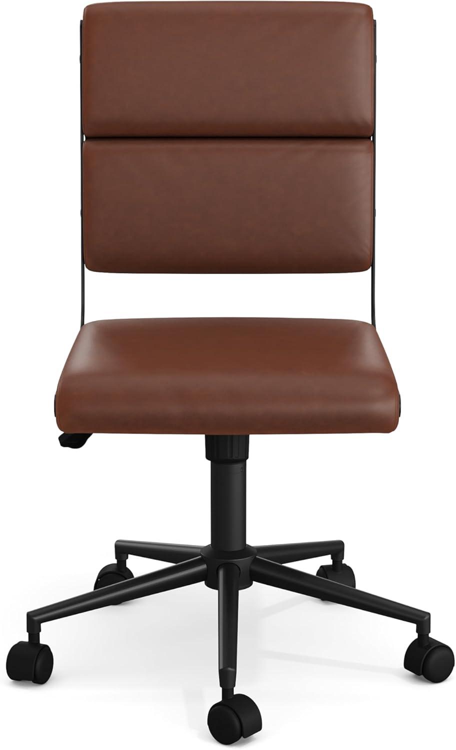 Bring a modern aesthetic to your homes corporate nook with the Martha Stewart Lulu Office Chair. The sleek, armless design adds a chic touch to any home workspace and fits perfectly with most desks, streamlining your layout and keeping your space tidy and neat. A gorgeous faux leather upholstery adorns the back and seat, complemented by metallic side accents and frame with a polished brass finish to deliver an understated charm. Take on every workday in comfort with the seats tilt functionality and pneumatic, multi-position, height-adjust lift that help you find just the right position. Plus, the 360 swivel seat and dual wheel casters allow you to move around your home command center hassle-free. Assembly is easy with the included tools and step-by-step instructions and keeping your chair looking pristine is easy by wiping clean with a dry cloth.