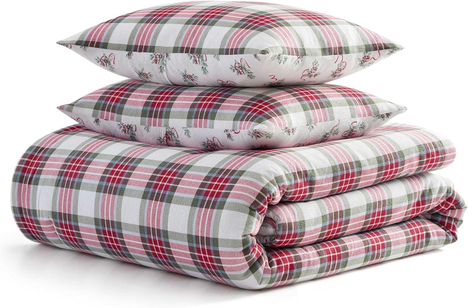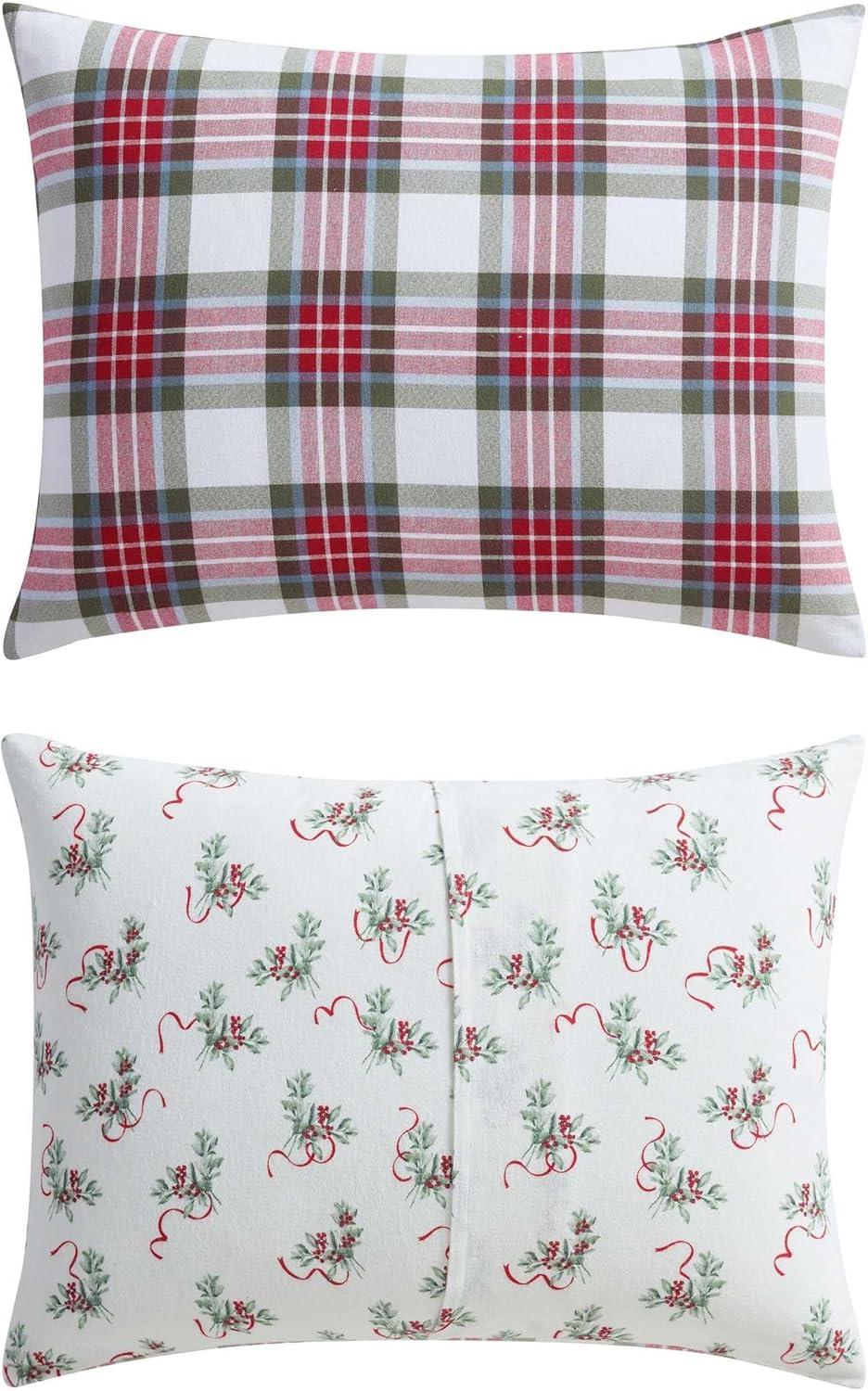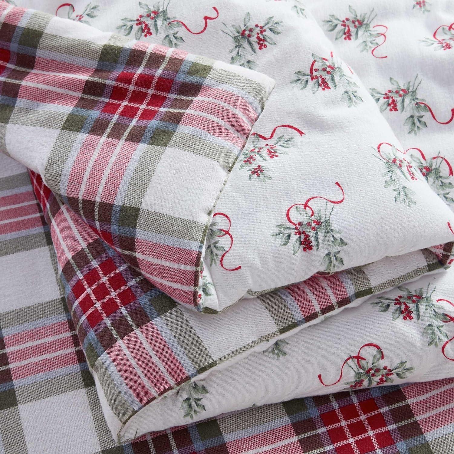 The Martha Stewart yuletide spruce plaid flannel comforter set brings cozy warmth and festive style to your home this season. Crafted from 100% cotton flannel, this comforter is soft, breathable, and perfect for layering through the holidays and into the colder months. The front features a classic red and green plaid pattern, a timeless symbol of holiday cheer, while the reverse side showcases delicate holly sprigs, each tied with a festive red ribbon, set against a clean white backdrop. Whether adorning a guest room or creating your own winter retreat, this reversible design offers the perfect combination of comfort, charm, and the signature elegance of Martha Stewart.