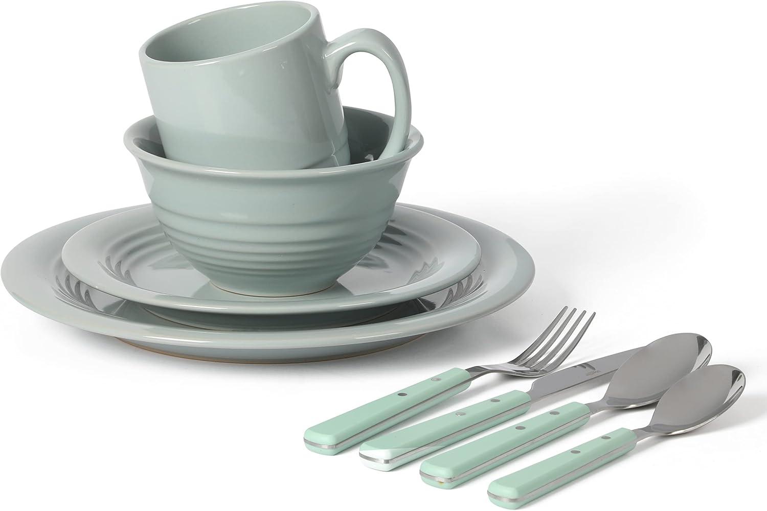 Martha Stewart Reedley 32 Piece Stoneware Dinnerware and Flatware Combo Set – Linen White(Blue)