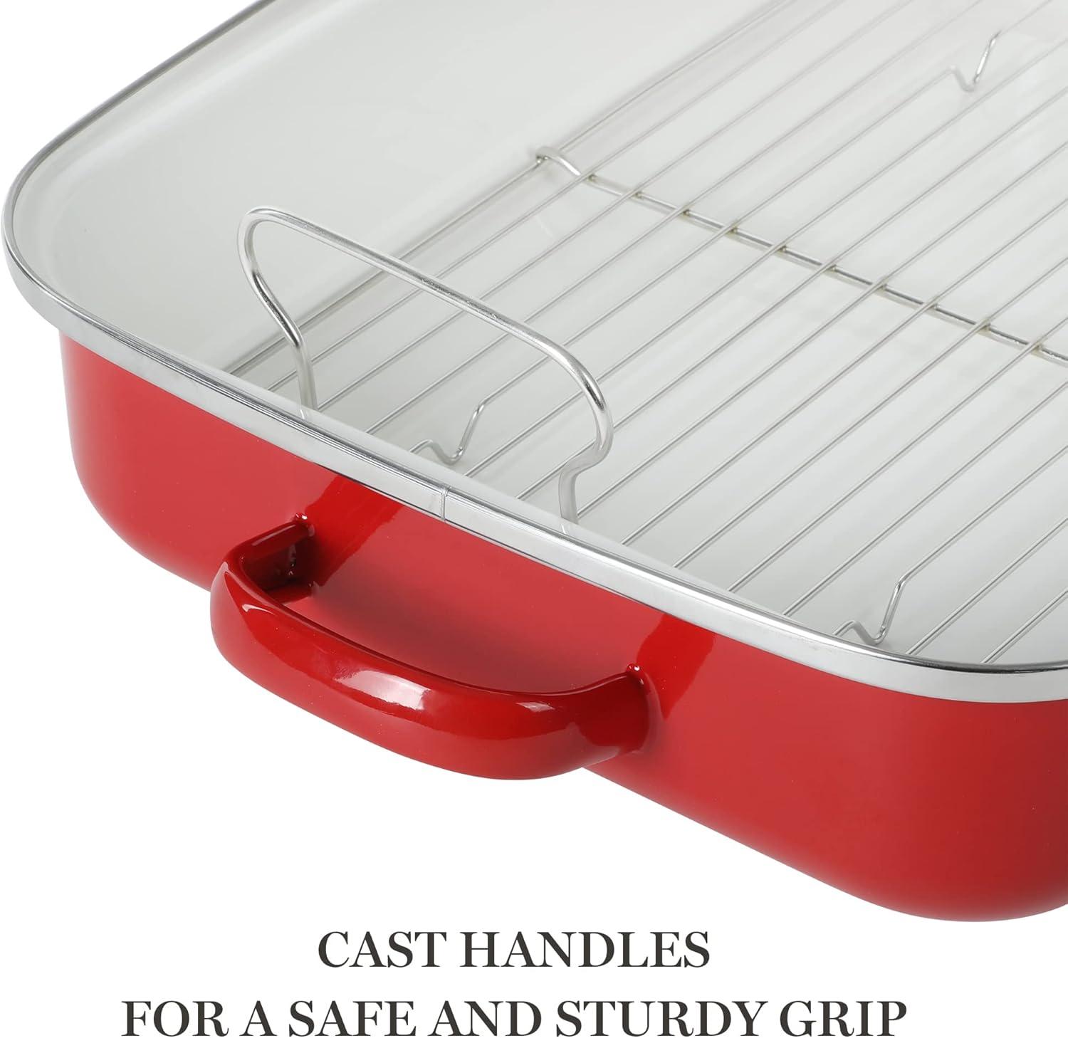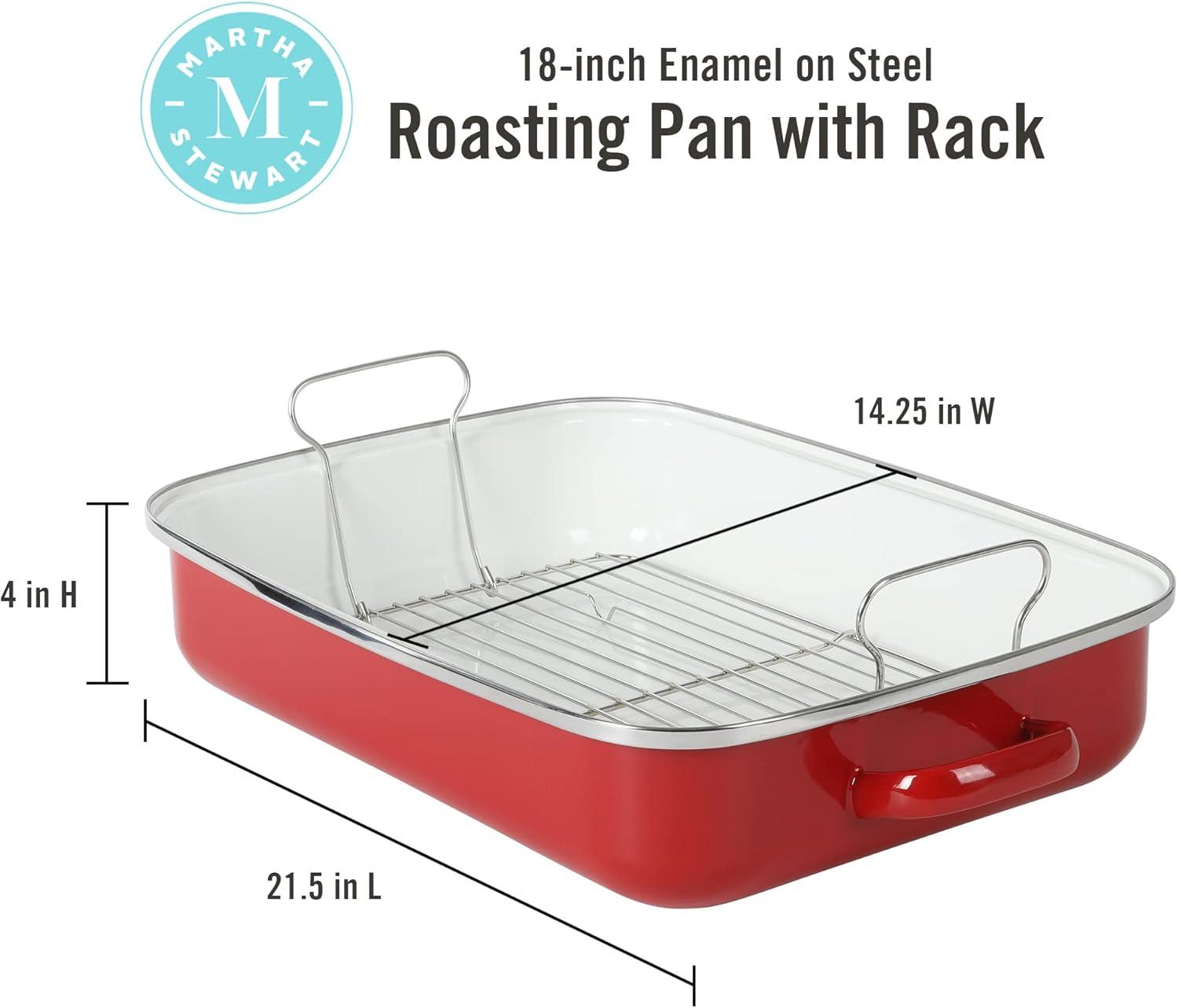 Martha Stewart Thayer 16″ Enamel On Steel Roaster Pan w/Stainless Steel Rack – Martha Blue(Red)