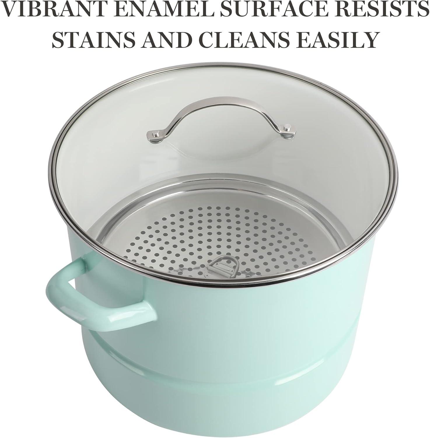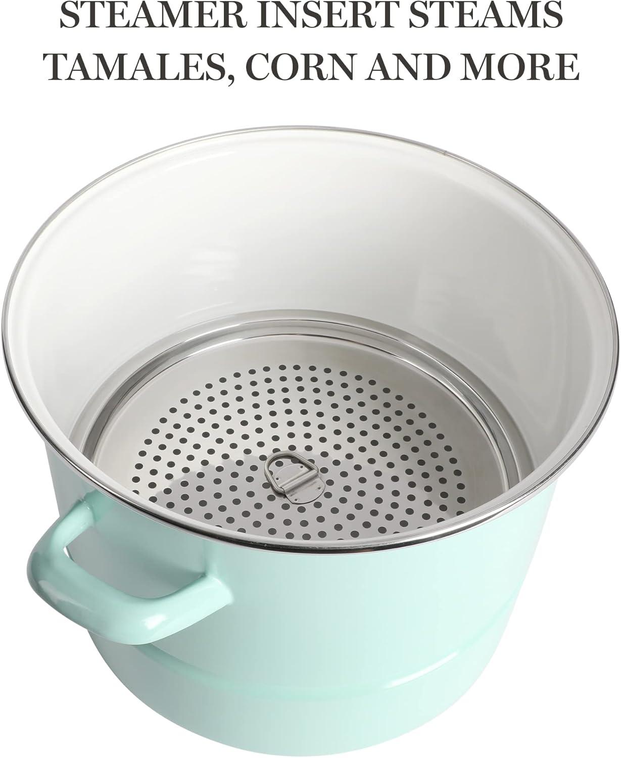 Multi-pots are a great addition to any home kitchen. The Thayer 8-quart Enamel on Steel Stock Pot with Lid and Steamer Insert is a sturdy piece of cookware that prepares and delivers good and generous amounts of soups, stocks, stews, and more. Crafted from durable steel, it promotes uniform heat distribution throughout its beautifully-enameled, stain-resistant vessel. The enamel finish makes cleanup a breeze to help you spend less time in the kitchen and bring your focus back to entertaining and mingling with your guests. With a 8-quart capacity and a spacious interior, this durable steel pot provides enough room for family-sized dishes. Cast side handles offer balance and support when lifting and transferring a heavy pot of shrimp boil, pasta, or chicken soup. Suitable to use on all kinds of stovetops, the multi-functional steel pot can also steam vegetables, corn, dumplings, and more. The vented, tempered glass lid provides visibility to monitor cooking progress. Oven safe up to 450°F. Hand wash only.