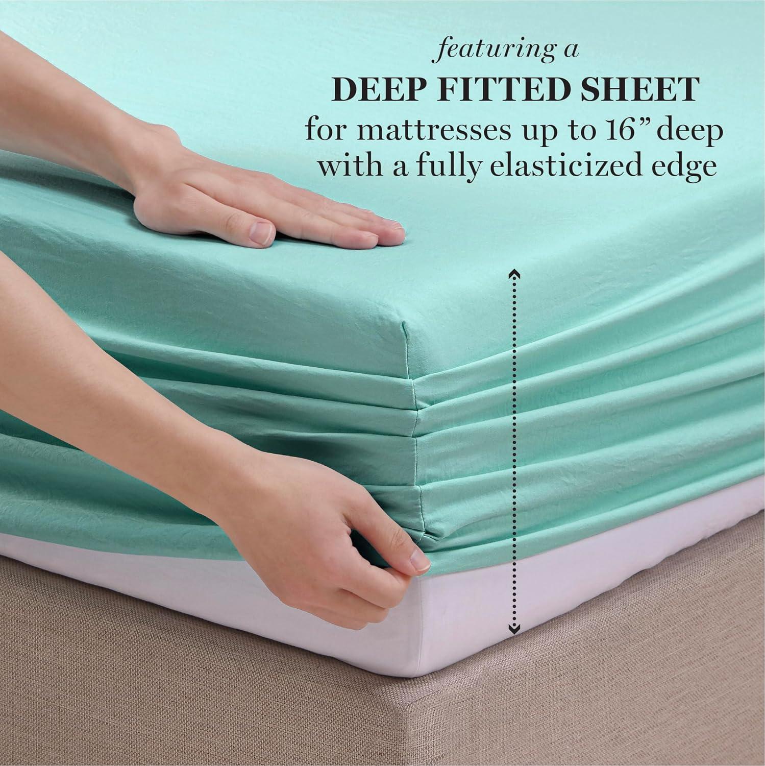 EASY CARE FEATURES ensure you can enjoy your comfortable sheet set, night after night. Fitted sheet is fully elasticized and fits mattresses up to 16″ deep. Machine-wash warm, normal cycle. Use only non-chlorine bleach when needed. Tumble-dry low and remove promptly. Warm iron when needed.