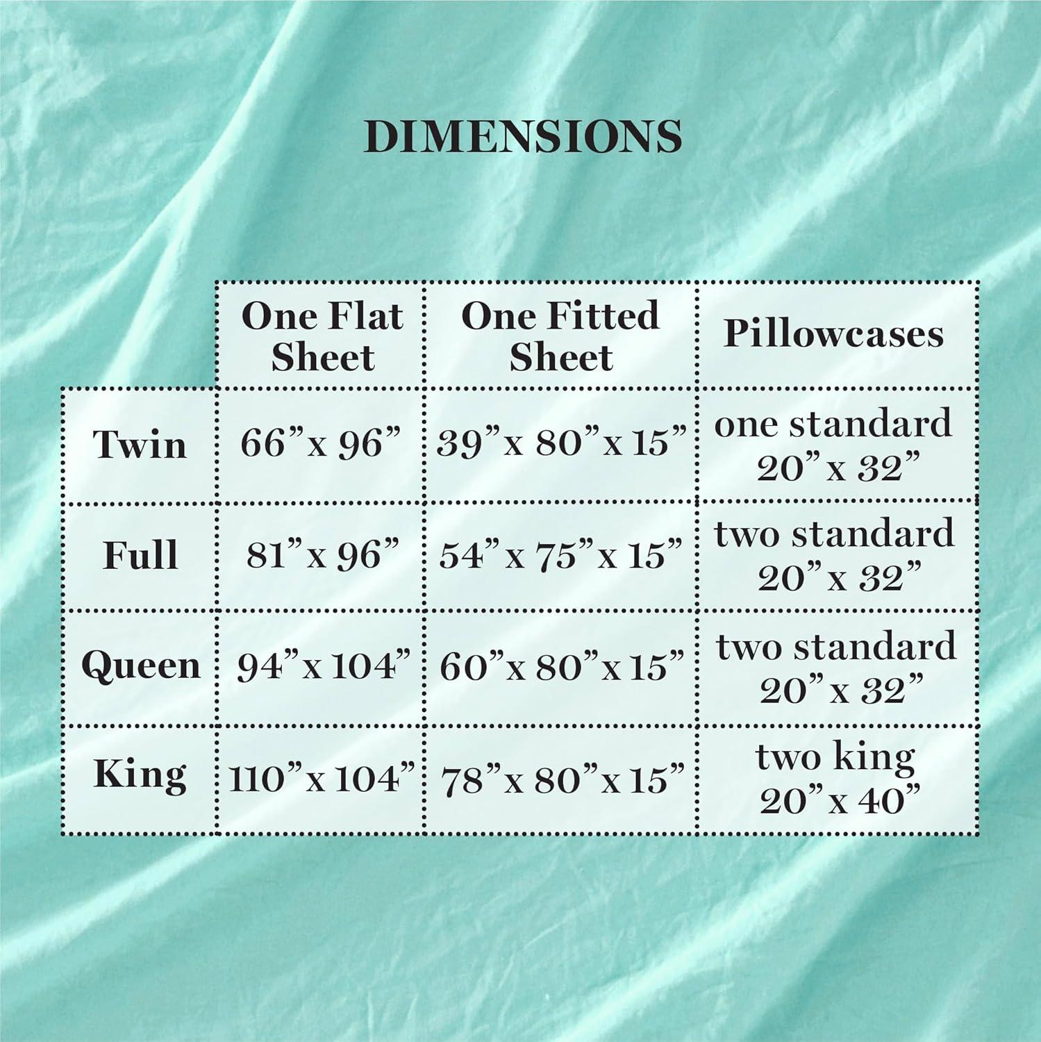 Queen Sheet Set Includes: 1 Flat Sheet (94in x 104in), 1 Fitted Sheet (60in x 80in x 15in), 2 Standard Pillowcases (20in x 32in)