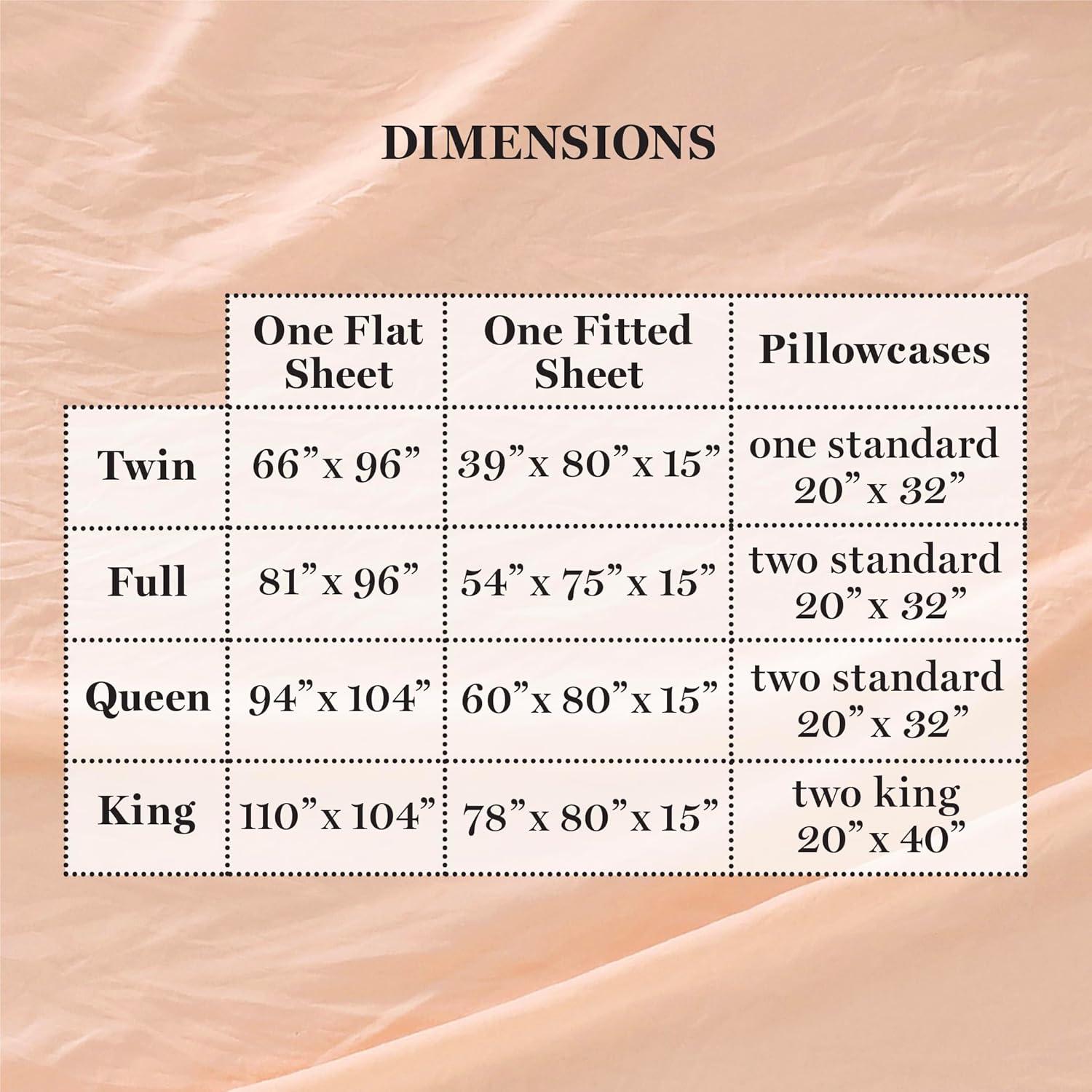 Queen Sheet Set Includes: 1 Flat Sheet (94in x 104in), 1 Fitted Sheet (60in x 80in x 15in), 2 Standard Pillowcases (20in x 32in)