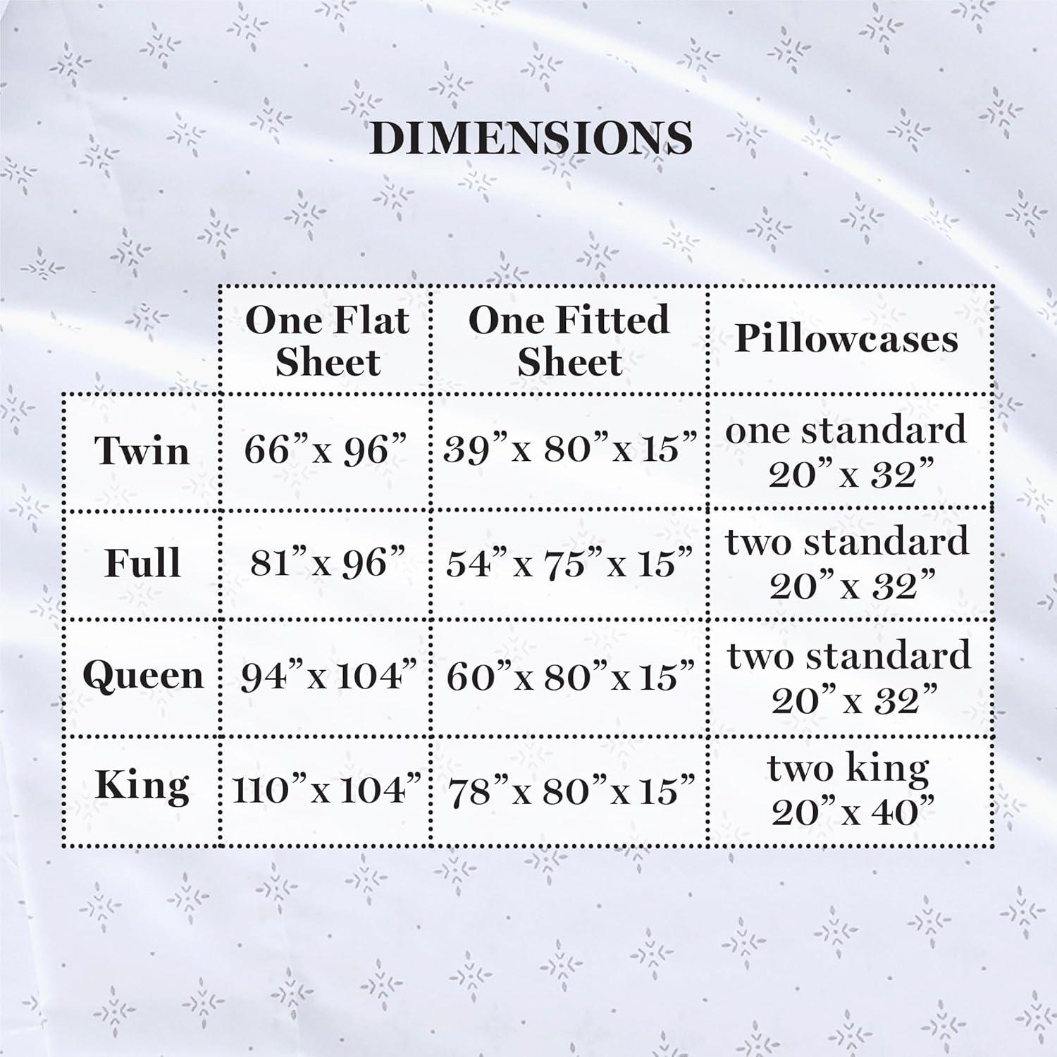Queen Sheet Set Includes: 1 Flat Sheet (94in x 104in), 1 Fitted Sheet (60in x 80in x 15in), 2 Standard Pillowcases (20in x 32in)